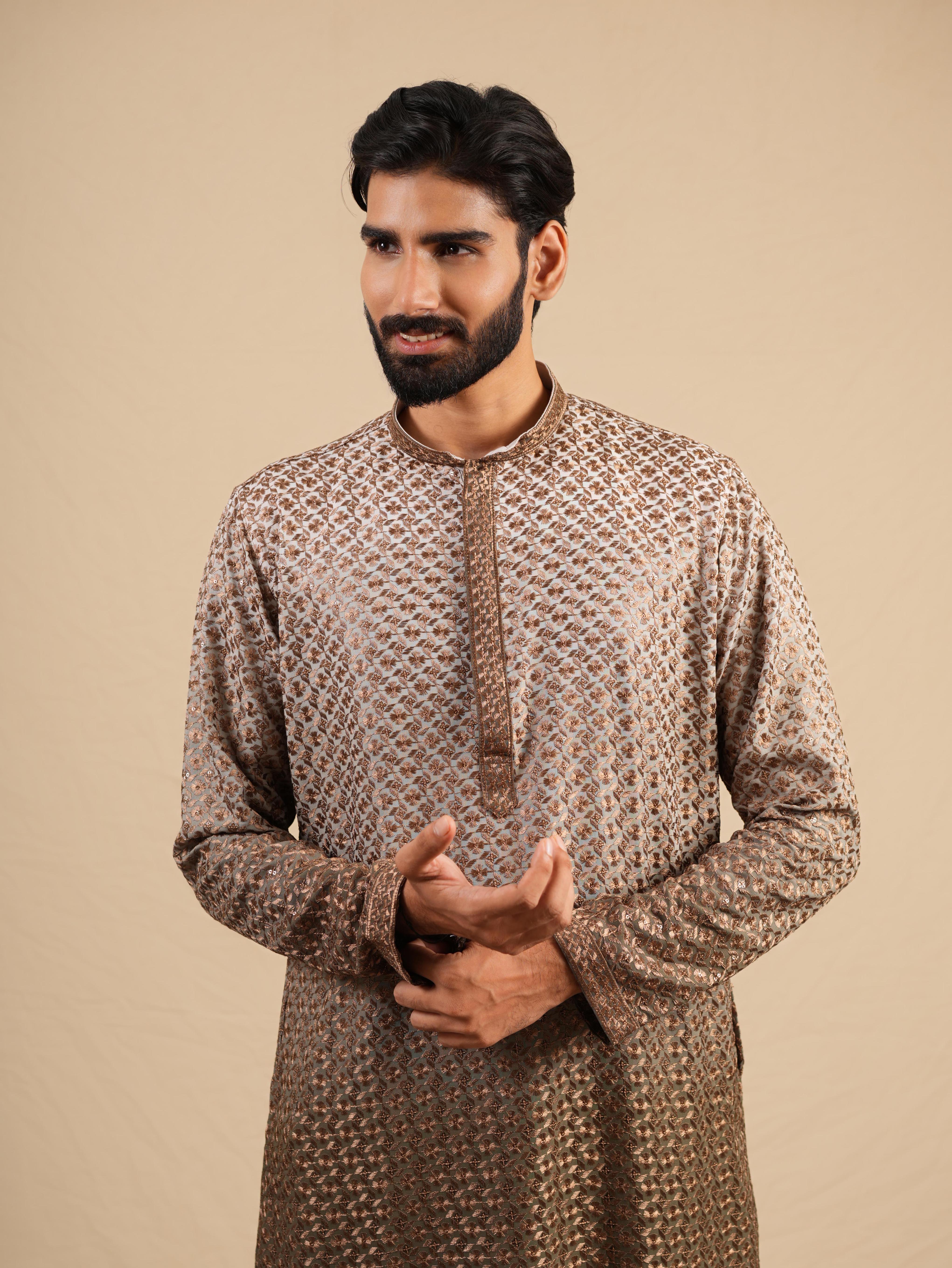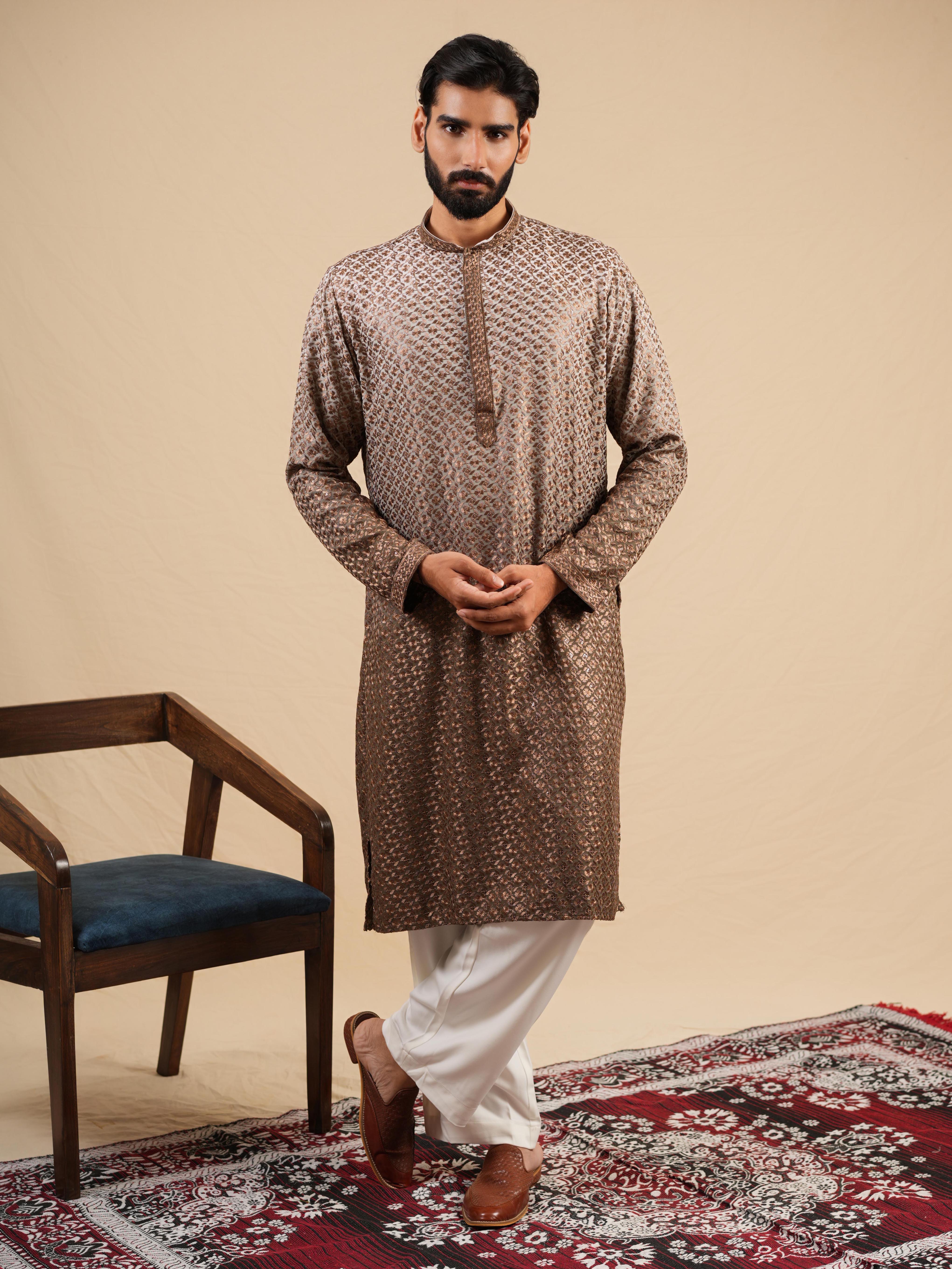 Description: Elevate your festive wardrobe with this Men's Brown Rayon Kurta Set, featuring a graceful ombre effect enhanced with sequins and thread work embroidery. Crafted from soft rayon fabric, this kurta offers a perfect balance of comfort and style. Designed with a mandarin collar, full sleeves, and a knee-length straight silhouette with side slits, it blends traditional charm with modern elegance. Paired with a matching bottom (pajama or parallel), this set is an excellent choice for festive celebrations, weddings, and cultural occasions.