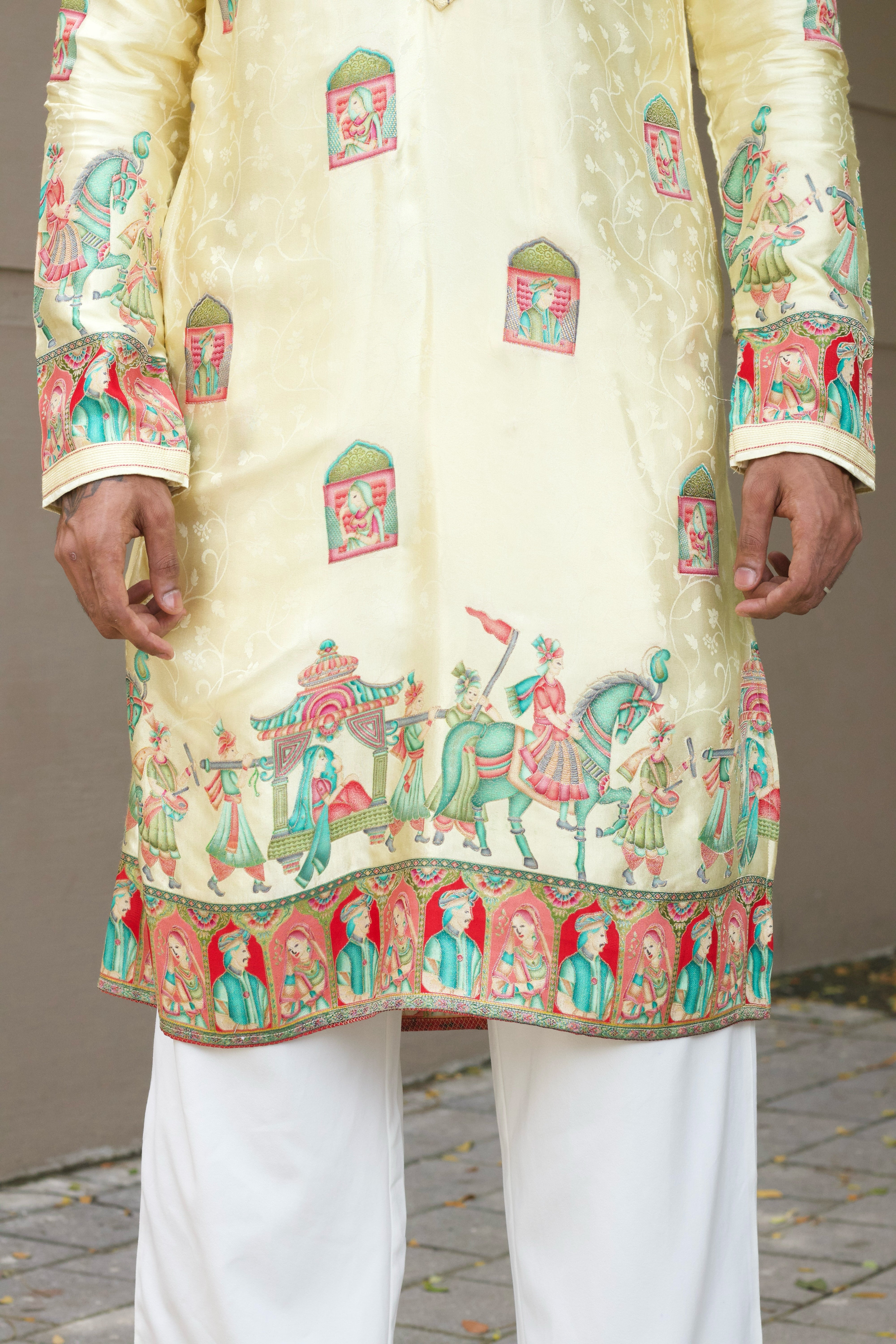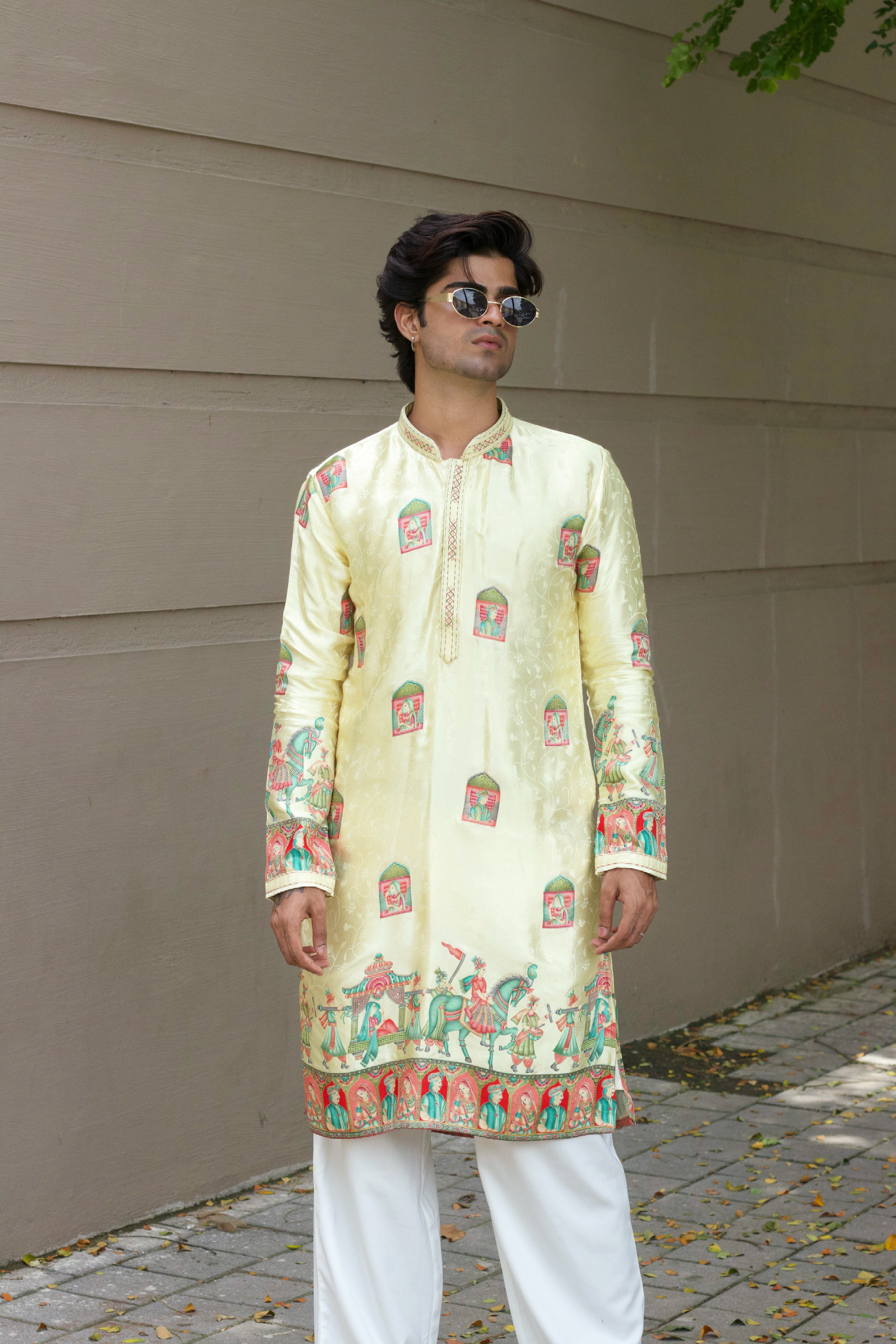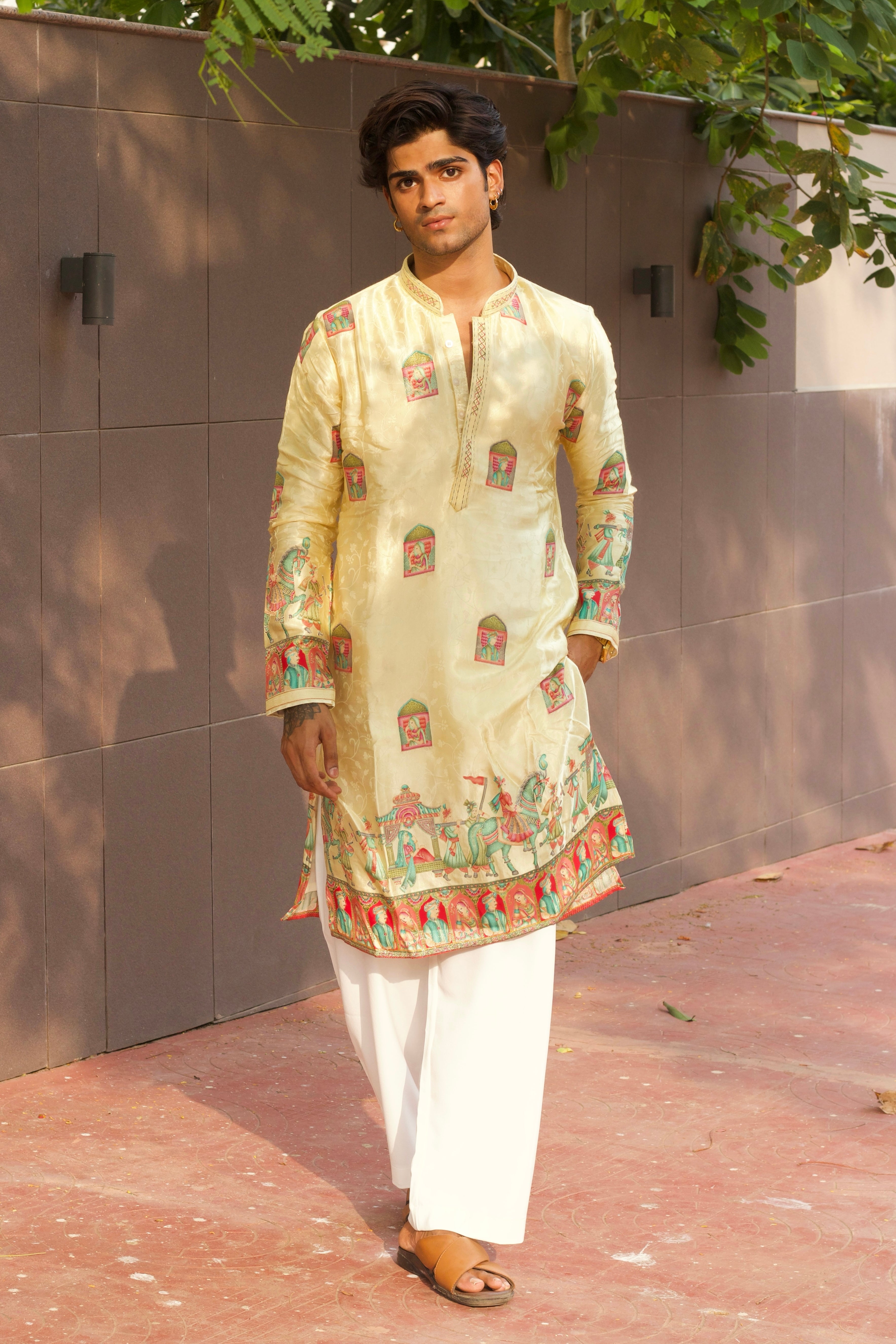 Step out in understated elegance with this Men's Cream Jacquard Silk Kurta Set. Crafted from luxurious jacquard silk fabric, this kurta features exquisite Swarovski stone work along the placket, adding a subtle sparkle that’s perfect for festive occasions and celebrations. The delicate print enhances the fabric’s rich texture, creating a look that is both refined and timeless.