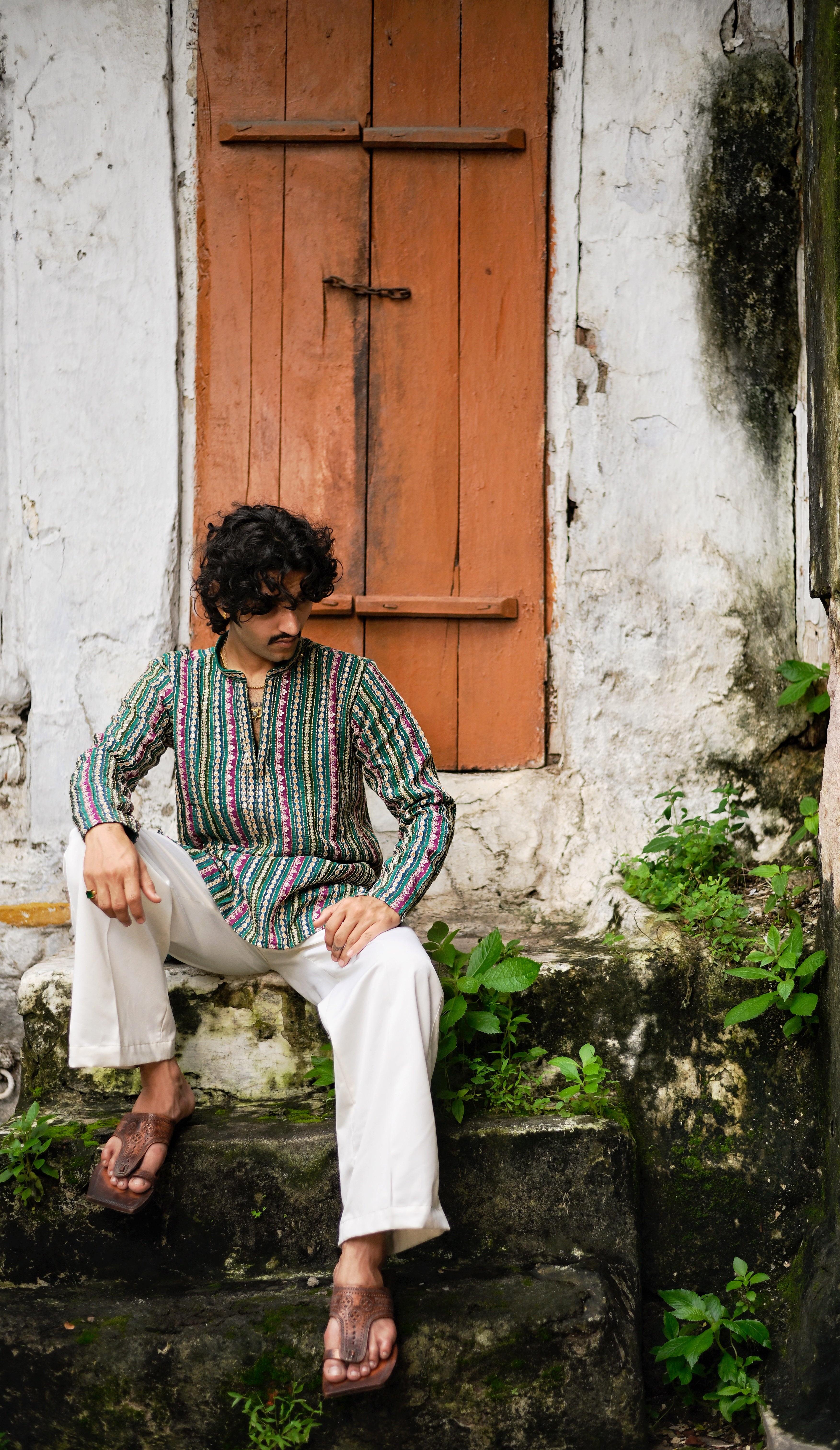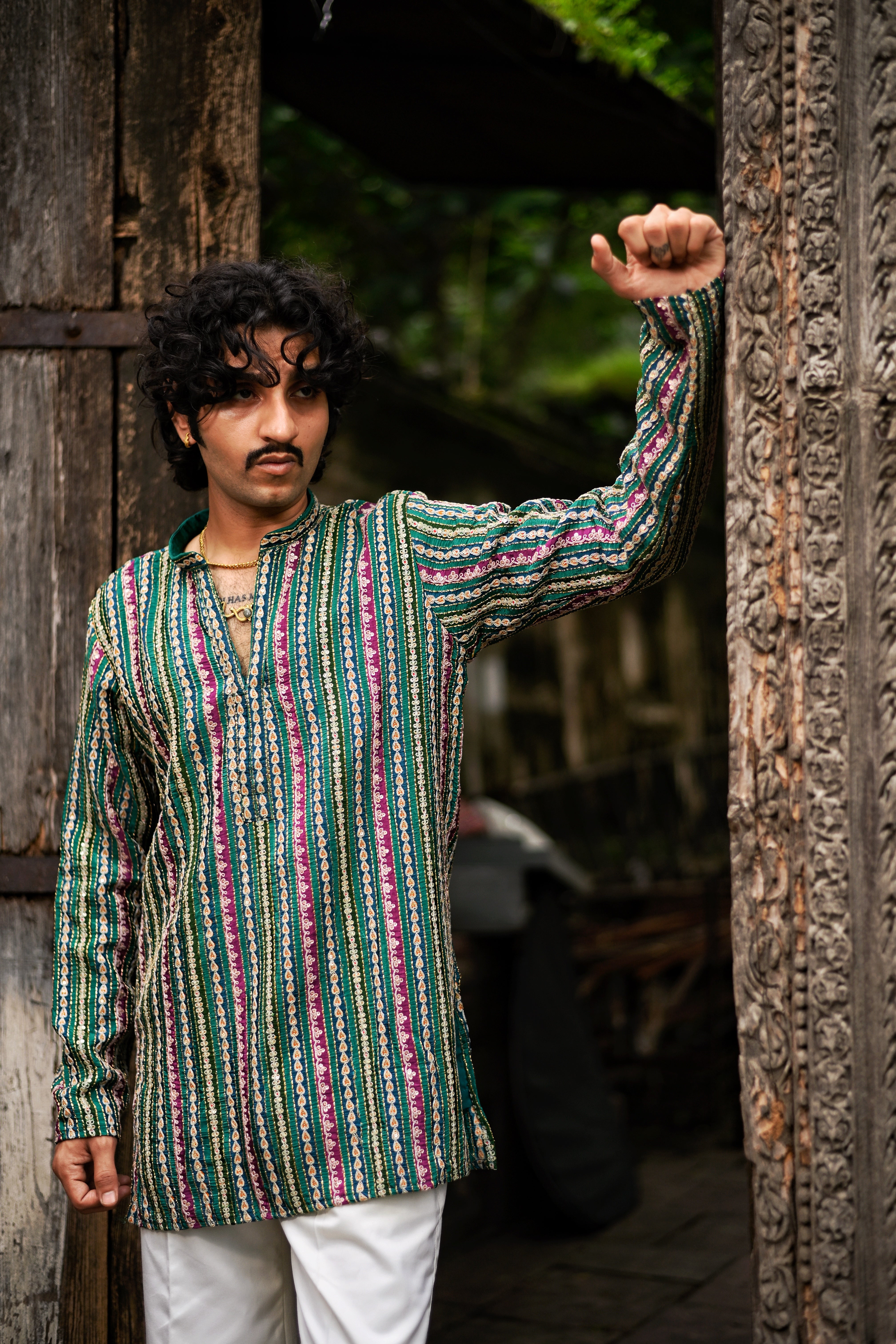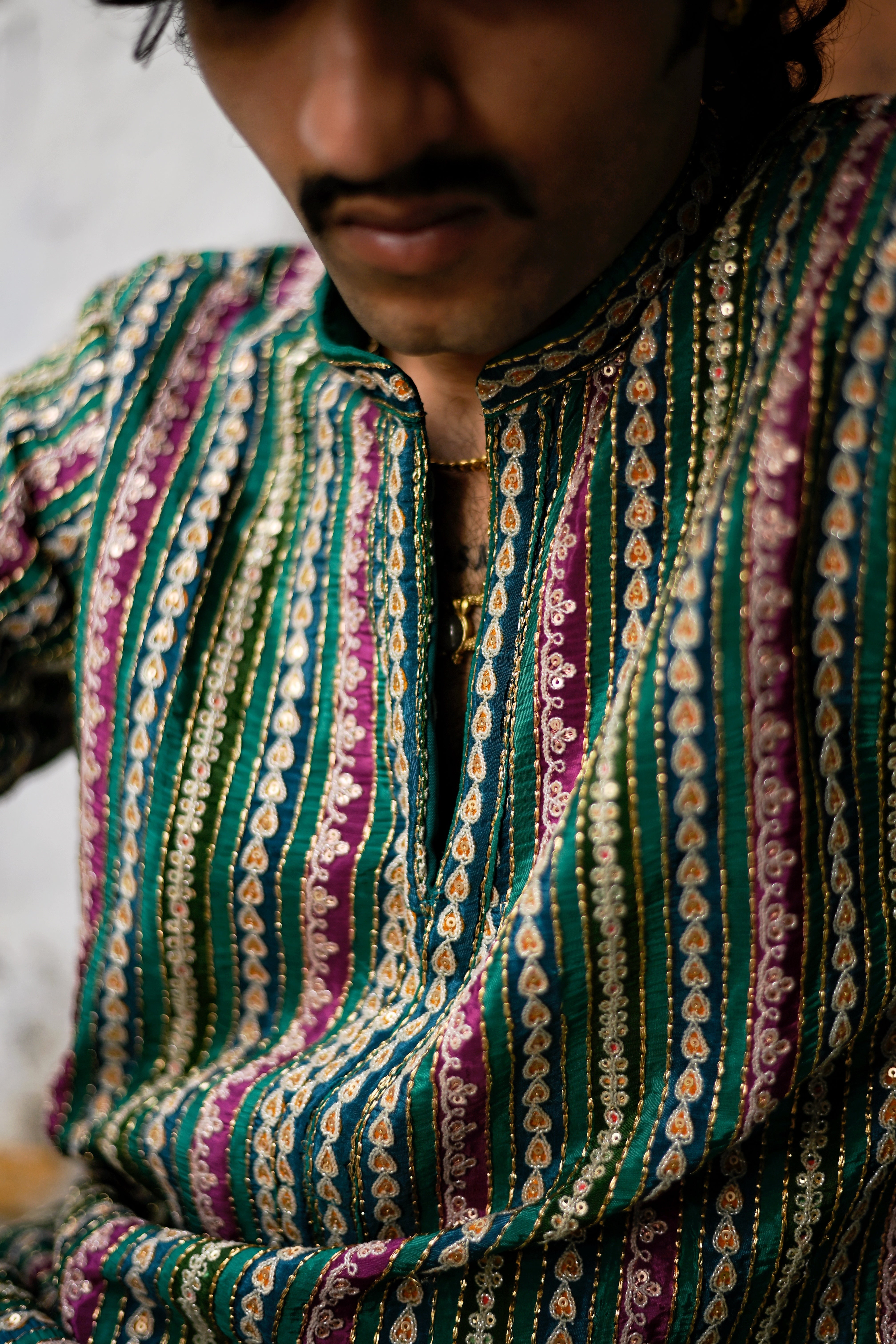 Description: Add regal elegance to your festive collection with this Men's Green Natural Crepe Kurta Set, designed with a luxurious blend of tradition and modern style. The kurta features a vibrant position print, enriched with intricate golden zari threadwork and detailed corded embroidery that exudes sophistication. Tailored with a mandarin collar, full sleeves, above-knee length, and side slits, it offers a graceful straight fit. Paired with matching bottoms (pajama or parallel), this set is perfect for weddings, cultural functions, and festive occasions.