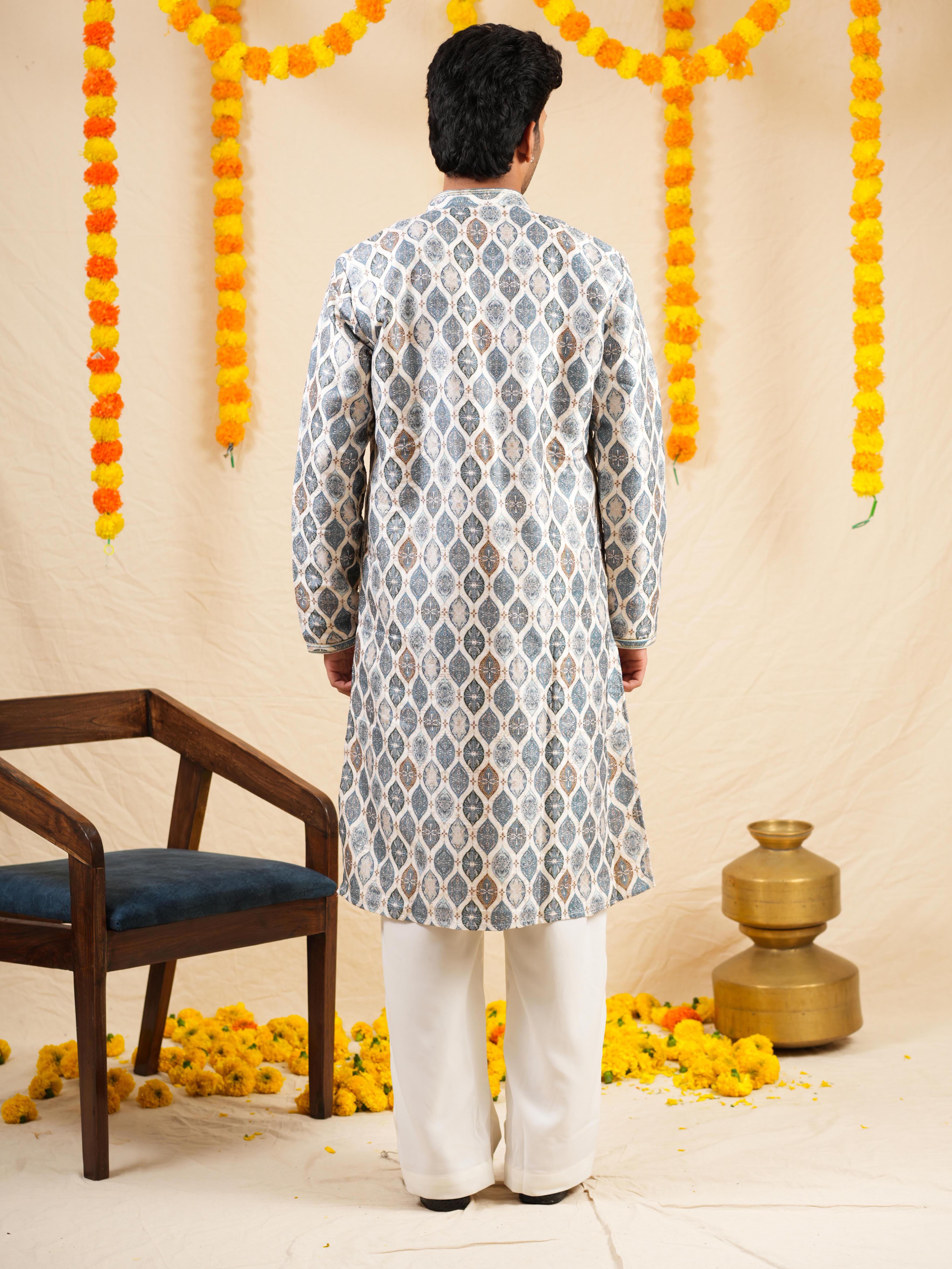 Description: Step into festive elegance with this Men's Multicolour Jacquard Kurta Set adorned with a vibrant digital print. Tailored from rich jacquard fabric, the kurta is elevated with pintex work and Swarovski detailing on the placket, giving it a luxurious and modern edge. Featuring a mandarin collar, full sleeves, knee-length silhouette, and side slits, it ensures a perfect balance of comfort and style. Paired with matching bottoms (pajama or parallel), this set is an excellent choice for weddings, festive celebrations, and cultural occasions.