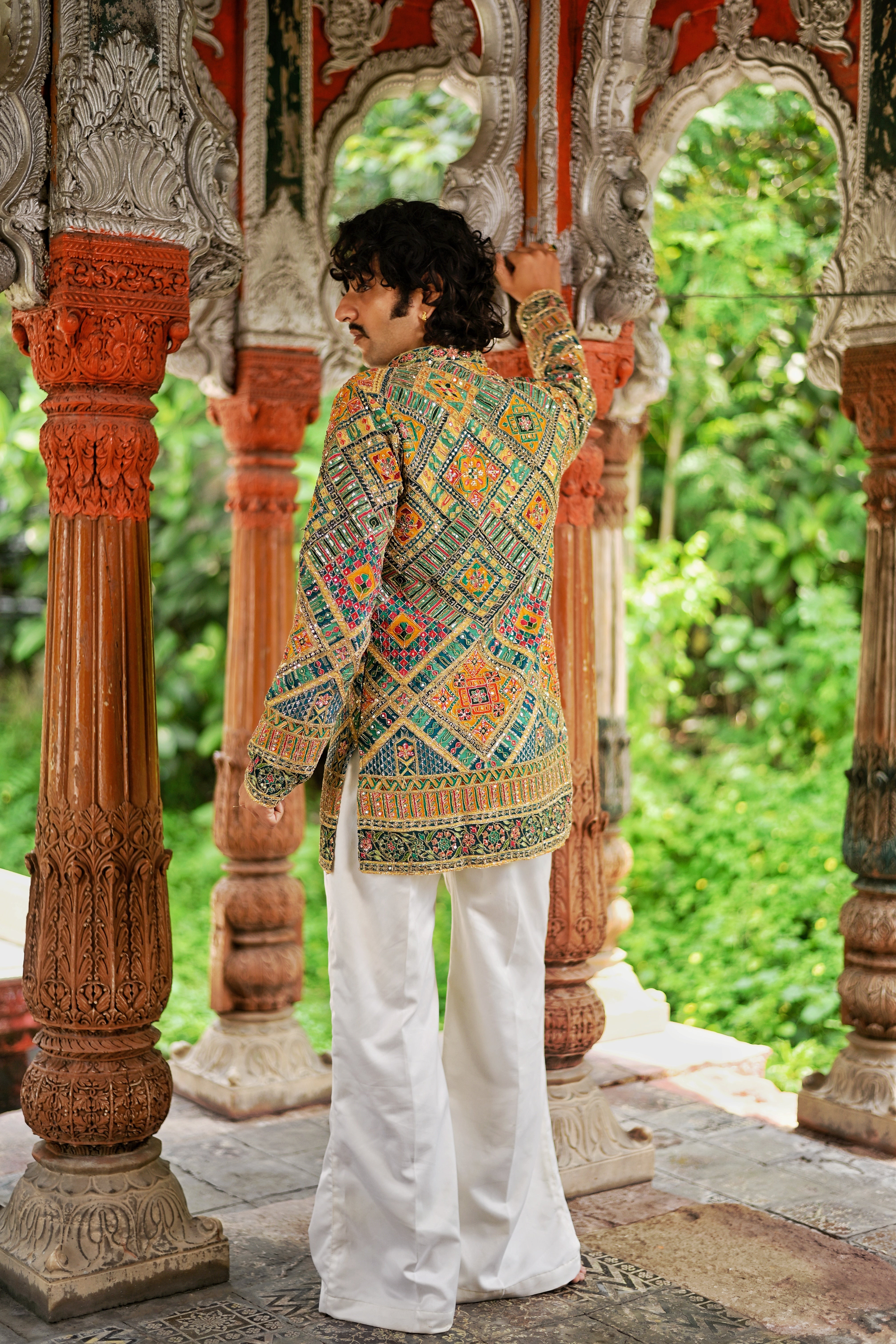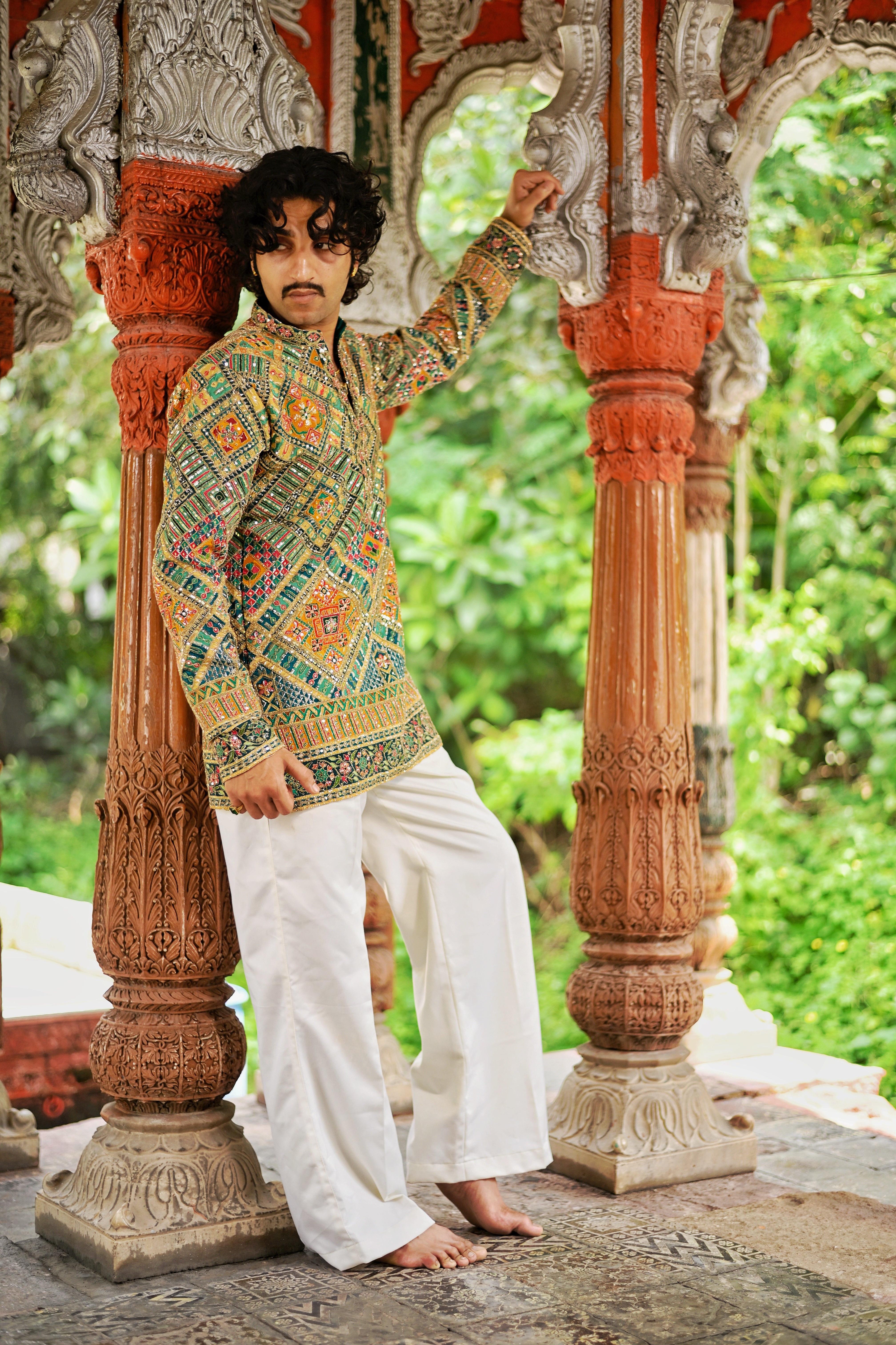 Description: Make a grand festive statement with this Men's Multicolour Natural Crepe Kurta Set, showcasing rich design and craftsmanship. The kurta is adorned with a striking position print, beautifully enhanced with heavy golden zari threadwork and intricate corded embroidery, adding a regal touch to your festive attire. Featuring a mandarin collar, full sleeves, above-knee length, and side slits, it offers a comfortable straight fit with a luxurious finish. Paired with matching bottoms (pajama or parallel), this set is perfect for weddings, festive gatherings, and cultural celebrations.