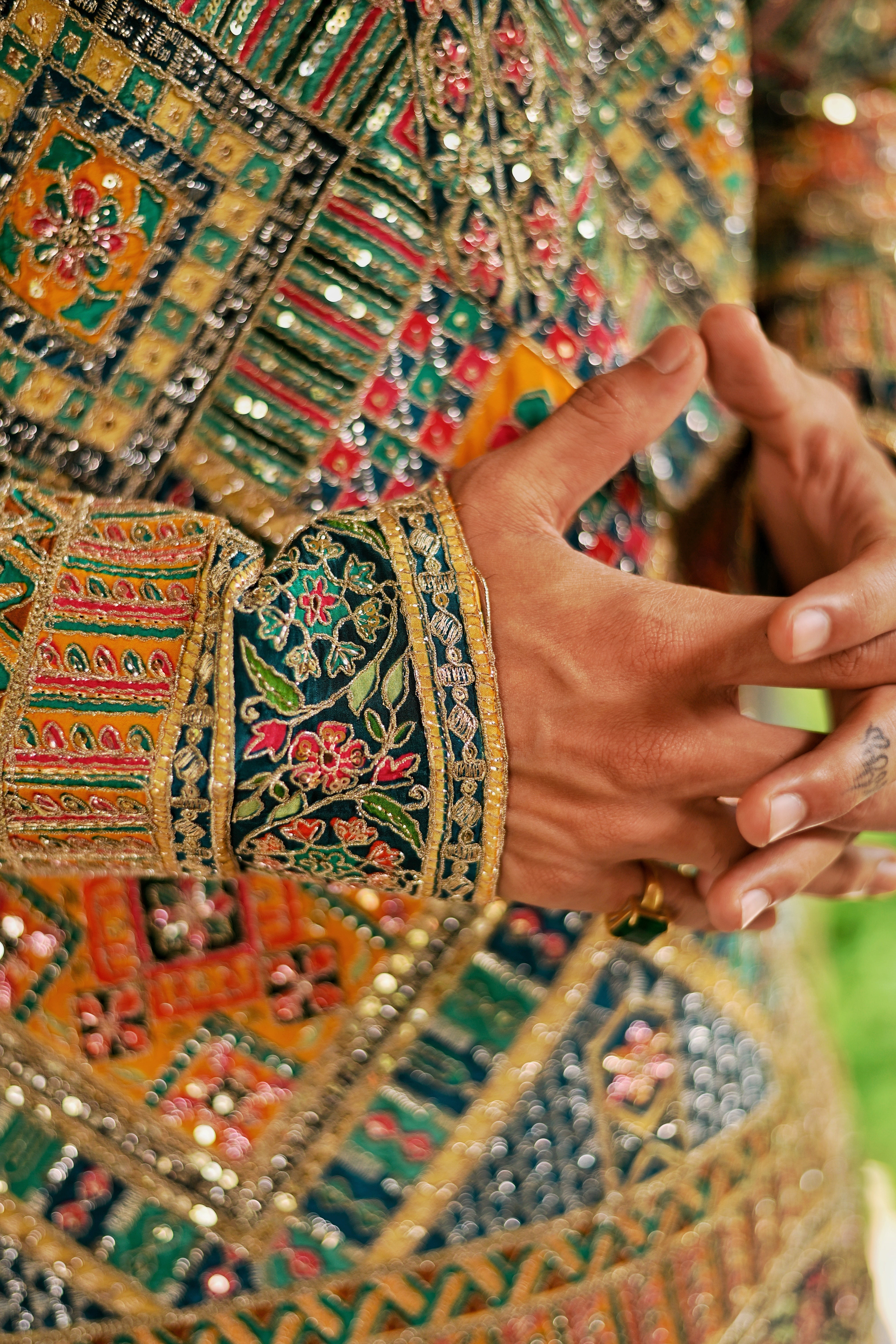 Ornamentation: Heavy Golden Zari Threadwork and Intricate Corded Embroidery