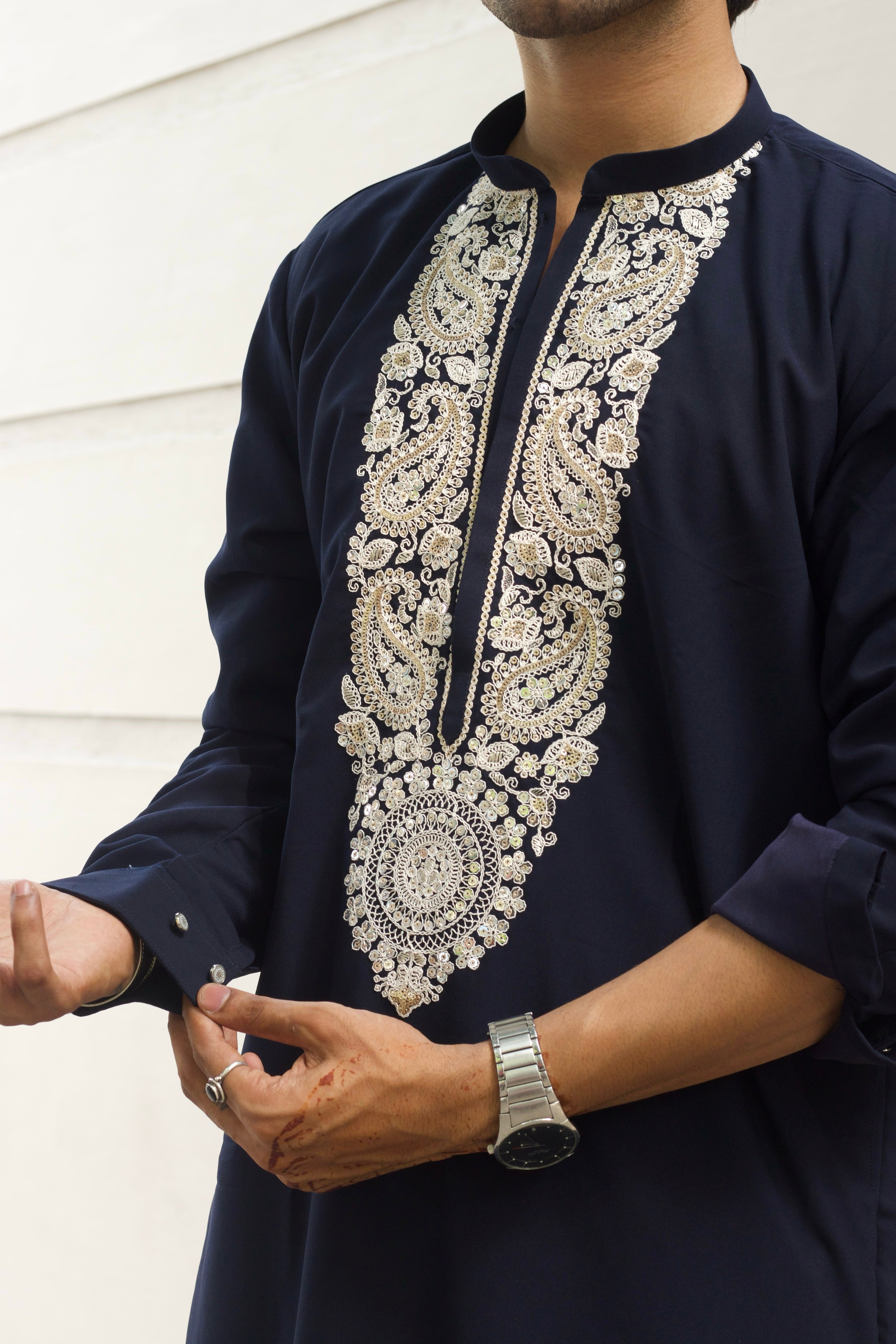 Make a bold and elegant impression with this Men's Navy Blue Kurta Set, crafted from premium Japanese fabric. The kurta features striking sequins and cording embroidery along the V-neck, giving it a refined festive sparkle that’s perfect for evening events, weddings, and celebrations.