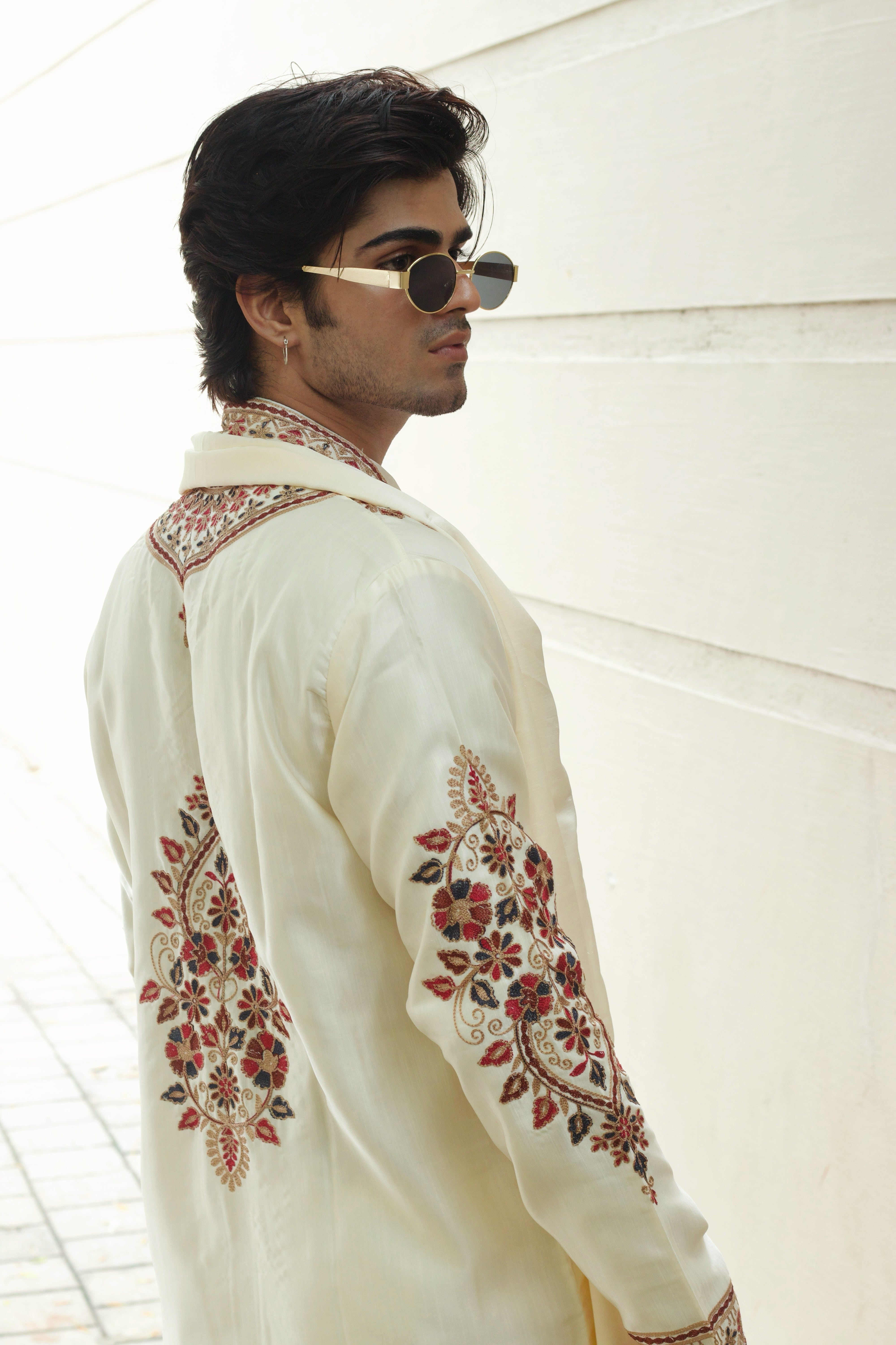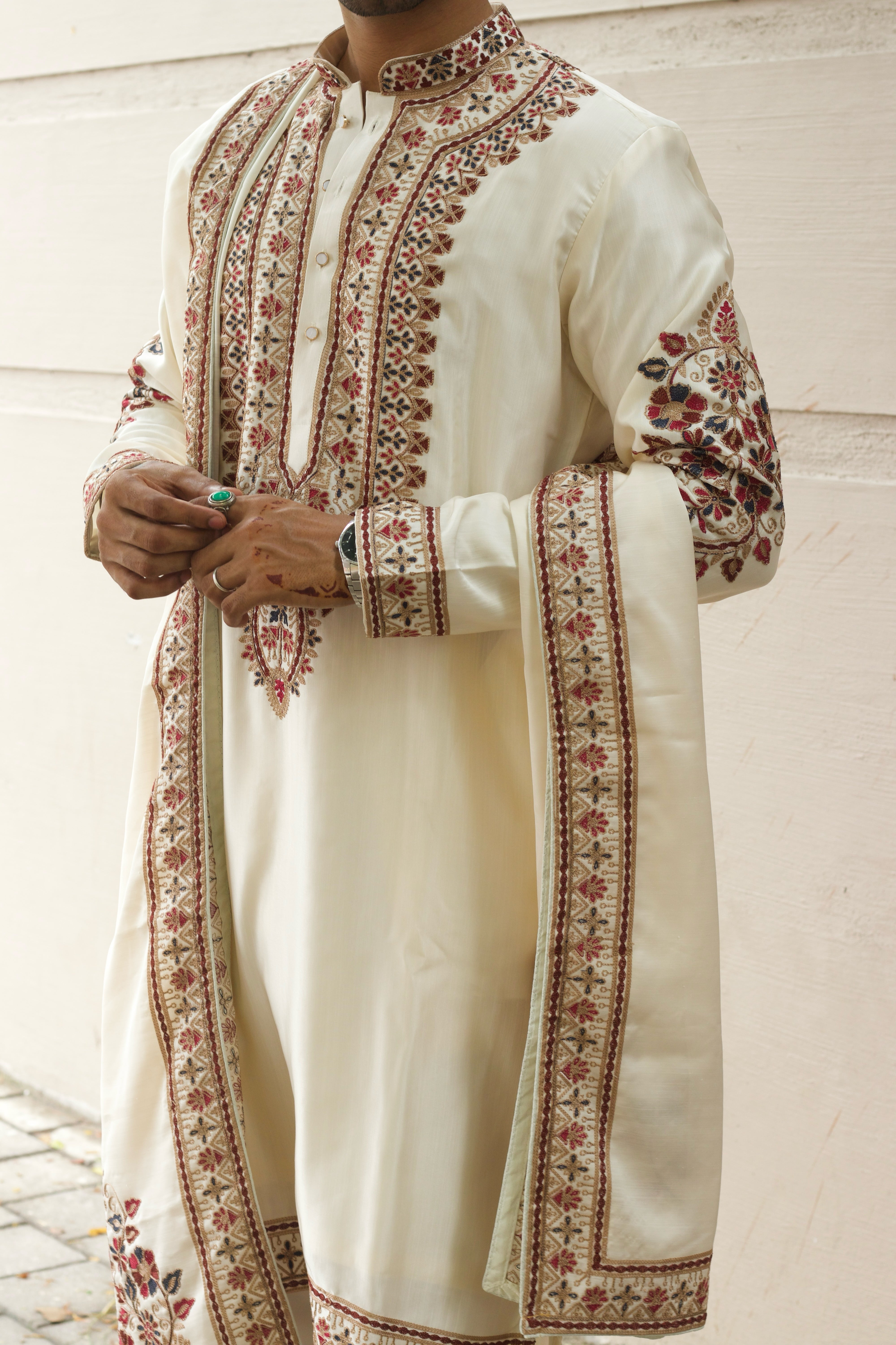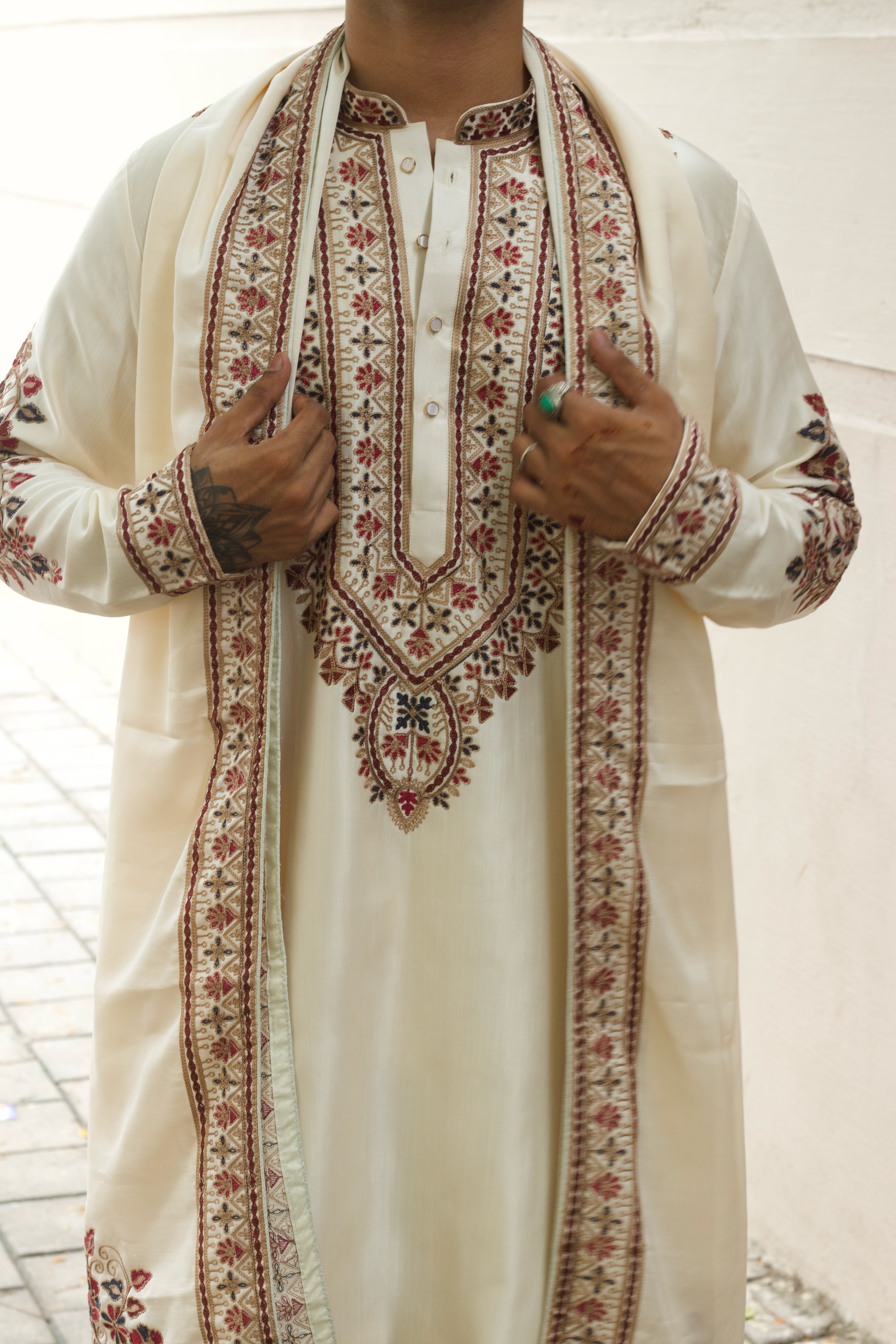 Step into the festive season with timeless style in this Men's Off-White Kurta Set. Made from premium Kenzo fabric, this elegant kurta features intricate thread work embroidery that adds a refined traditional touch. Complete with a matching bottom and a coordinated dupatta, this ensemble is perfect for weddings, festive gatherings, and cultural celebrations.