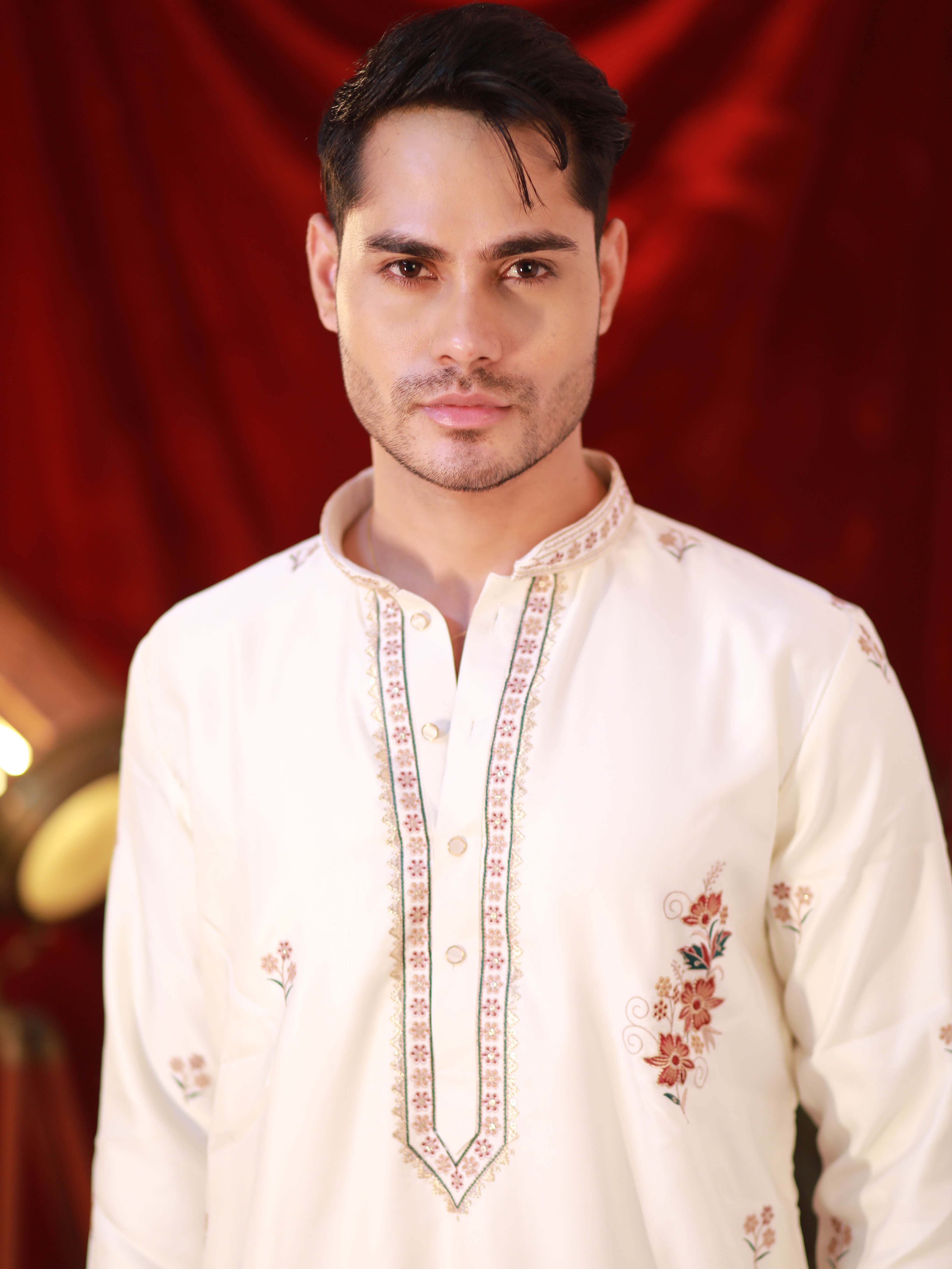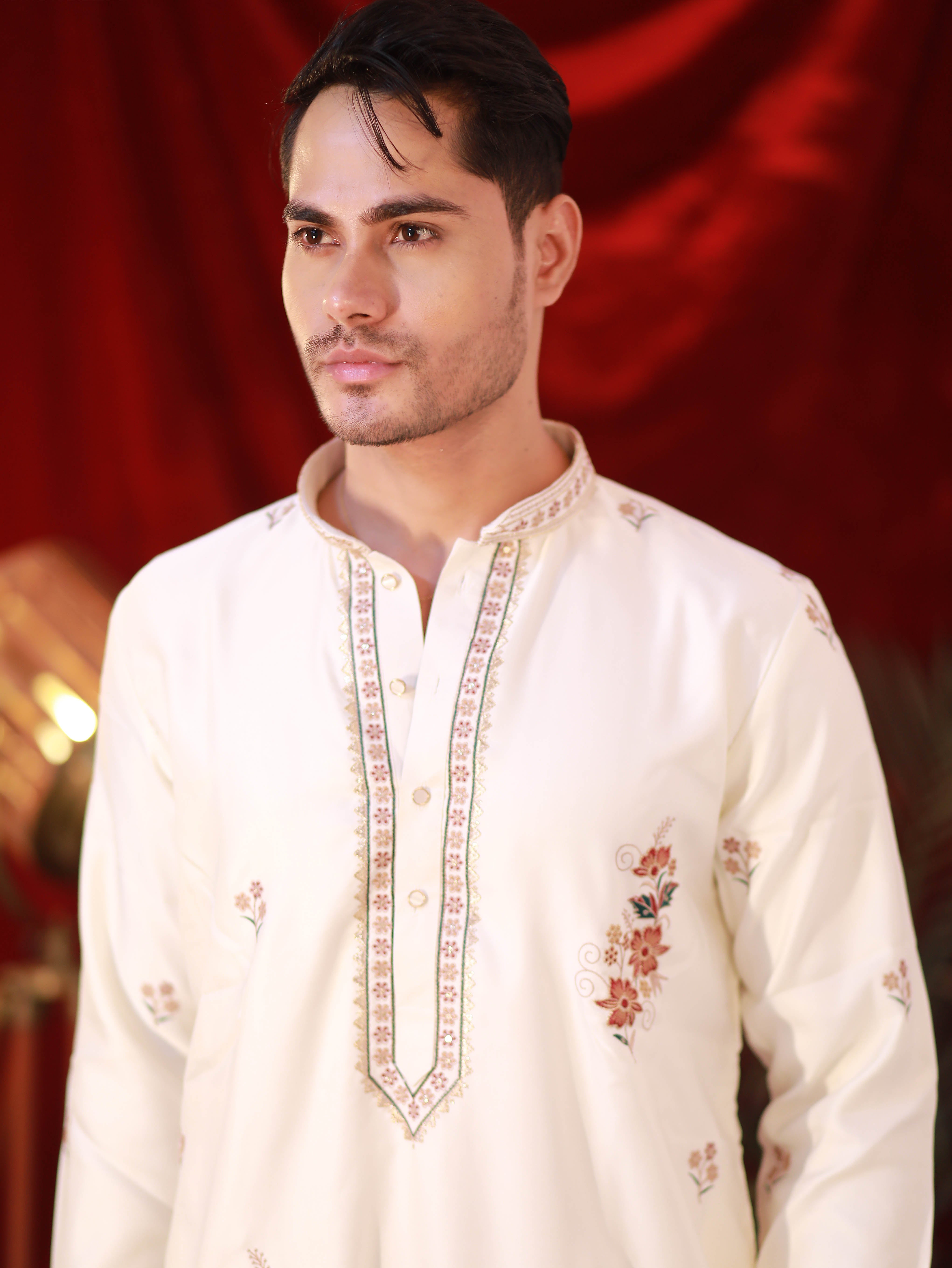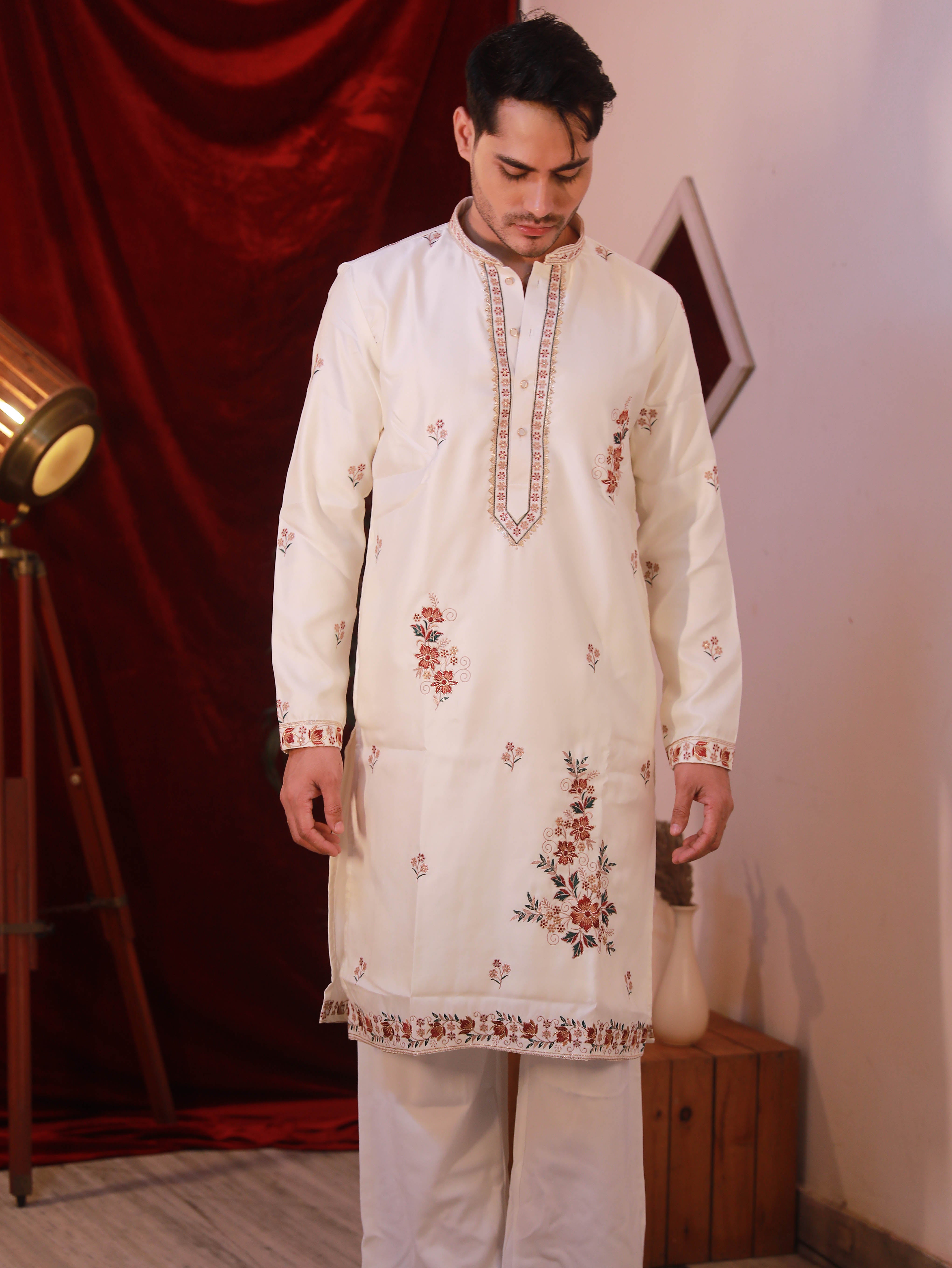 Description: Add timeless elegance to your festive wardrobe with this Men's Off-White Silk Kurta Set, adorned with delicate floral threadwork embroidery. Crafted from luxurious silk fabric, this kurta offers a smooth texture and refined appeal. Designed with a mandarin collar, full sleeves, knee-length silhouette, and side slits, it provides a graceful straight fit. Paired with a matching bottom, this set is an ideal choice for weddings, festive occasions, and cultural gatherings.