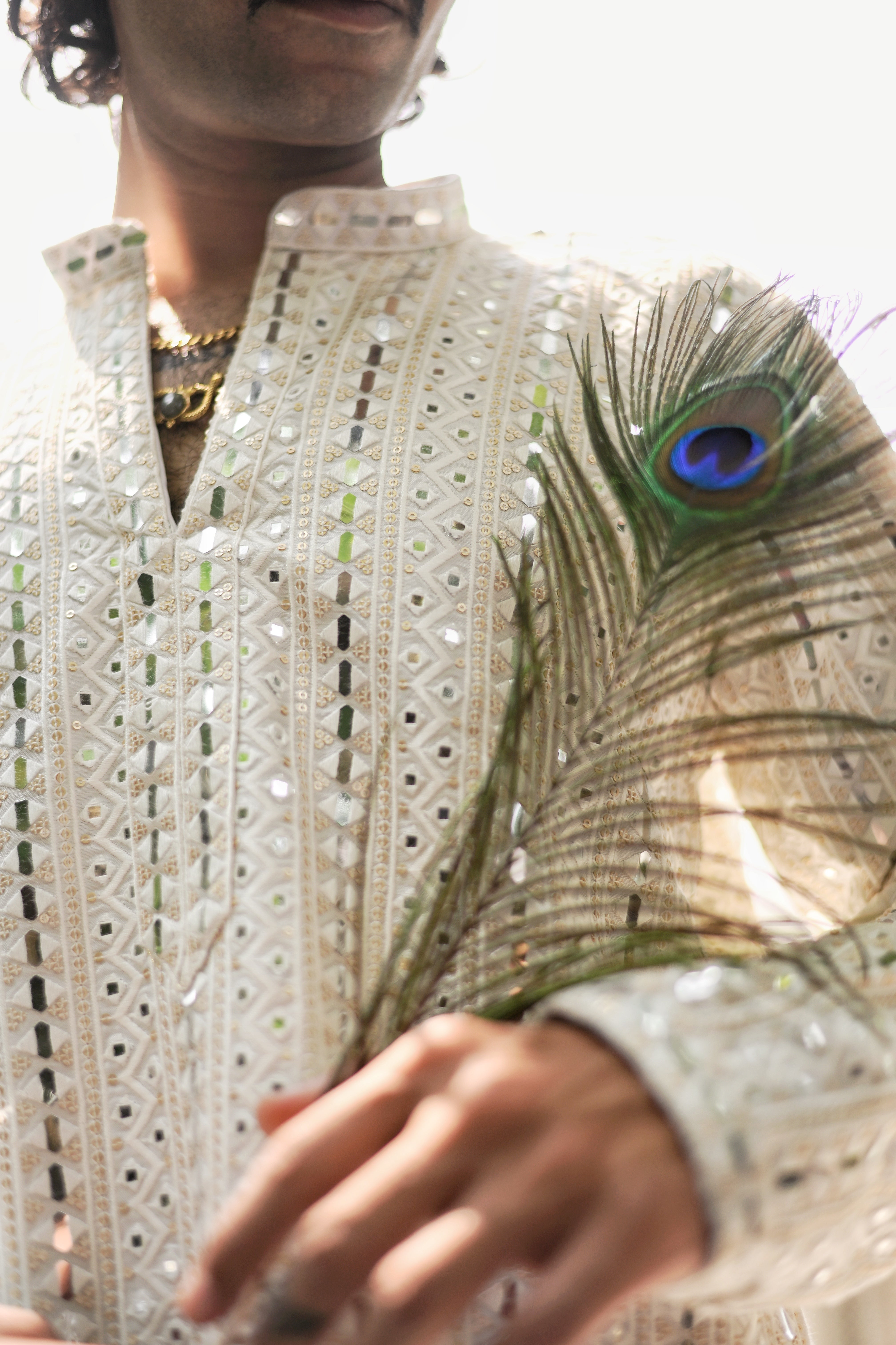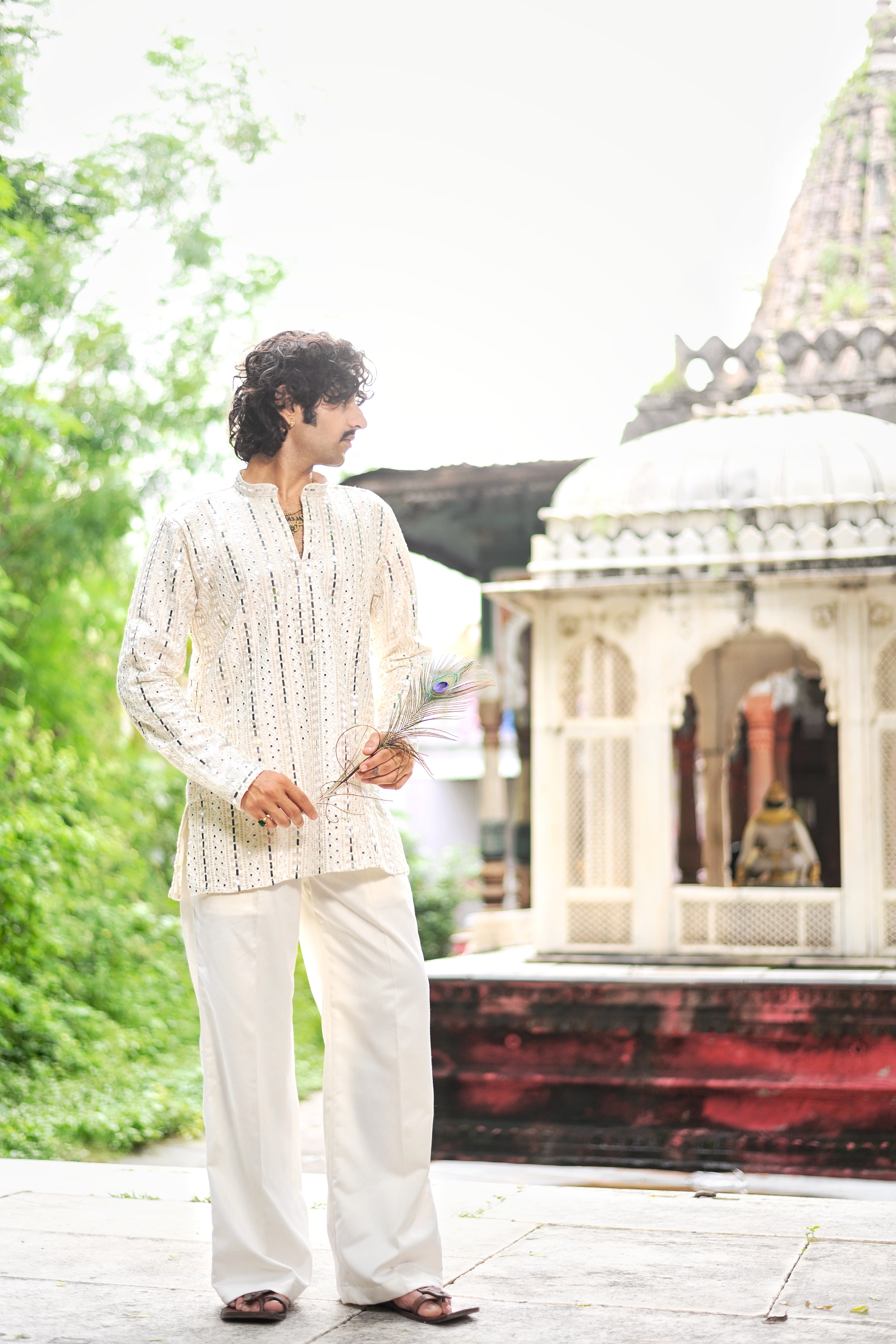 Description: Add a touch of elegance to your festive collection with this Men's Off-White Viscose Silk Kurta Set, beautifully adorned with sequins and mirror work embroidery. Crafted from rich viscose silk fabric, this kurta offers a luxurious sheen with intricate embellishments that make it stand out. Designed with a mandarin collar, full sleeves, above-knee length, and side slits, it provides a refined straight fit perfect for special occasions. Paired with matching bottoms (pajama or parallel), this set is an ideal choice for weddings, cultural gatherings, and festive celebrations.