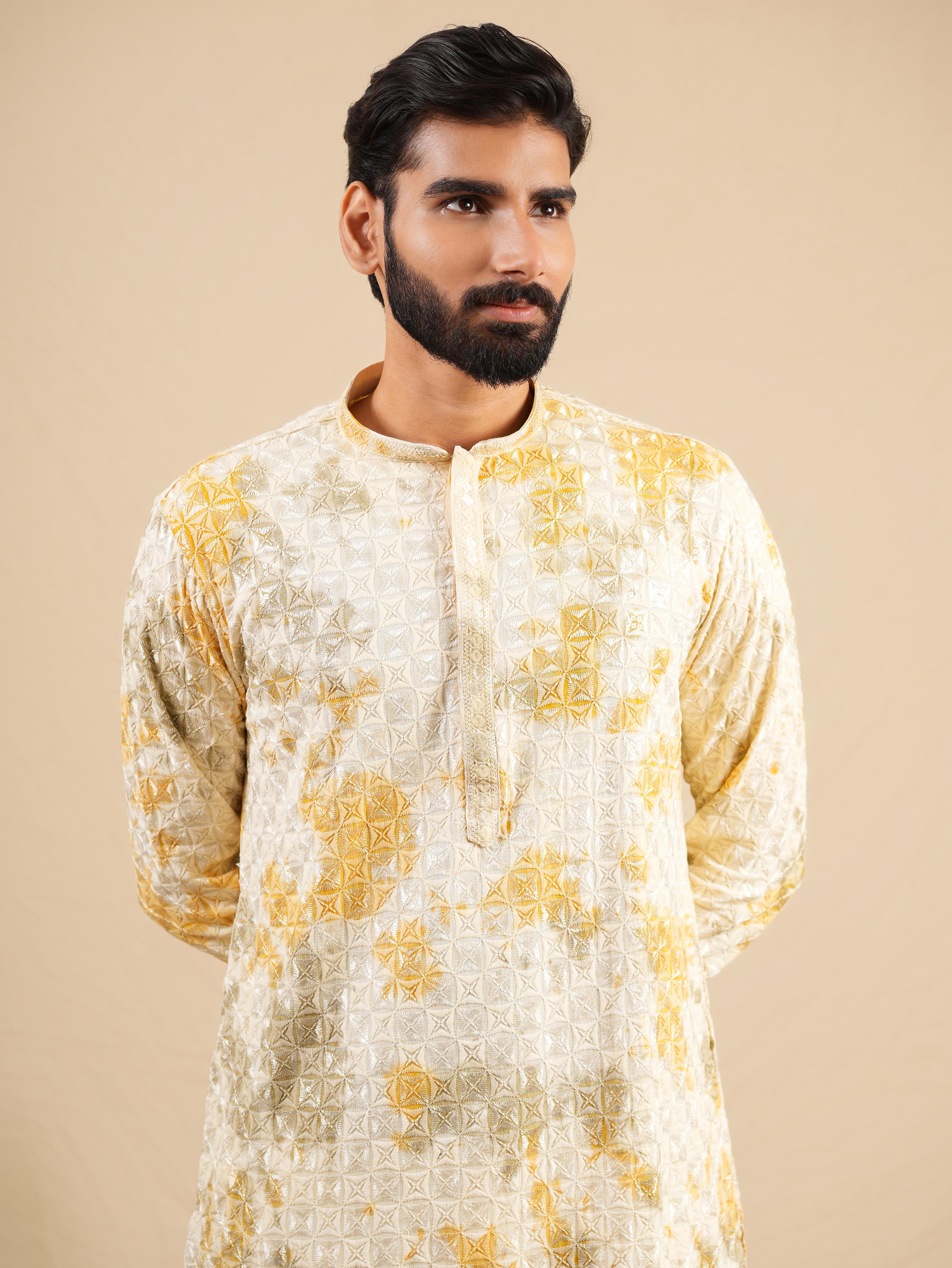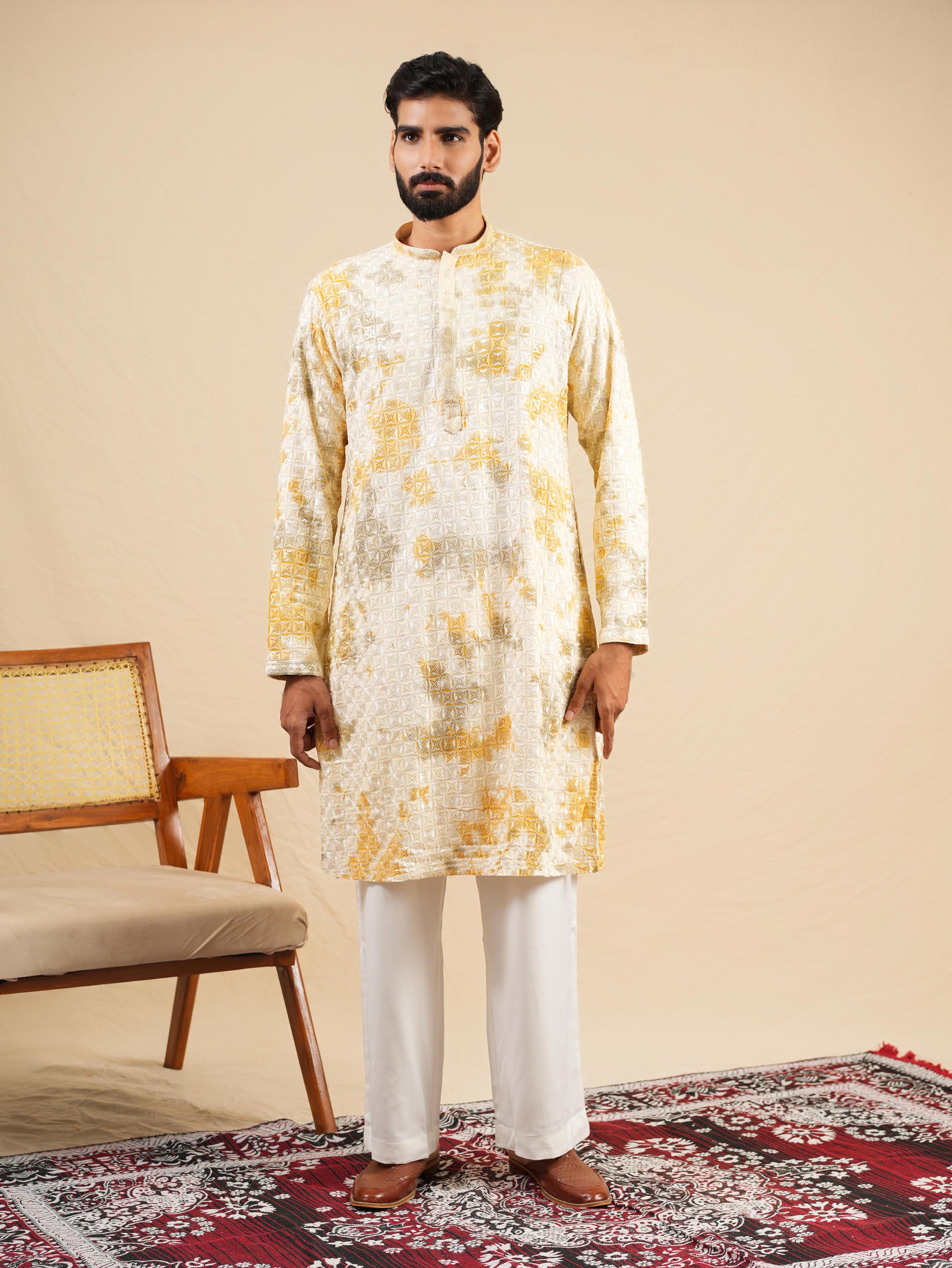 Description: Brighten your festive style with this Men's Off White & Yellow Rayon Kurta Set, highlighted with elegant threadwork embroidery. Crafted from lightweight and comfortable rayon fabric, this kurta offers a refined look with ease of wear. Featuring a mandarin collar, full sleeves, and a straight knee-length design with side slits, it blends traditional appeal with modern simplicity. Paired with matching bottoms (pajama or parallel), this set is a perfect choice for festive occasions, weddings, and cultural gatherings.