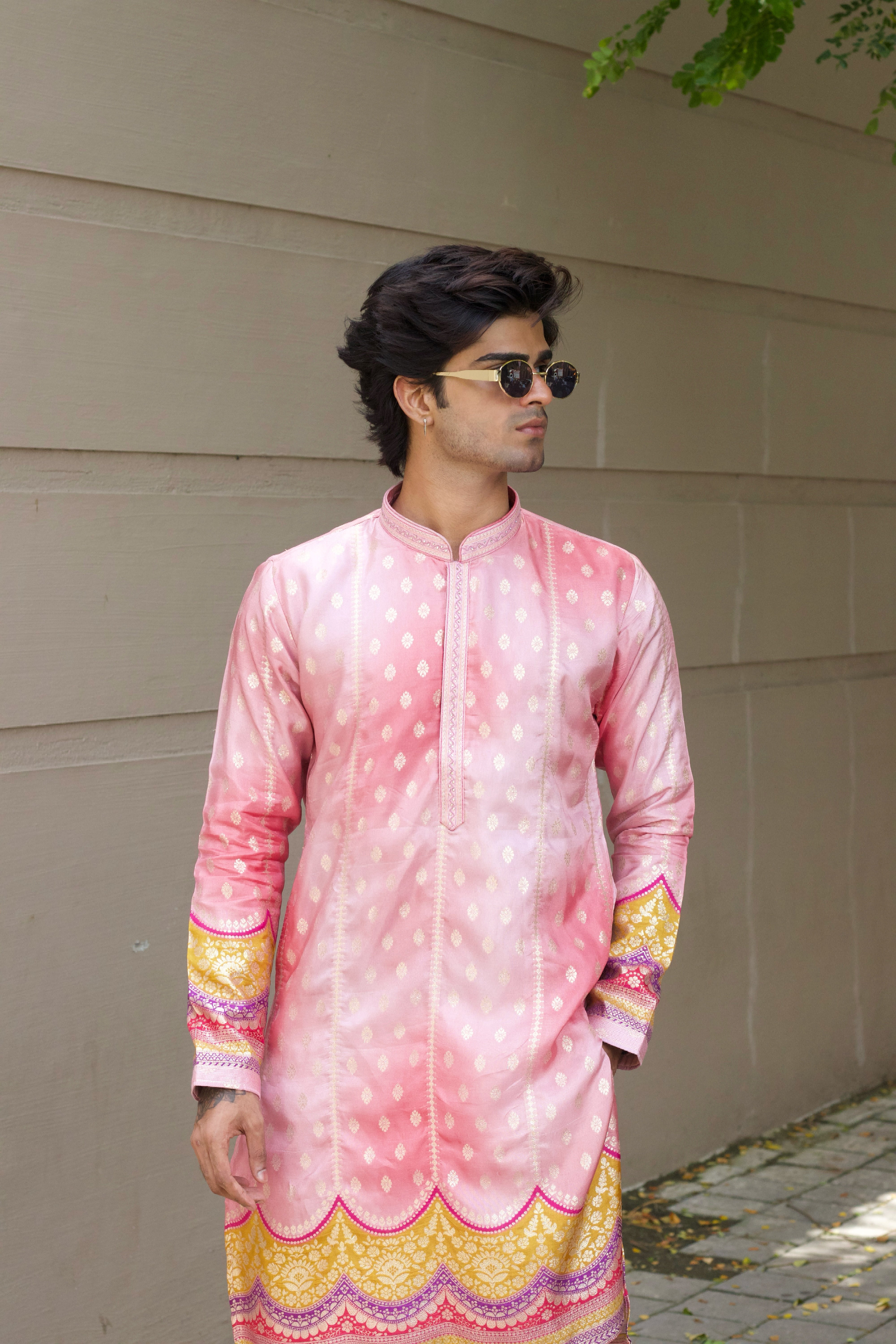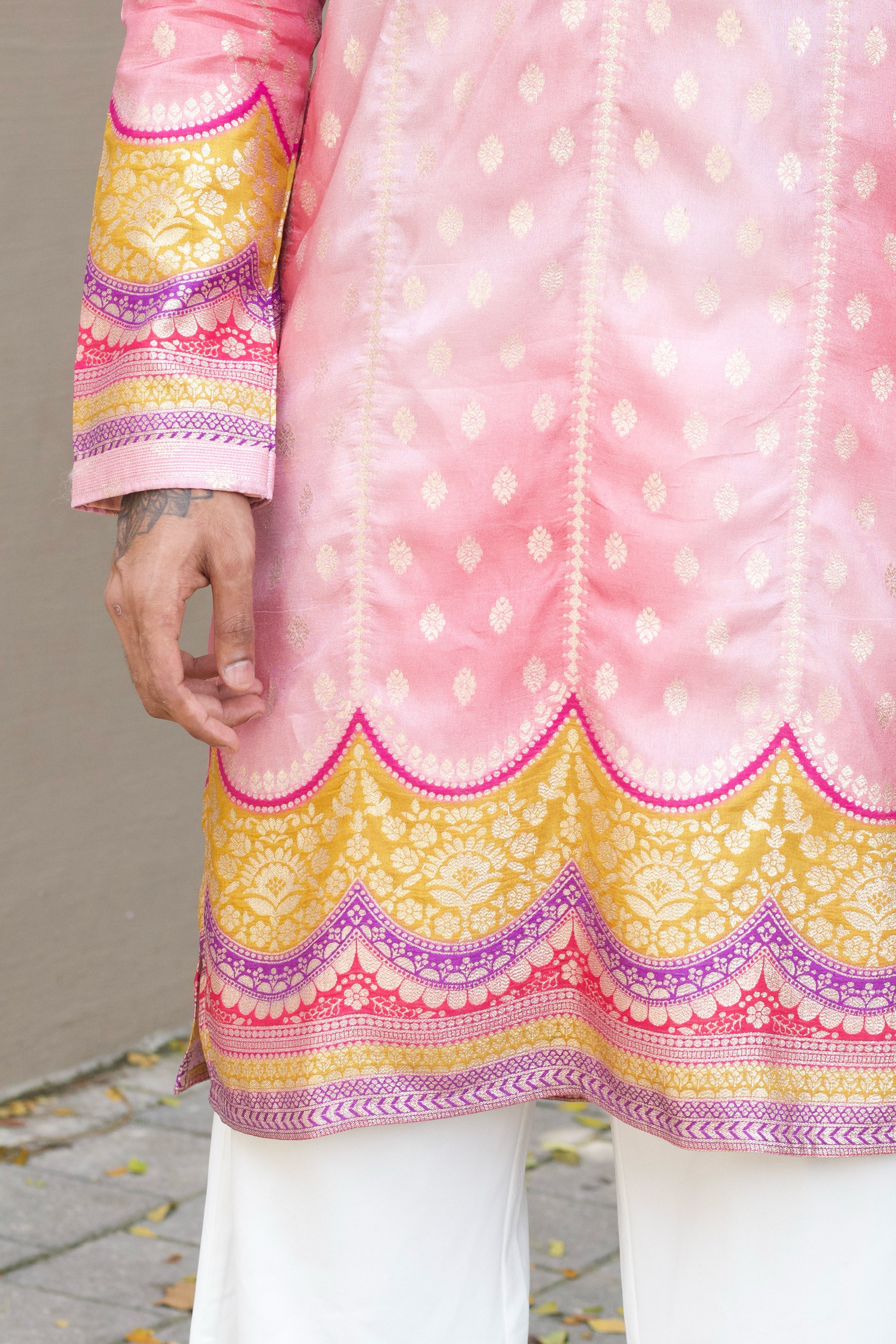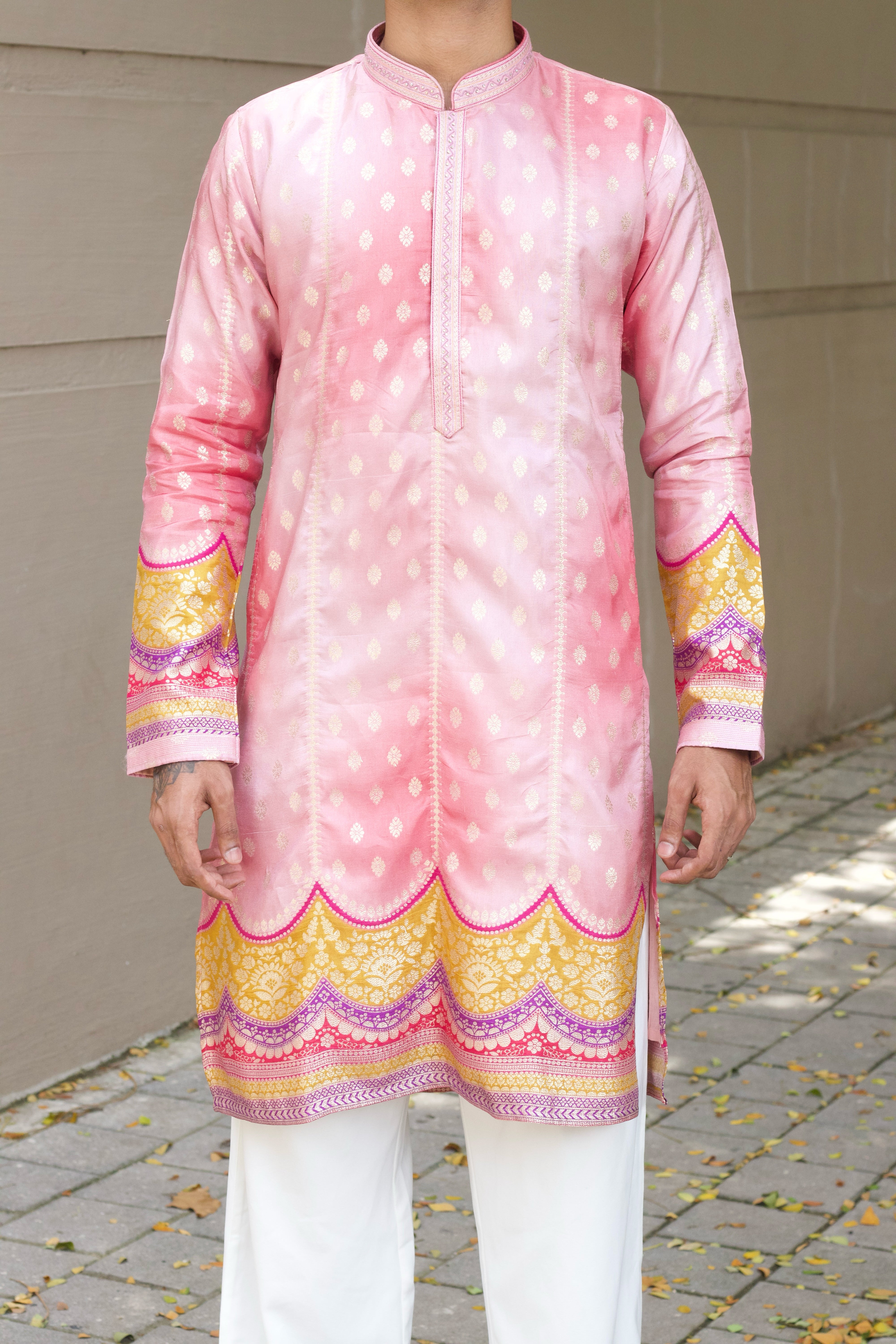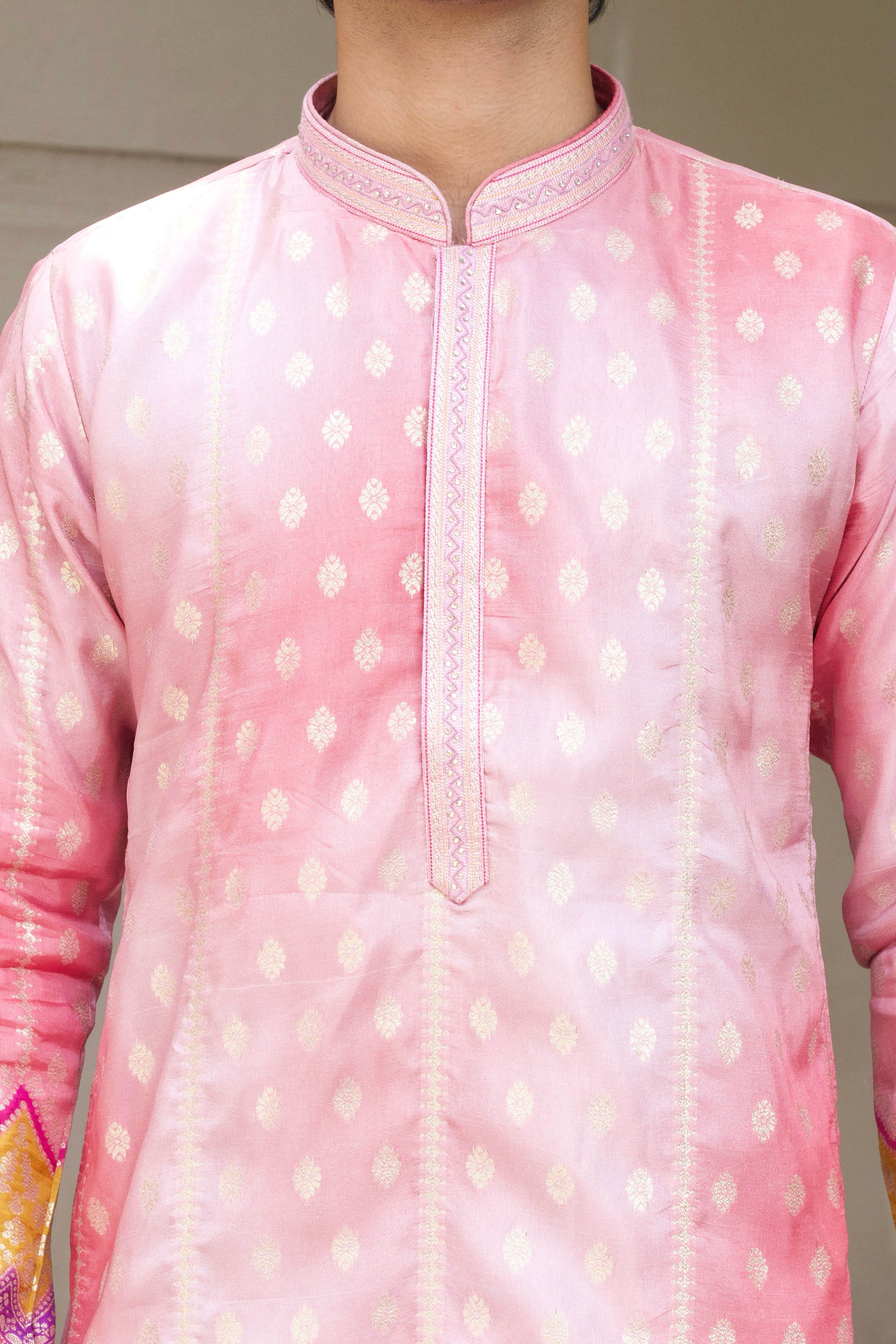 Celebrate the festive season in style with this Men's Pink Jacquard Kurta Set. Made from elegant jacquard fabric featuring a subtle position print, the kurta is enhanced with Swarovski stone work over the placket, adding a refined sparkle that catches the eye without overwhelming. Perfect for weddings, festive celebrations, and cultural occasions, this set blends tradition with contemporary flair.