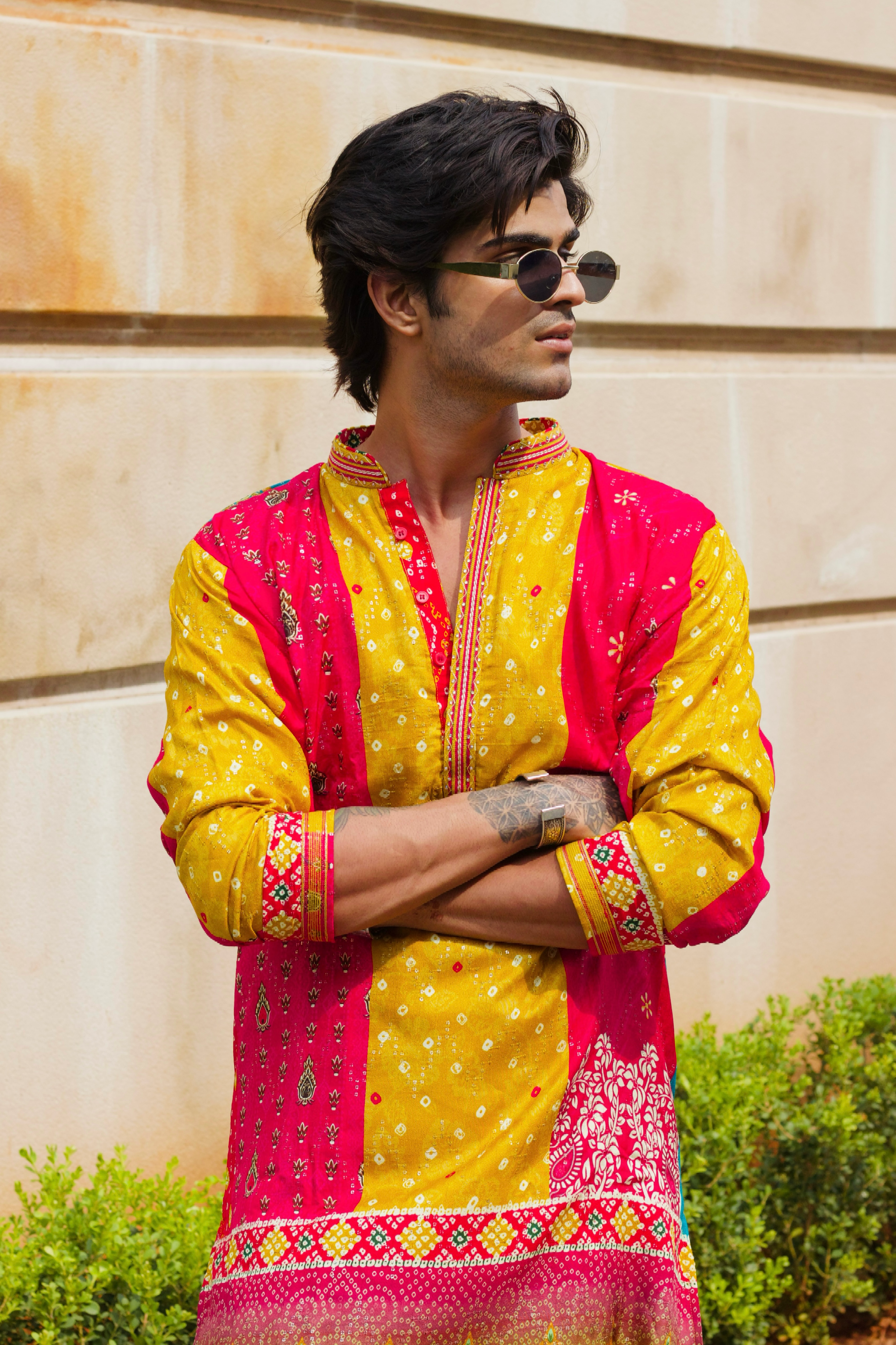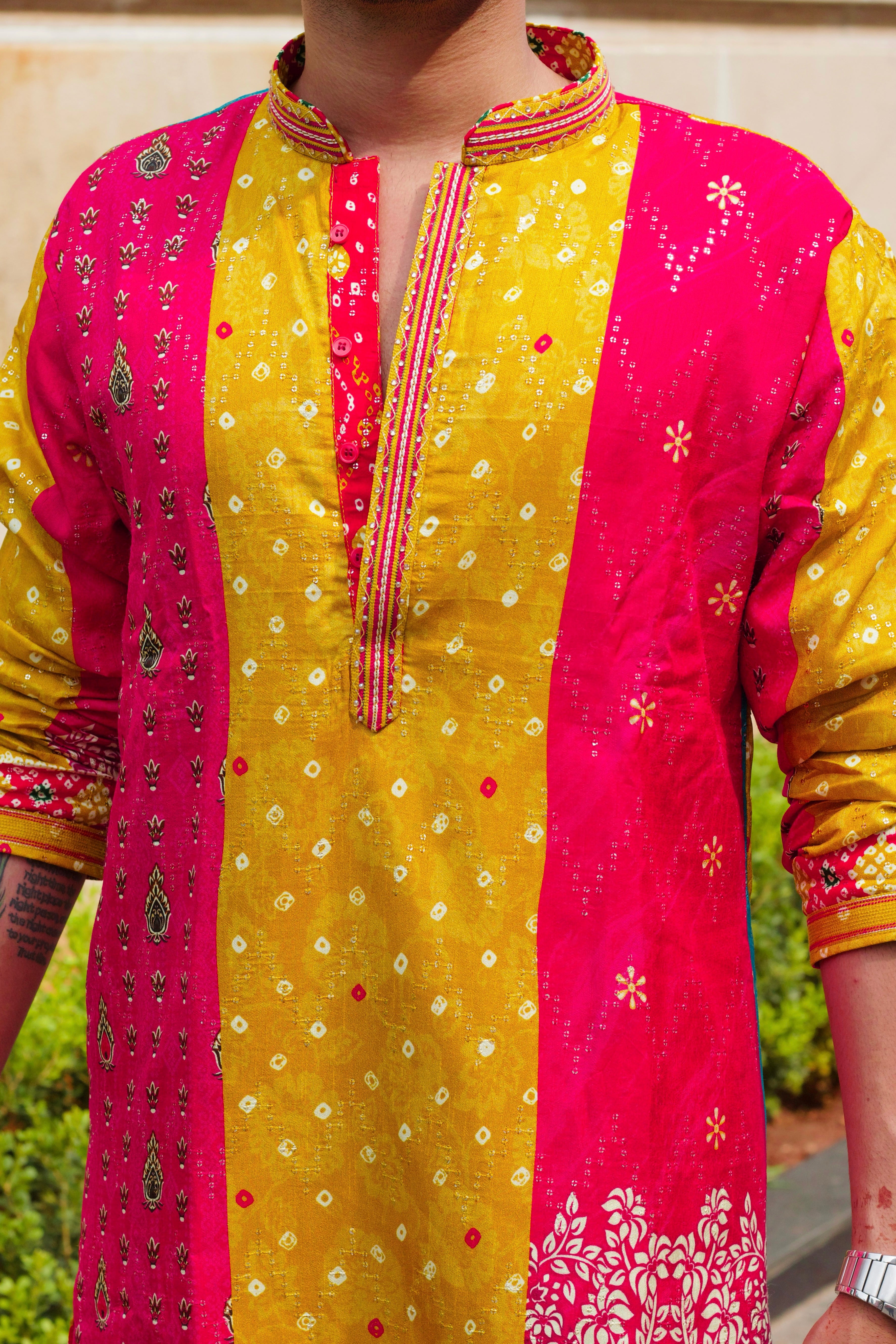 Add a vibrant touch to your festive wardrobe with this Men's Pink and Mustard Kurta Set. Made from rich Dola silk fabric, this kurta features a striking Bandhani print that beautifully blends tradition with color and texture. The bold color combination and lightweight silk make it an ideal choice for festive occasions, family functions, or cultural celebrations.