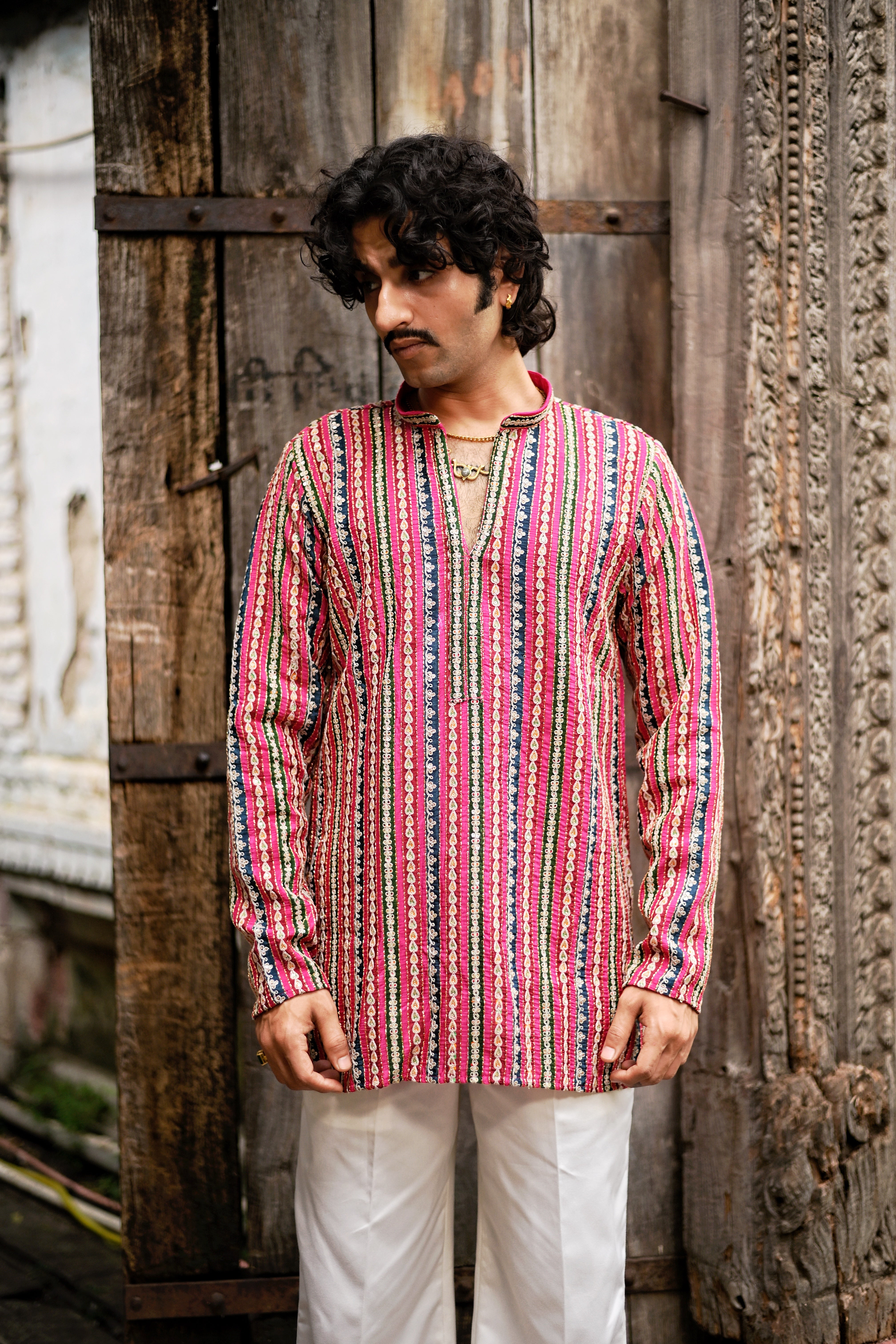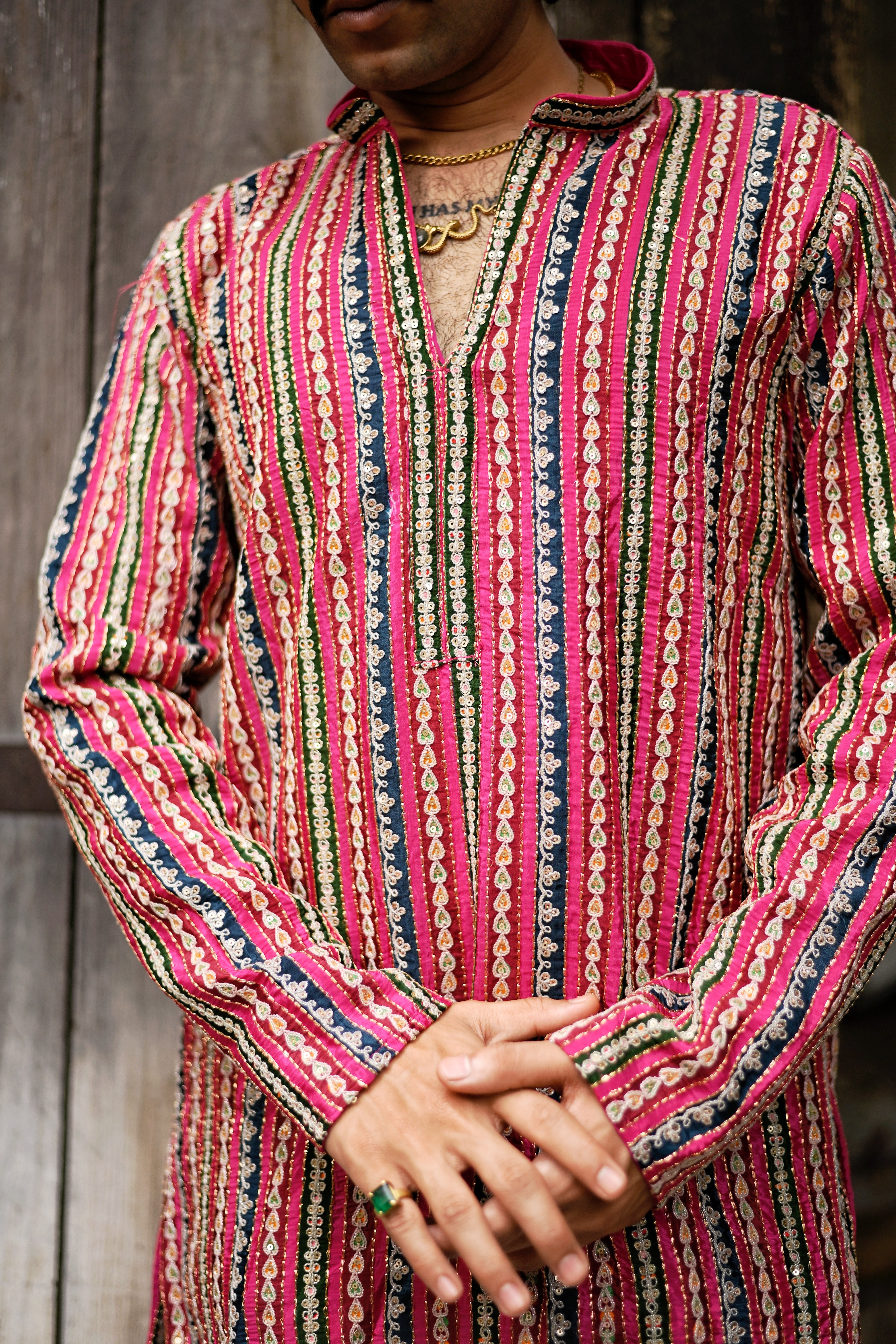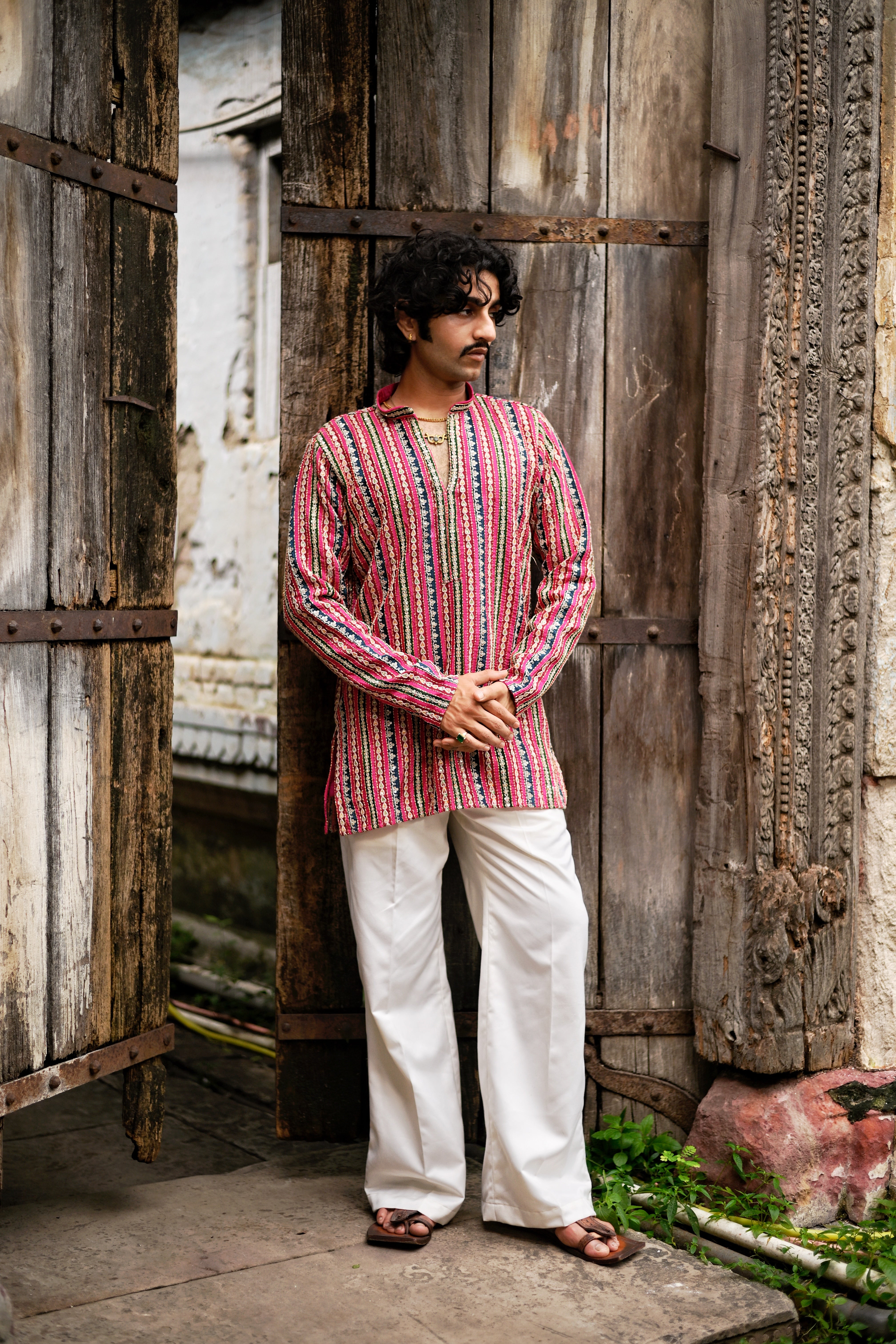 Description: Bring grace and sophistication to your festive look with this Men's Pink Natural Crepe Kurta Set, crafted with exquisite detailing. The kurta showcases a rich position print, beautifully highlighted with intricate golden zari threadwork and detailed corded embroidery for a luxurious finish. Designed with a mandarin collar, full sleeves, above-knee length, and side slits, it ensures a comfortable straight fit. Paired with matching bottoms (pajama or parallel), this set is perfect for weddings, cultural gatherings, and festive occasions.