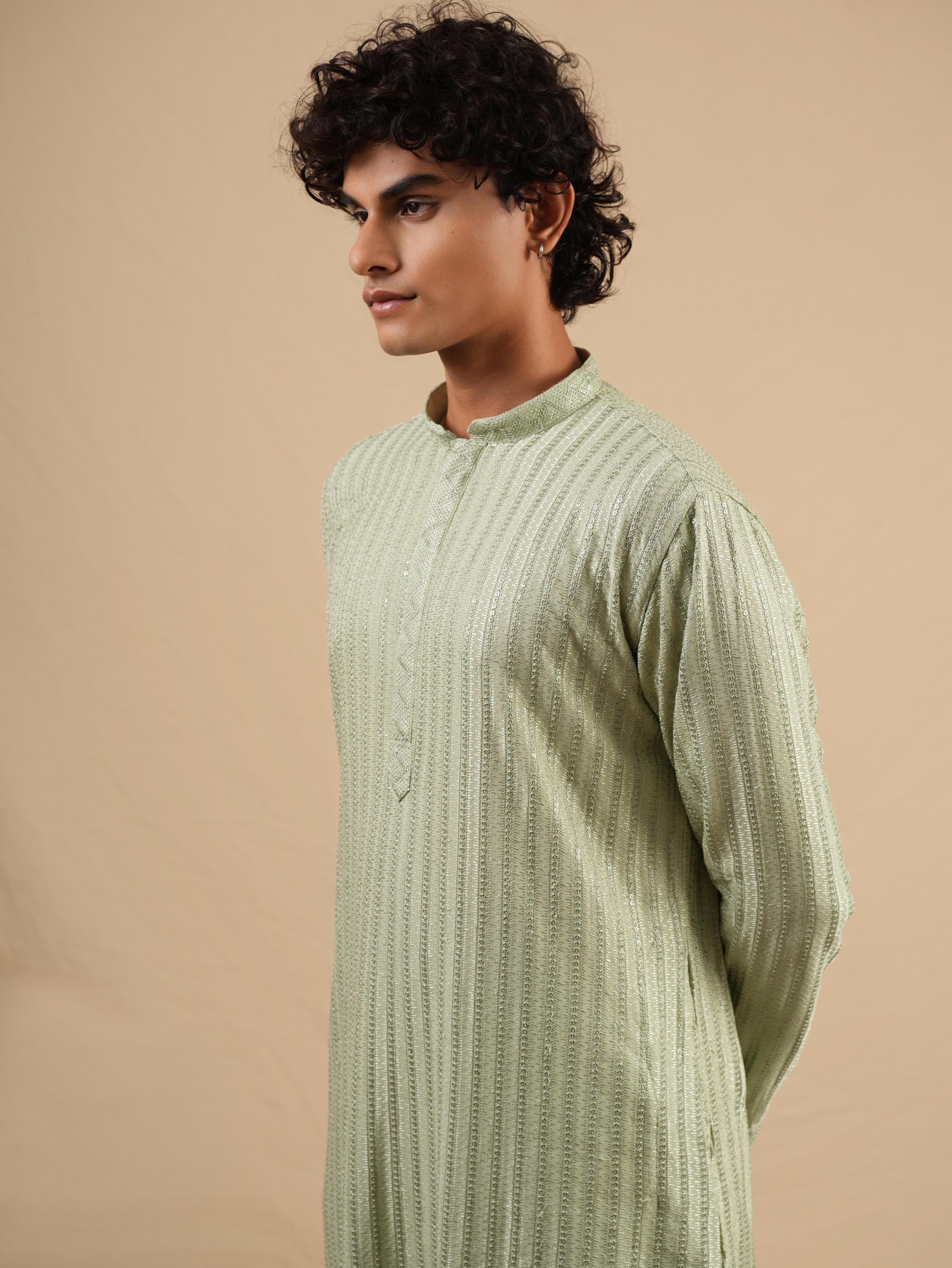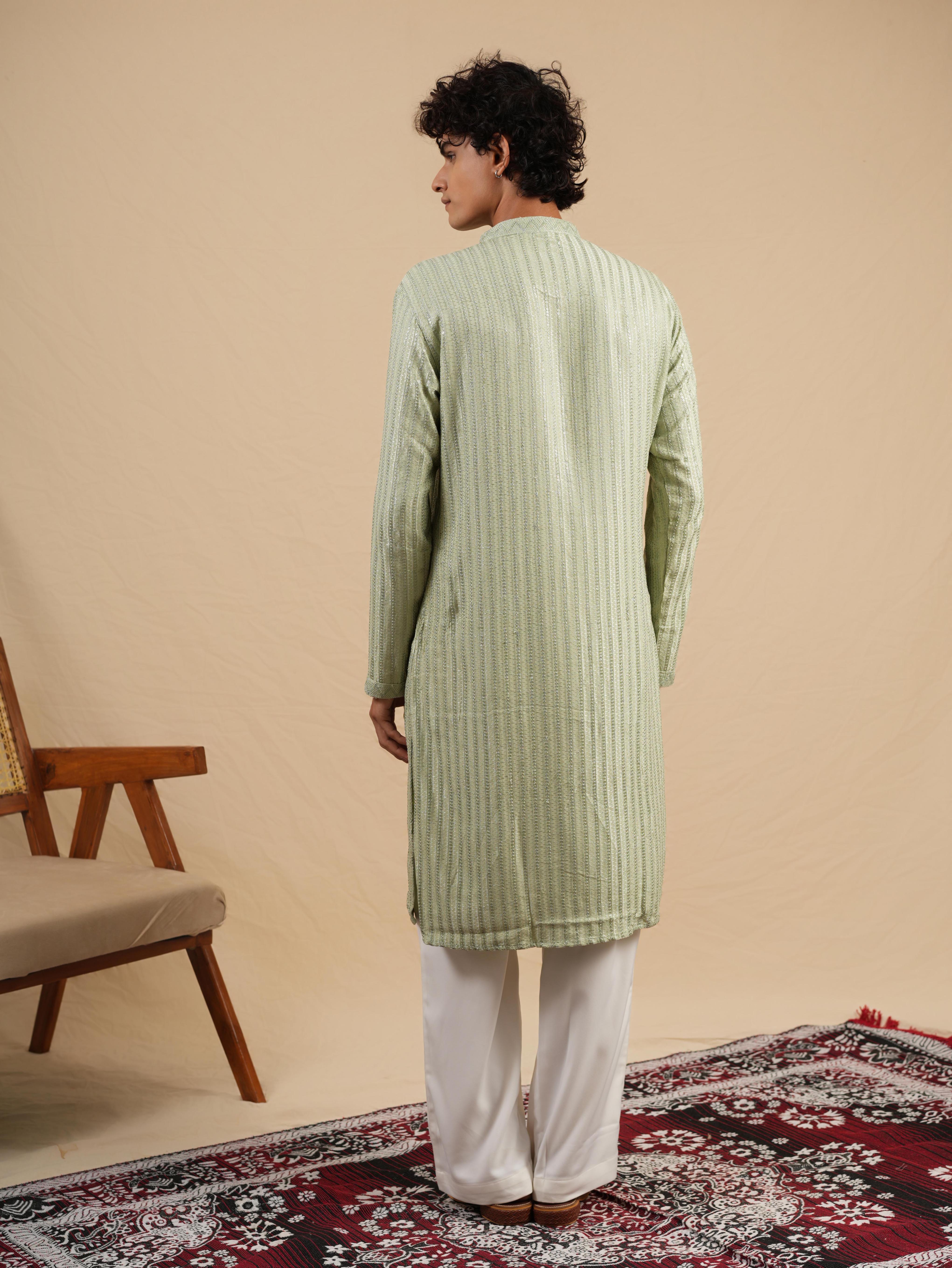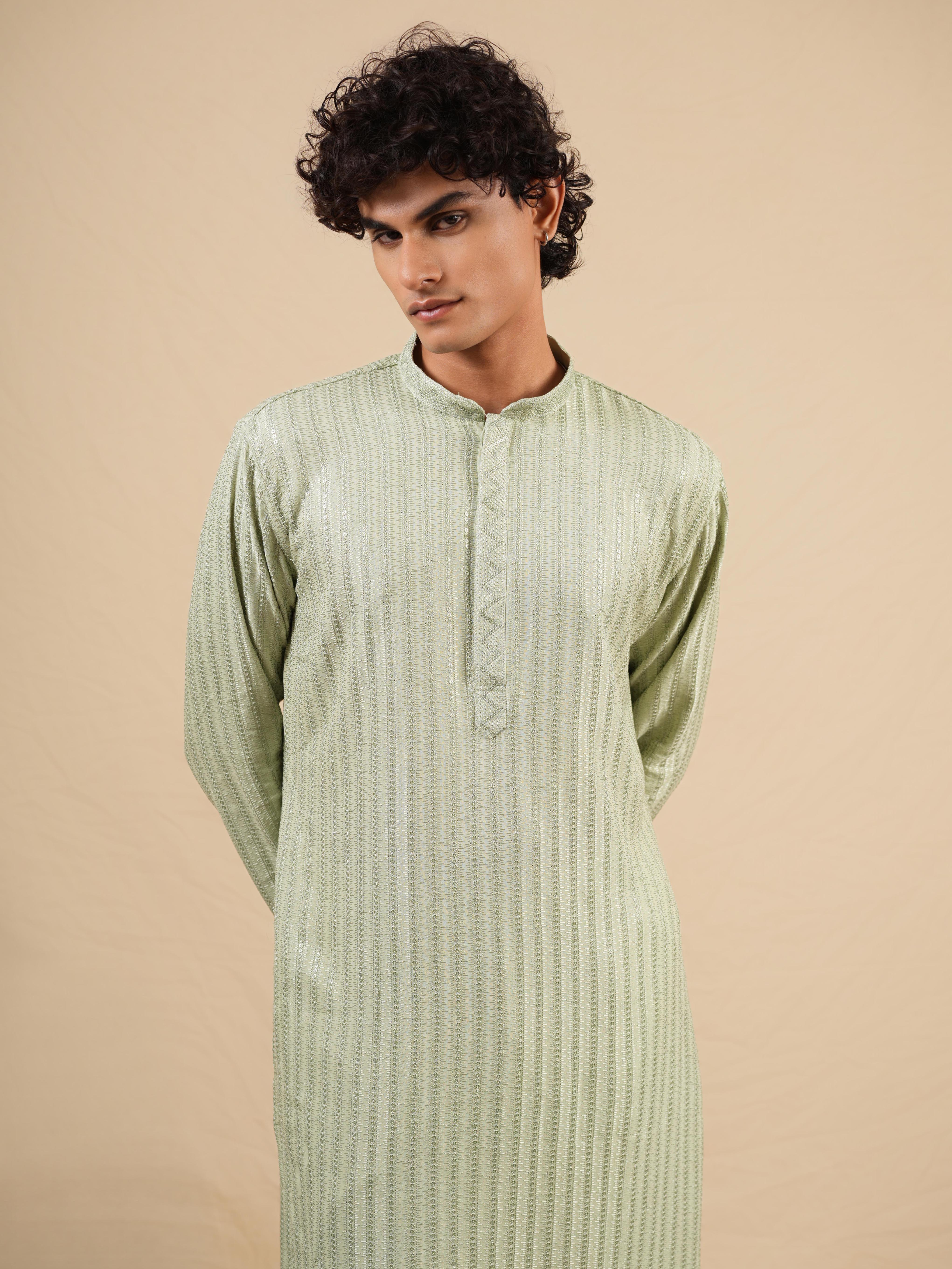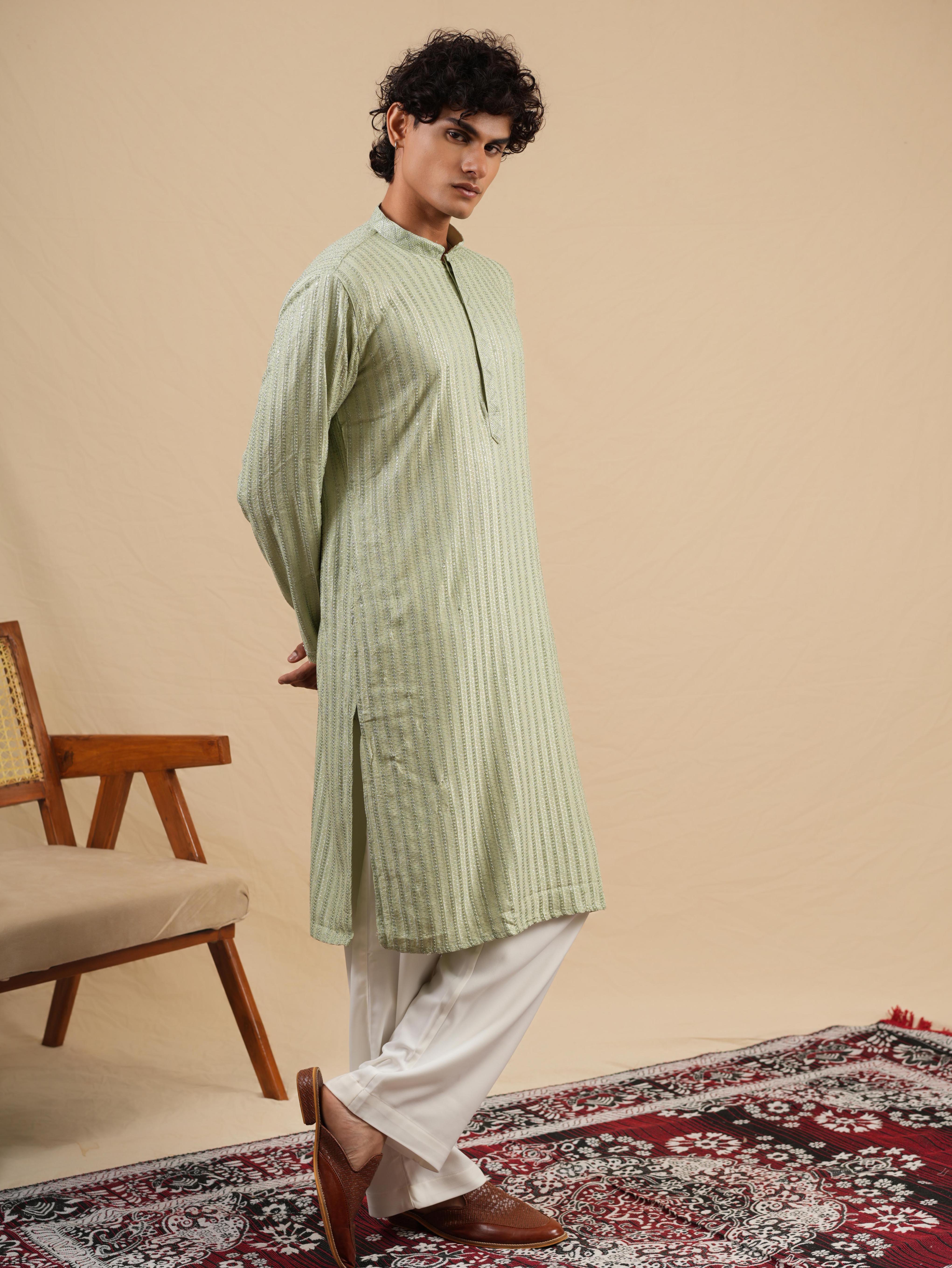 Description: Refresh your festive wardrobe with this Men's Pista Rayon Kurta Set featuring elegant sequins and thread work embroidery. Crafted from soft rayon fabric, this kurta blends comfort with sophistication, while the intricate embroidery adds a touch of festive charm. Designed with a mandarin collar, full sleeves, knee-length cut, and side slits, it offers a refined straight fit. Paired with matching bottoms (pajama or parallel), this set is a perfect choice for weddings, festive gatherings, and cultural celebrations.