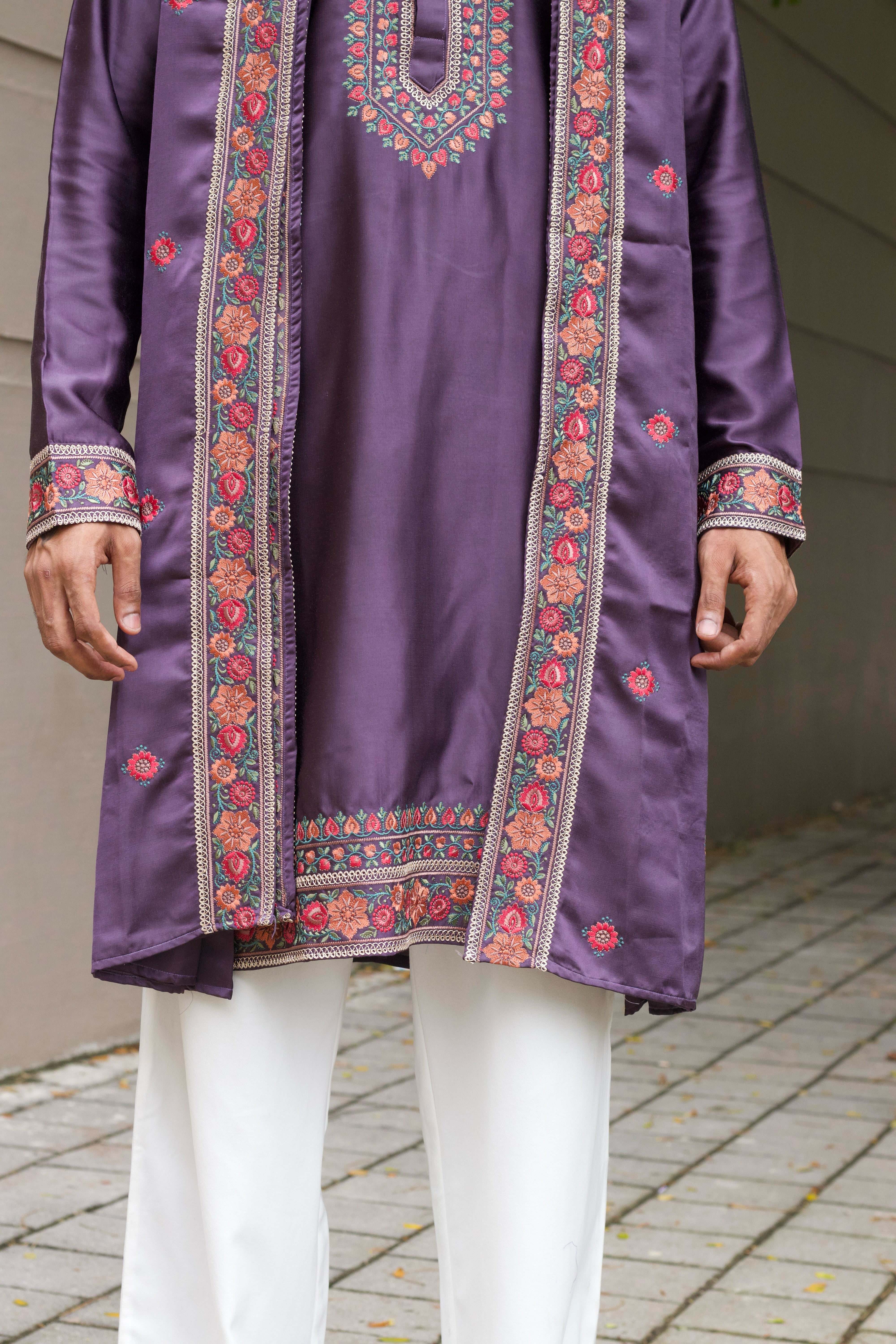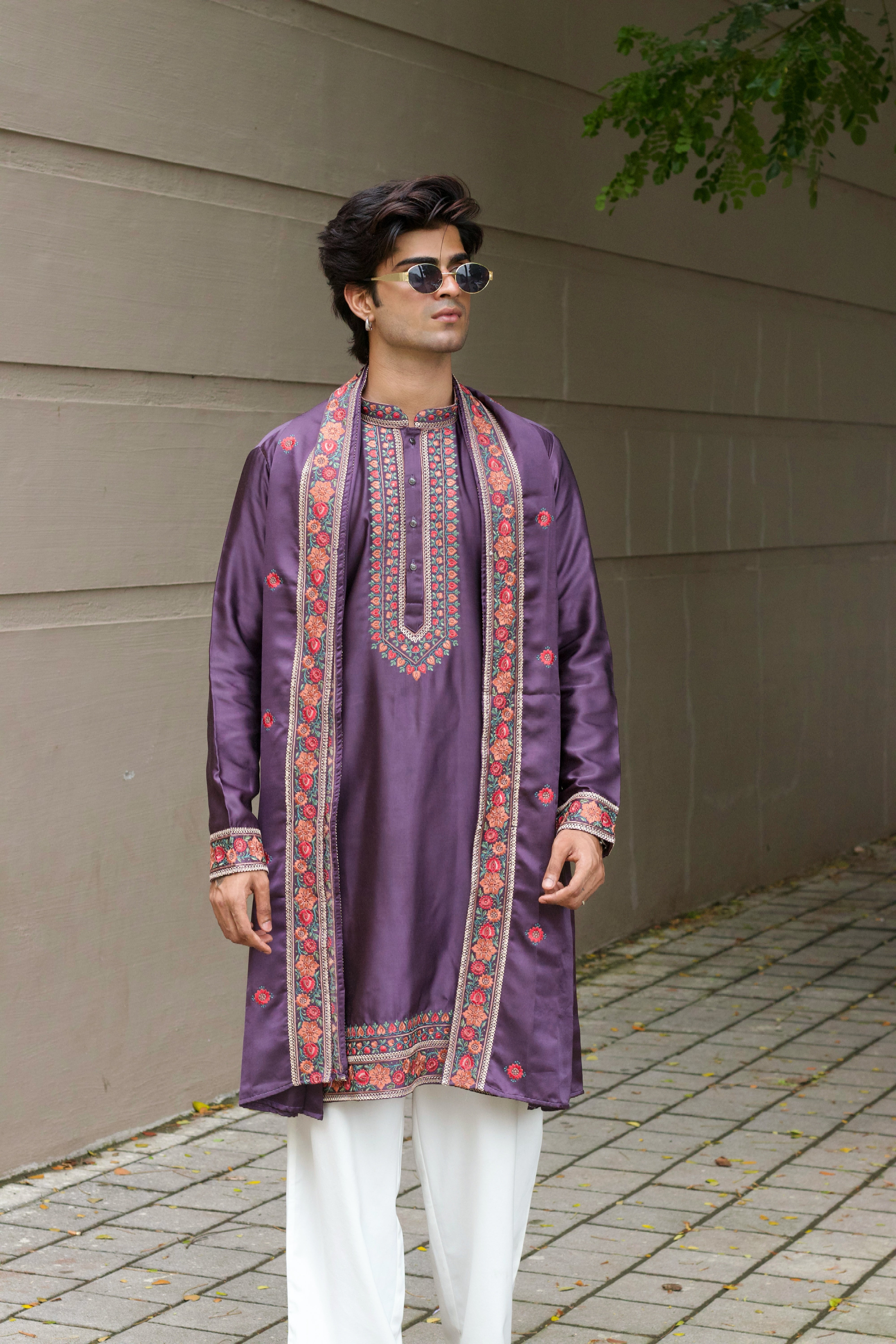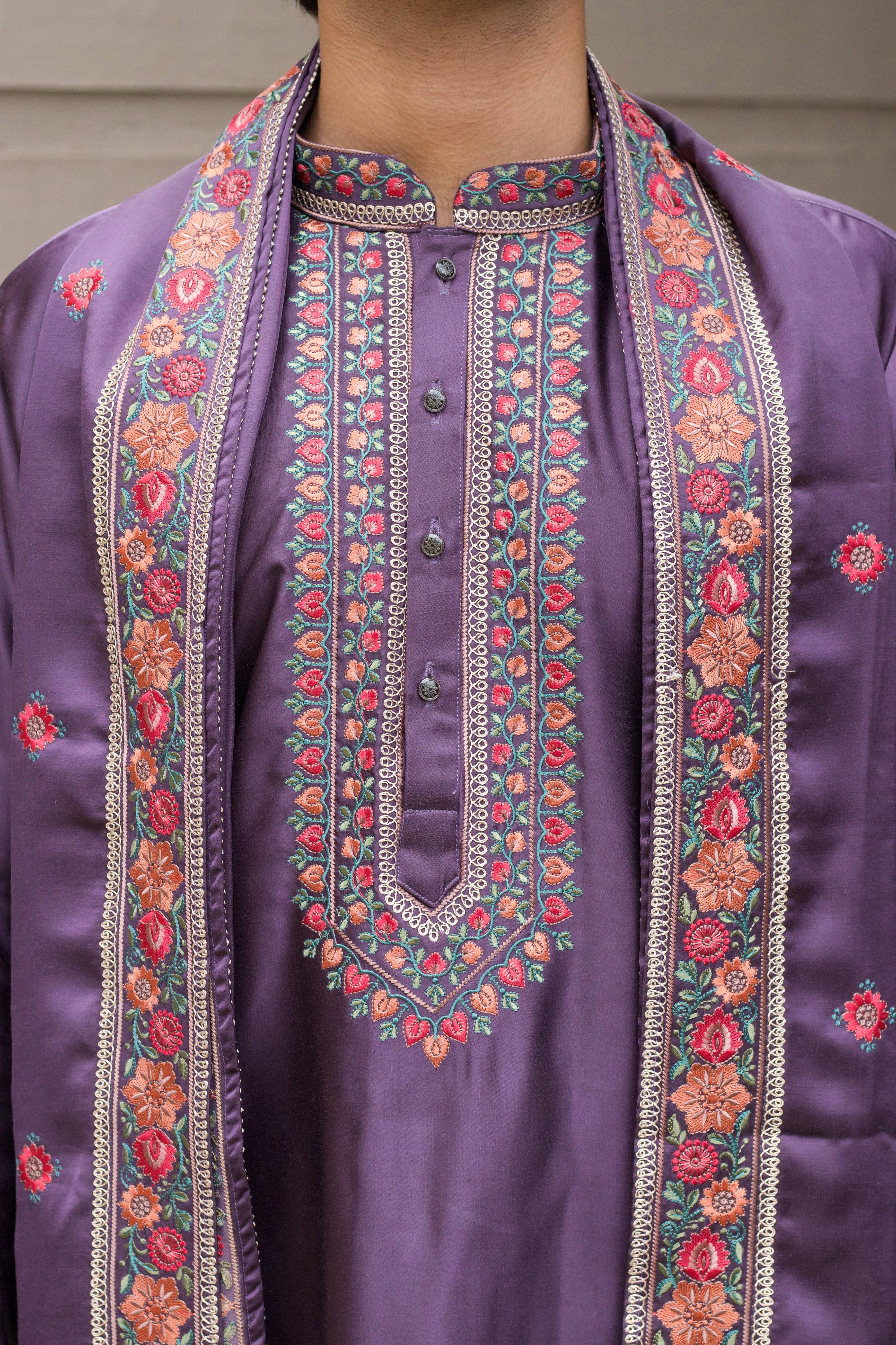 Turn heads this festive season with this Men's Purple Satin Silk Kurta Set. Made from smooth satin silk fabric, the kurta is adorned with vibrant multicolour thread work embroidery that adds a striking traditional touch. The set includes a matching bottom and a stylish dupatta, making it a perfect ensemble for weddings, celebrations, and festive gatherings. Featuring a mandarin collar, full sleeves, and a knee-length straight silhouette with side slits, this outfit offers both elegance and comfort.