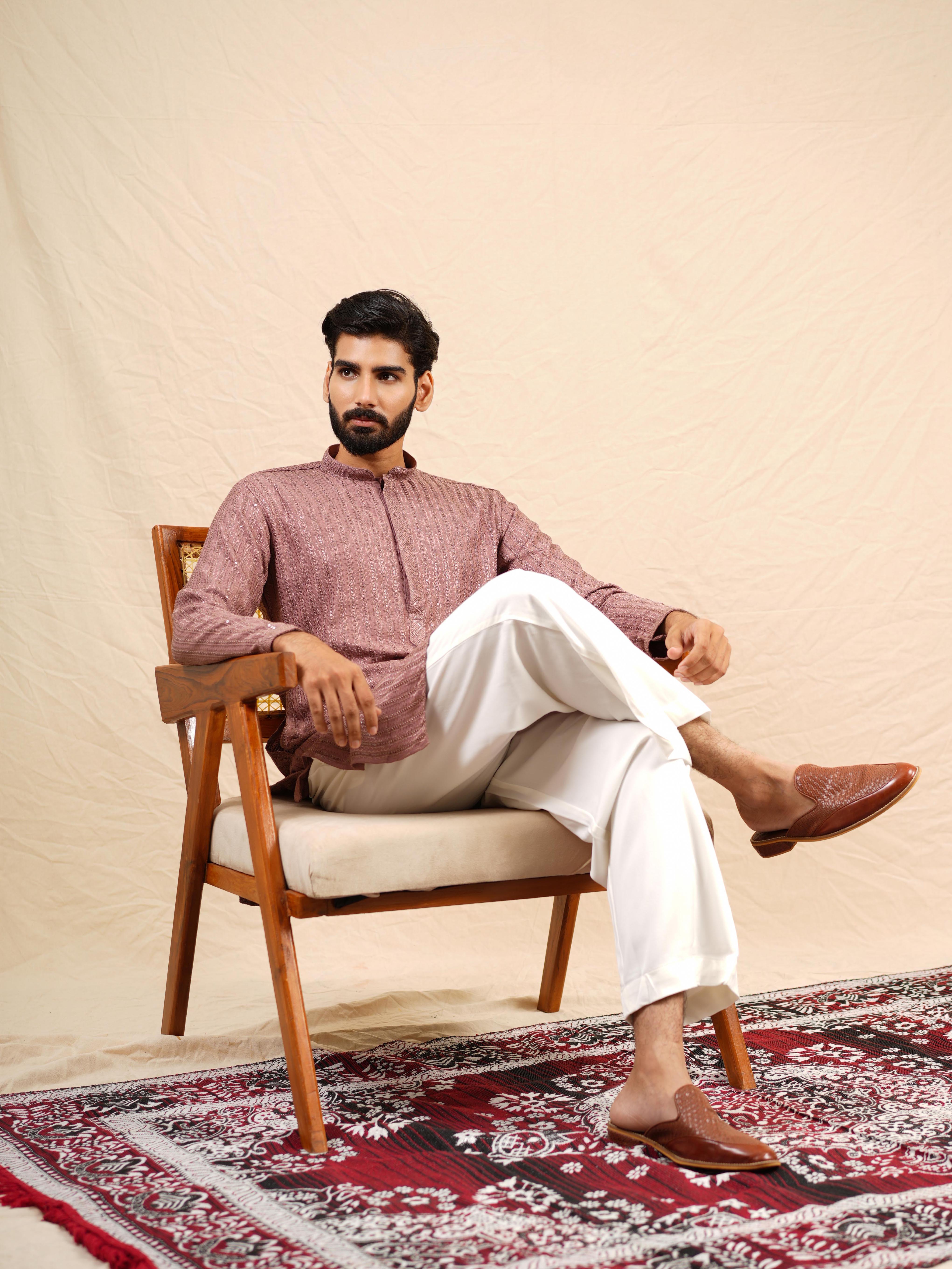 Description: Make a stylish statement this festive season with this Men's Rust Rayon Kurta Set featuring intricate sequins and thread work embroidery. Crafted from premium rayon fabric, this kurta combines comfort with festive elegance. The mandarin collar, full sleeves, knee-length cut, and side slits lend a classic yet refined appeal. Paired with matching bottoms (pajama or parallel), this set is an ideal choice for weddings, festive celebrations, and cultural gatherings.