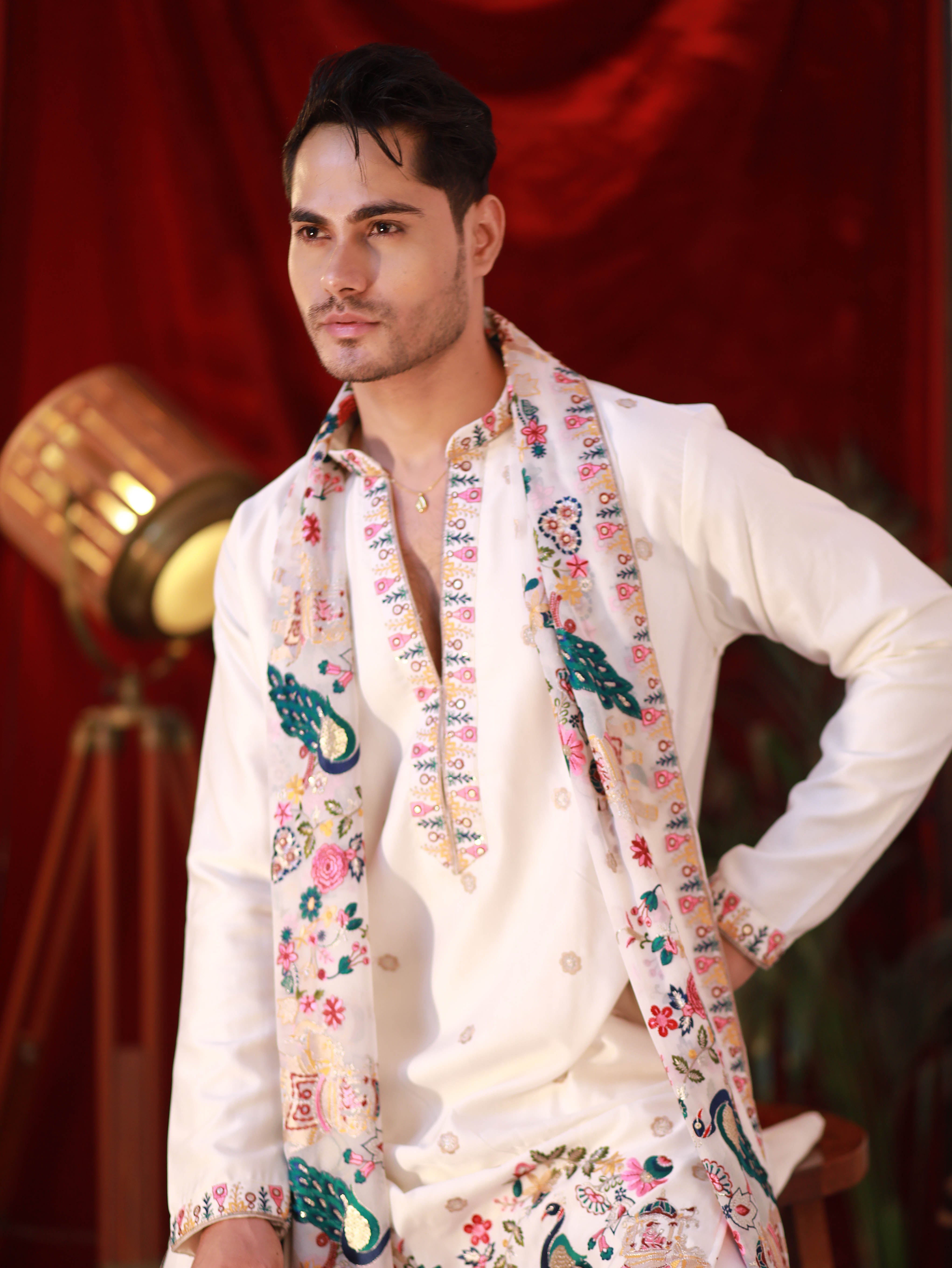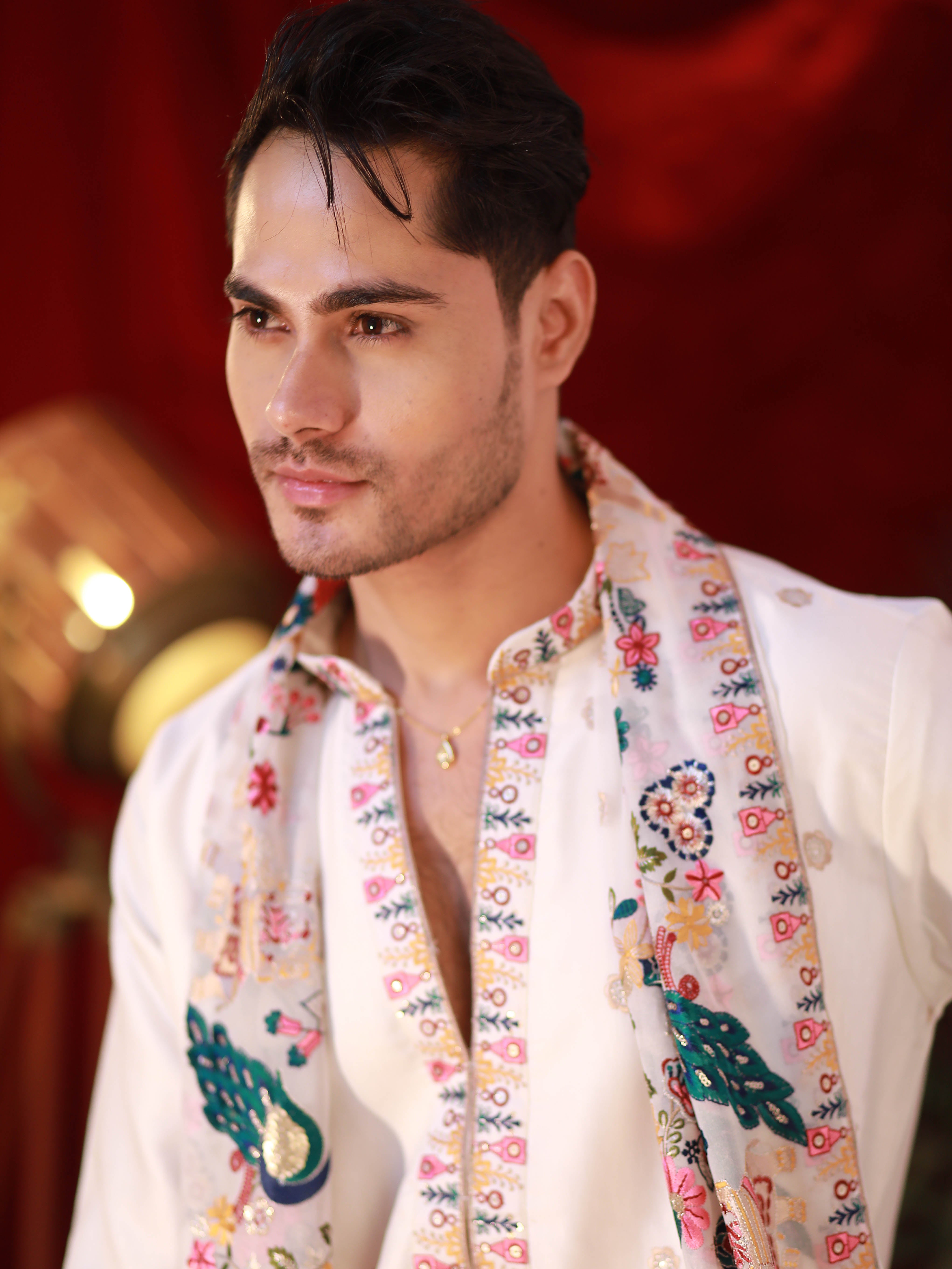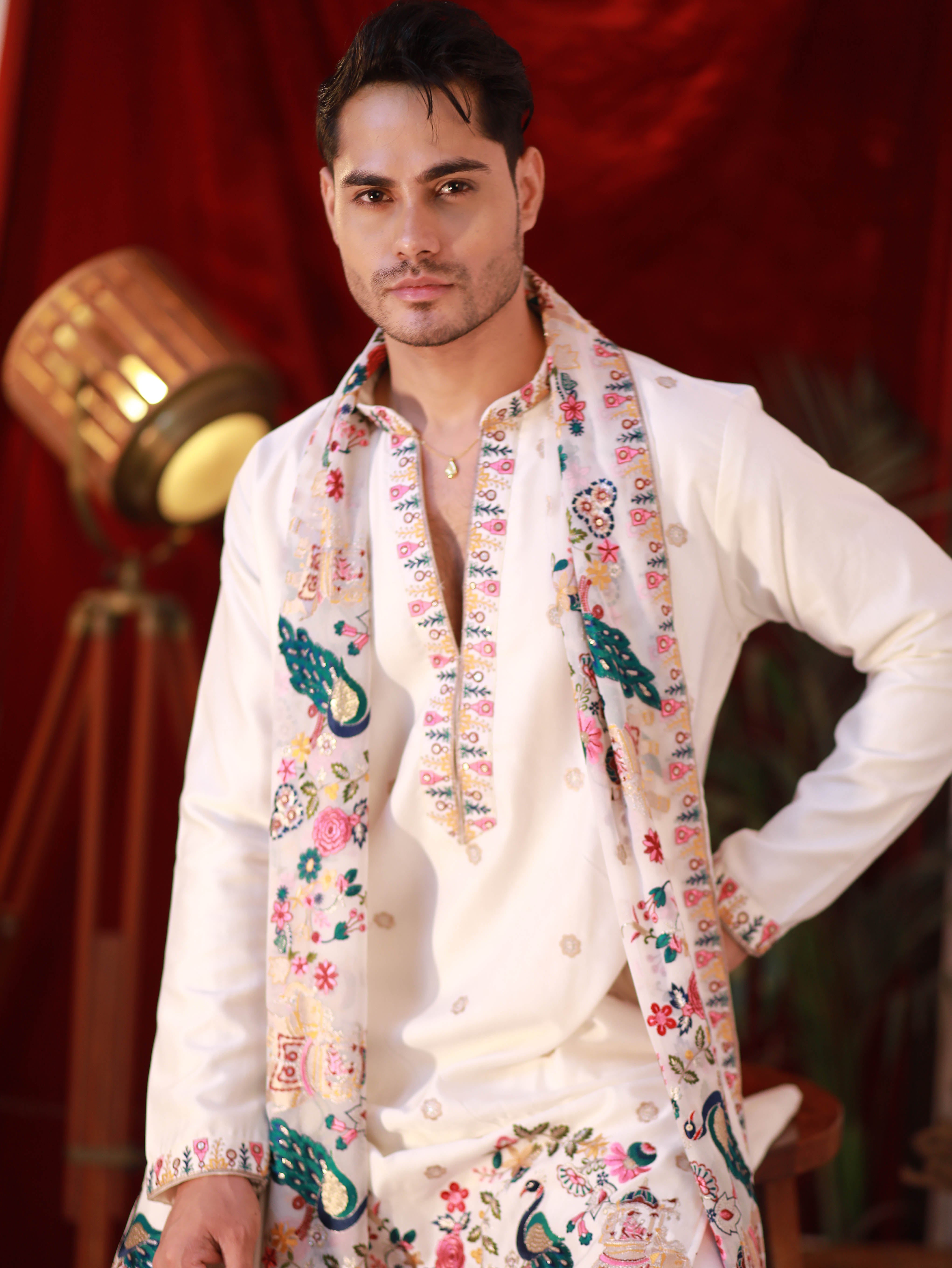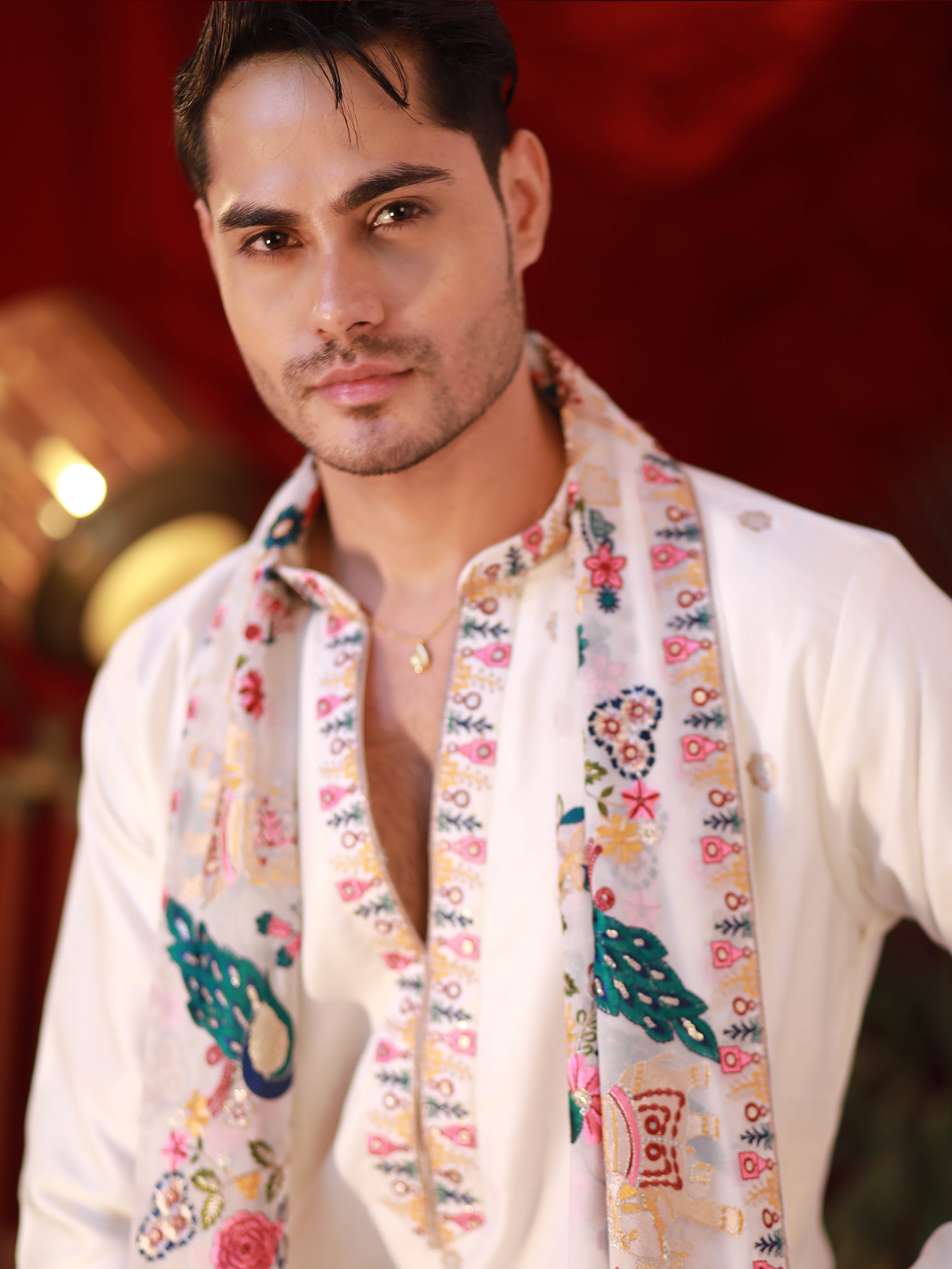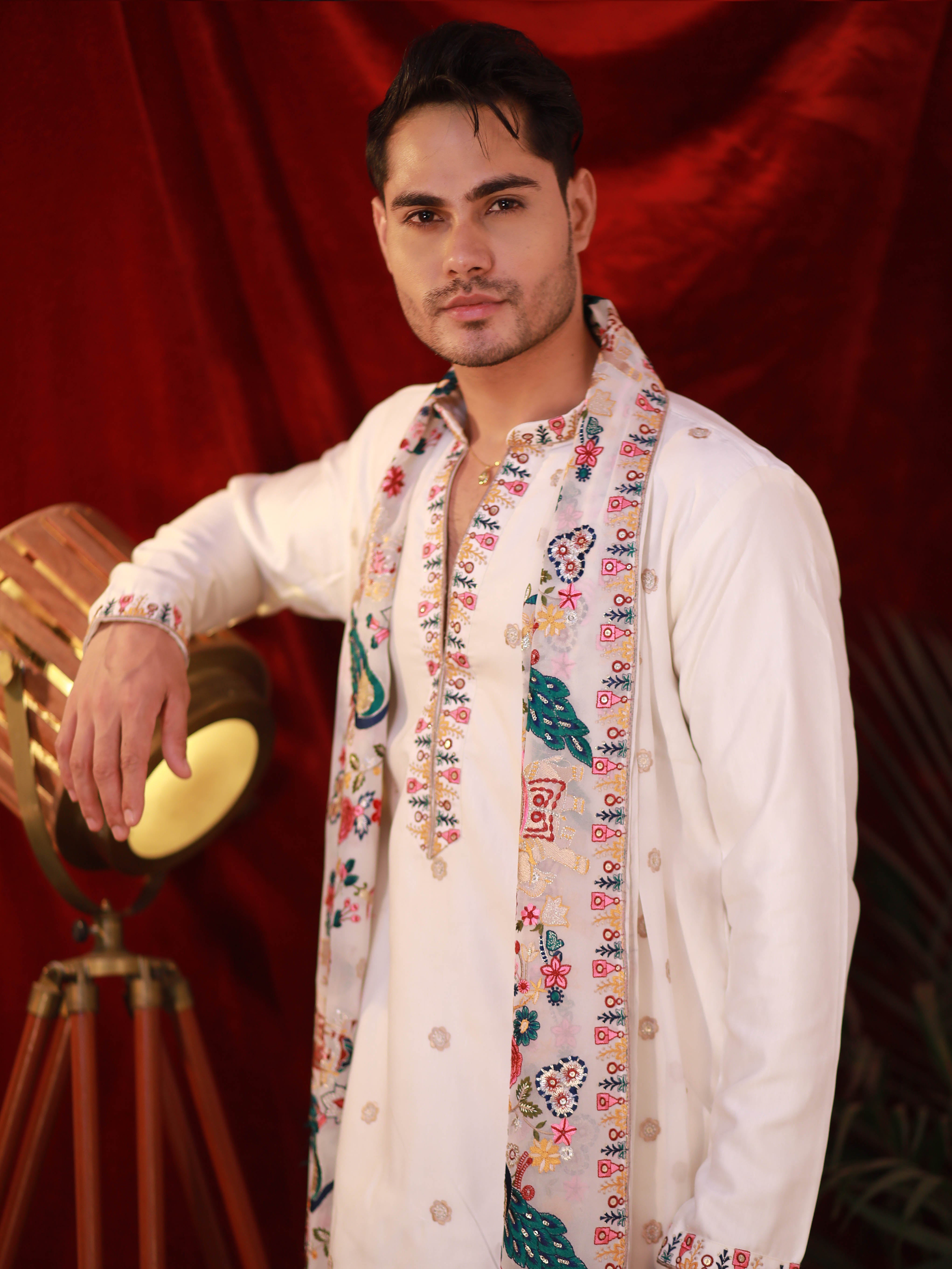 Description: Elevate your festive style with this Men's White Linen Satin Kurta Set, paired with a graceful georgette dupatta. Crafted from premium linen satin, the kurta is adorned with intricate multicolour thread work embroidery, adding elegance and vibrance to its classic design. Featuring a mandarin collar, full sleeves, knee-length cut, and side slits, it offers a refined straight fit that combines comfort with sophistication. The set includes a matching bottom and a dupatta, making it a perfect choice for weddings, festive gatherings, and cultural celebrations.