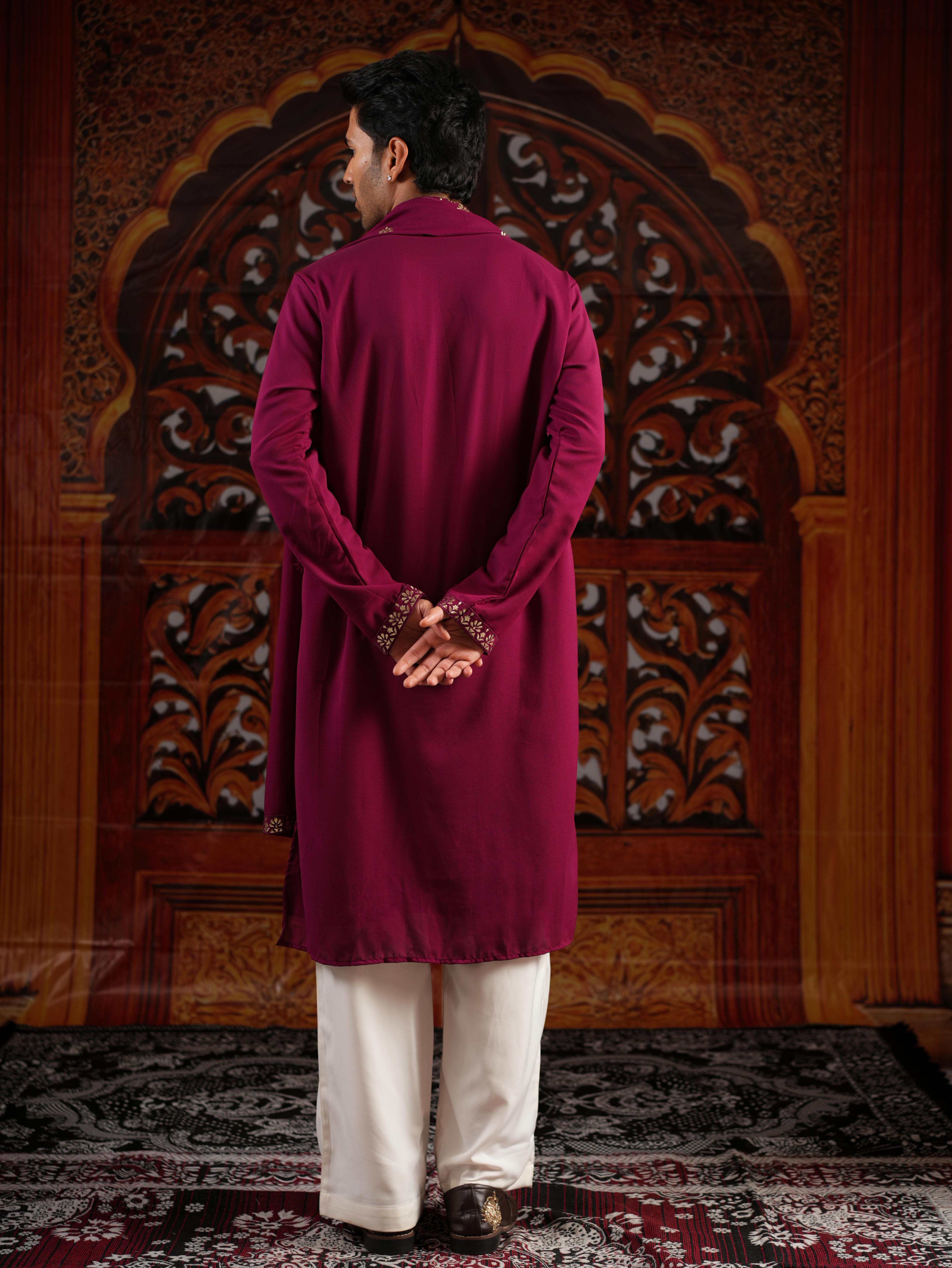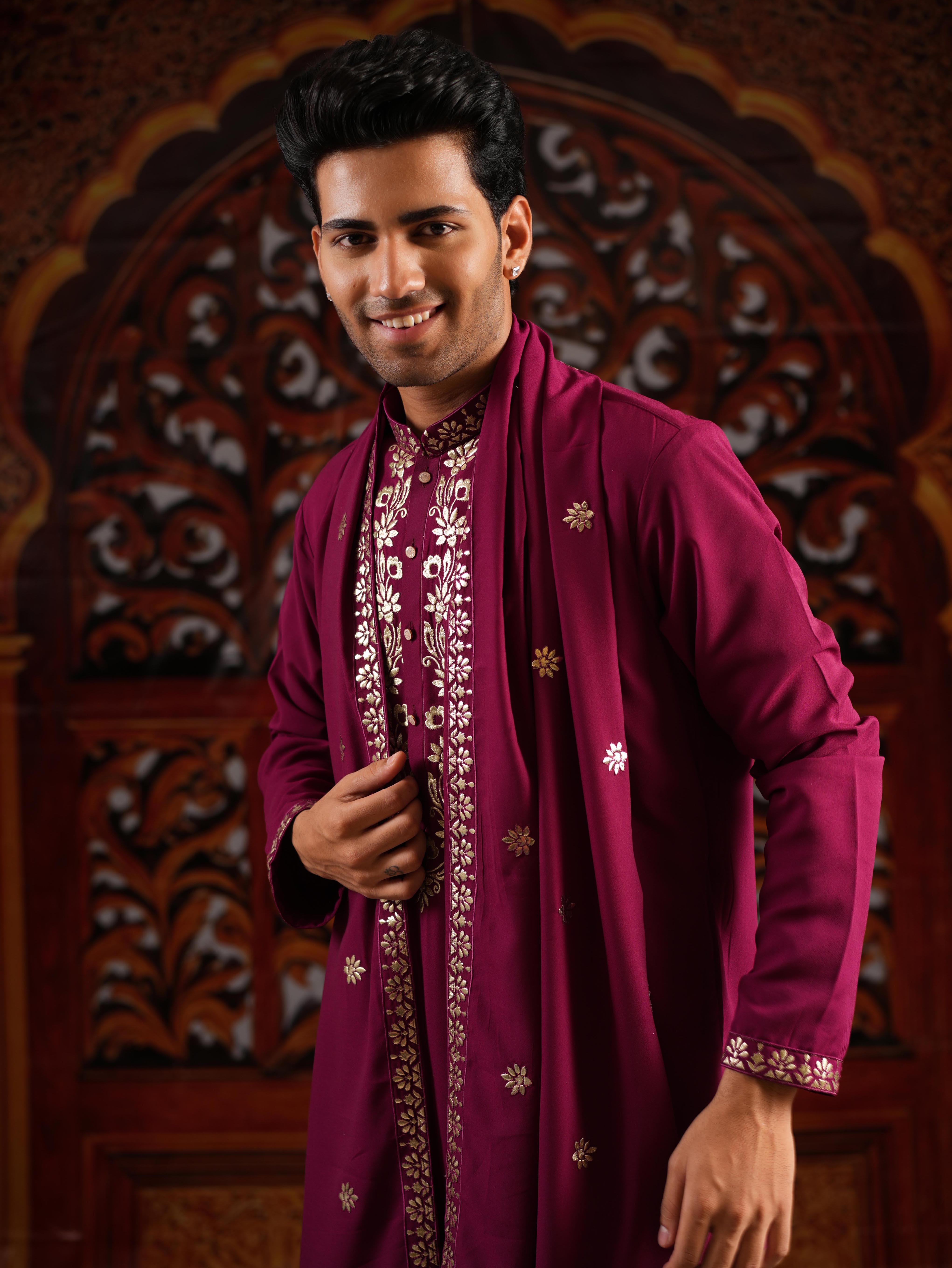Description: Add a regal touch to your festive look with this Men's Wine Georgette Kurta Set, adorned with elegant foil work. Crafted from lightweight georgette fabric, this kurta ensures both comfort and sophistication. Designed with a mandarin collar, full sleeves, and a straight knee-length cut with side slits, it blends traditional style with modern elegance. Complete with a matching bottom (pajama or parallel) and a dupatta, this set is an ideal choice for weddings, festive occasions, and cultural celebrations.
