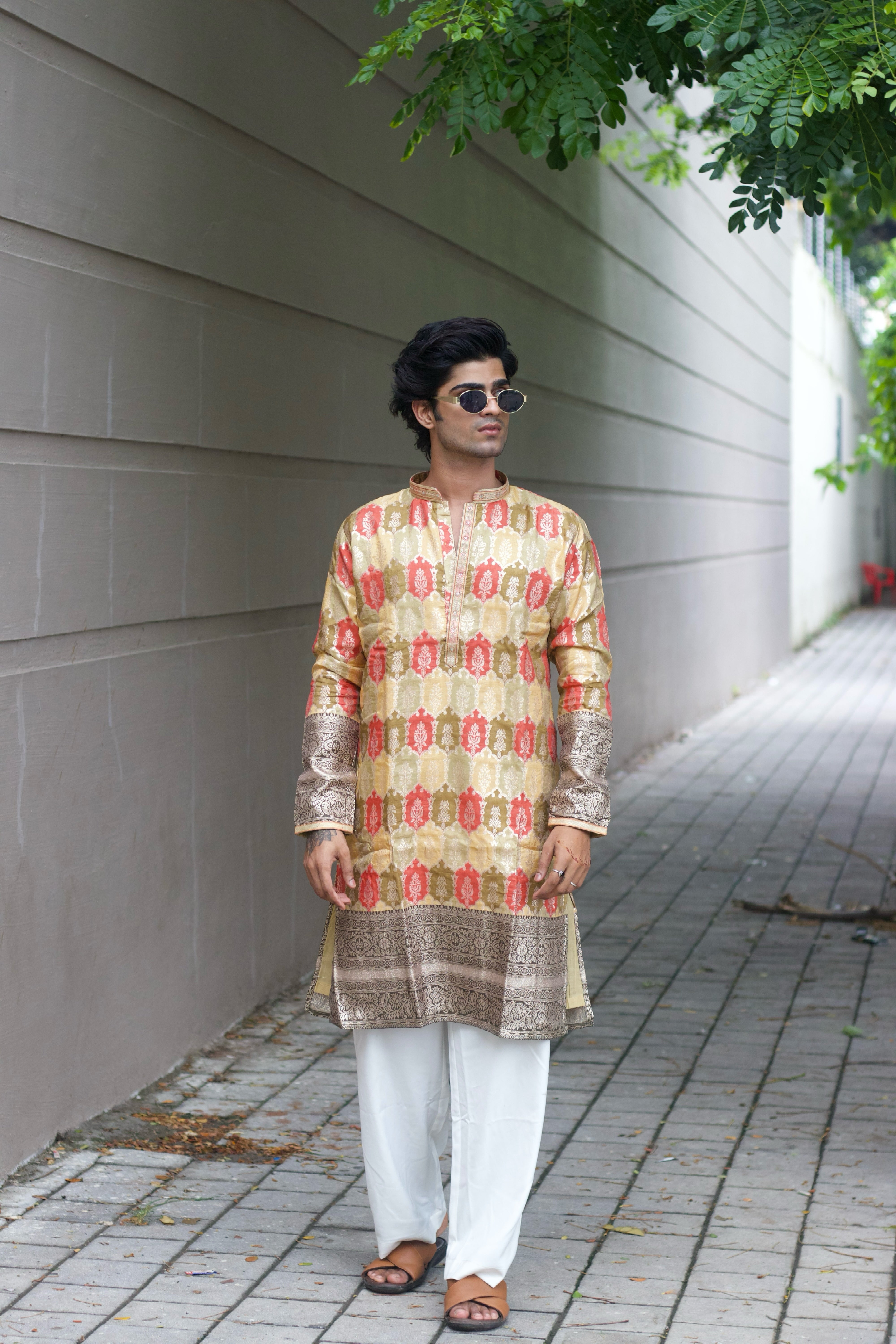 Brighten up your festive wardrobe with this Men's Yellow Jacquard Kurta Set. Crafted from high-quality jacquard fabric, this kurta features an elegant position print that adds a subtle yet stylish touch. Designed with a mandarin collar and full sleeves, it offers a sharp and refined look. The straight cut, knee-length silhouette with side slits ensures both comfort and traditional charm, making it a perfect choice for festive gatherings and celebrations.
