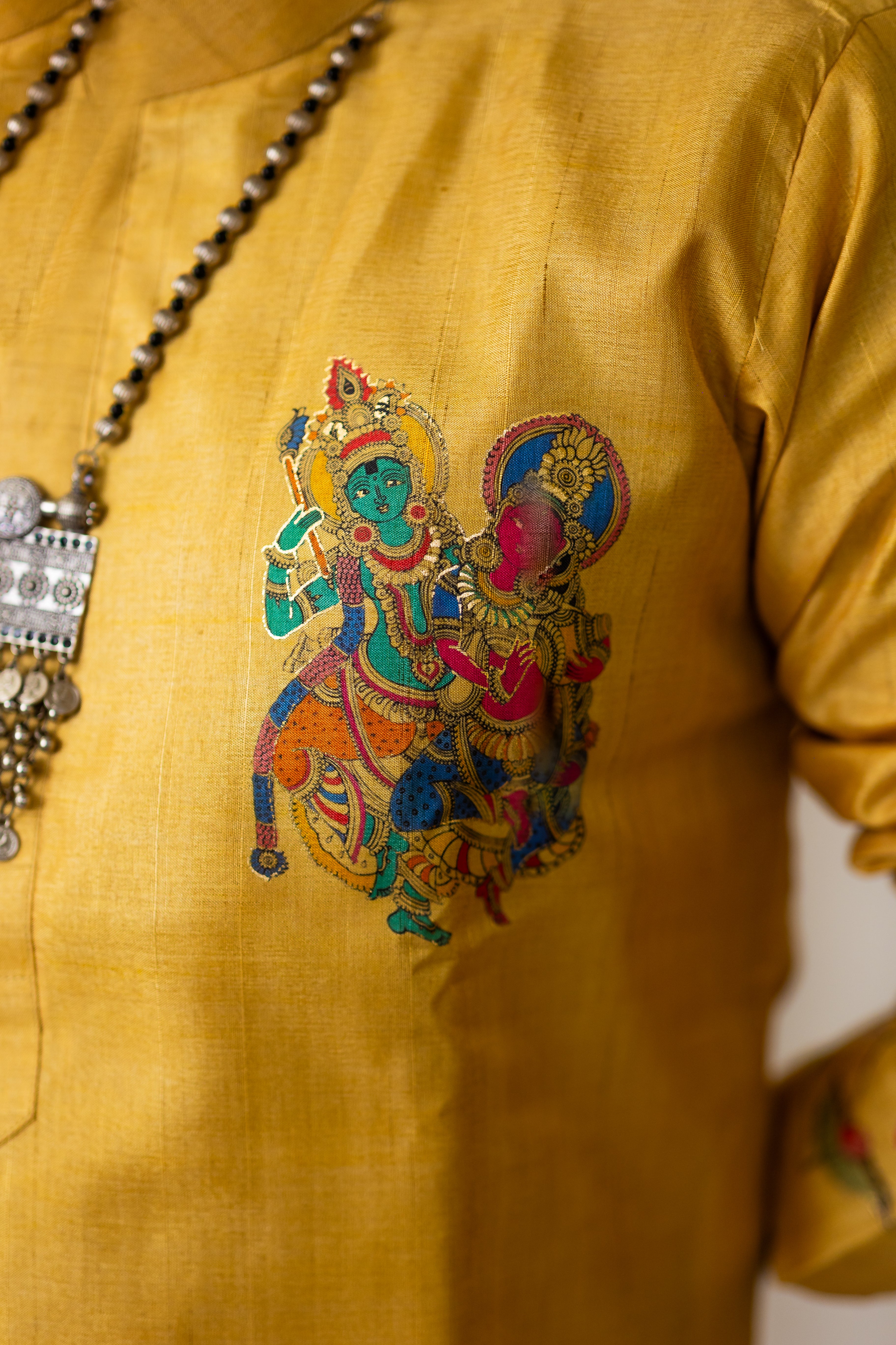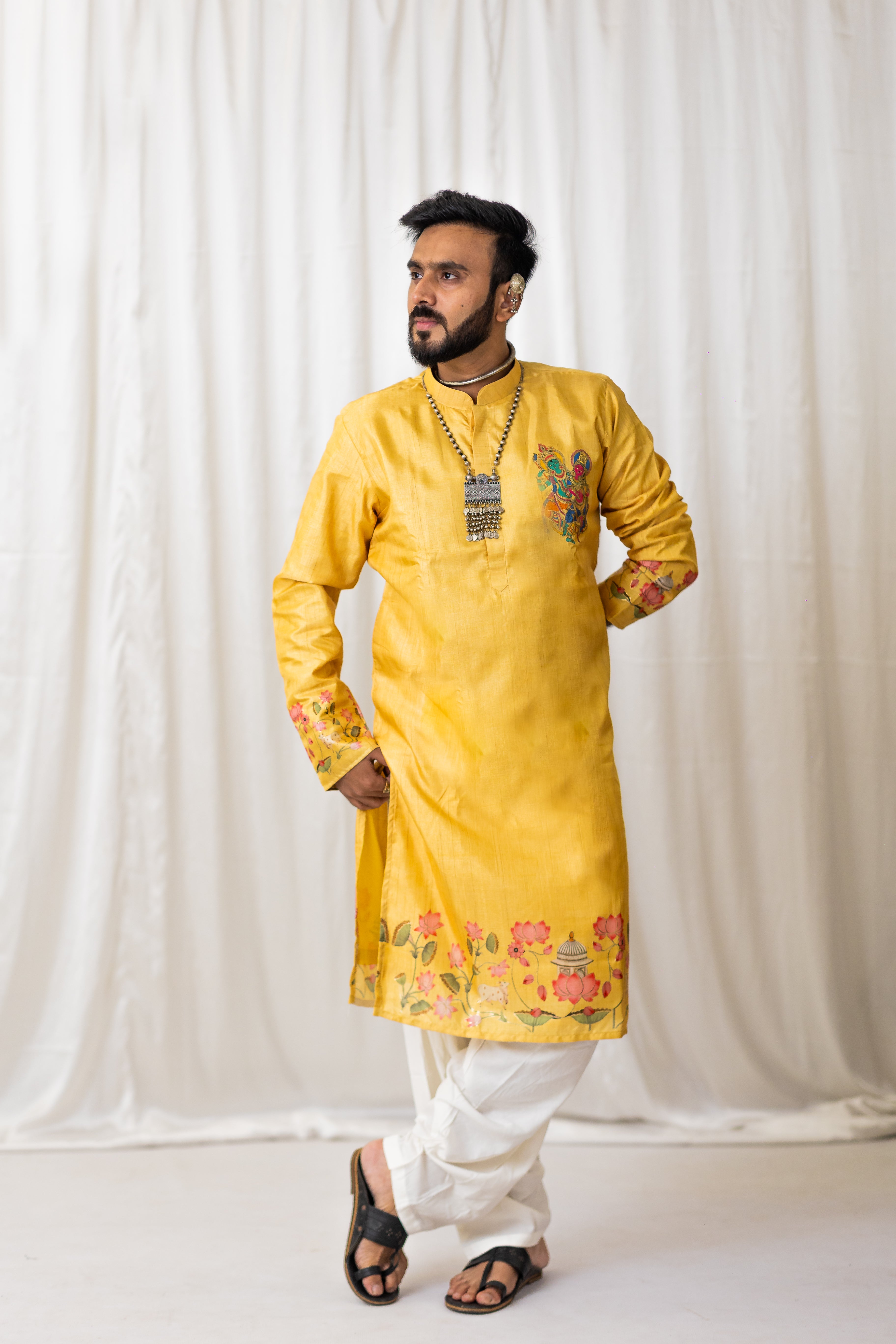 Description: Brighten your festive look with this Men's Yellow Silk Kurta Set, crafted on a luxurious silk base with elegant digital print and shimmering foil work. The rich fabric combines comfort with a touch of festive glamour, making it perfect for special occasions. Featuring a mandarin collar, full sleeves, and a straight knee-length cut with side slits, this kurta balances traditional style with modern elegance. Paired with matching bottoms (pajama or Patiala), it is an ideal outfit for weddings, festive gatherings, and cultural celebrations.