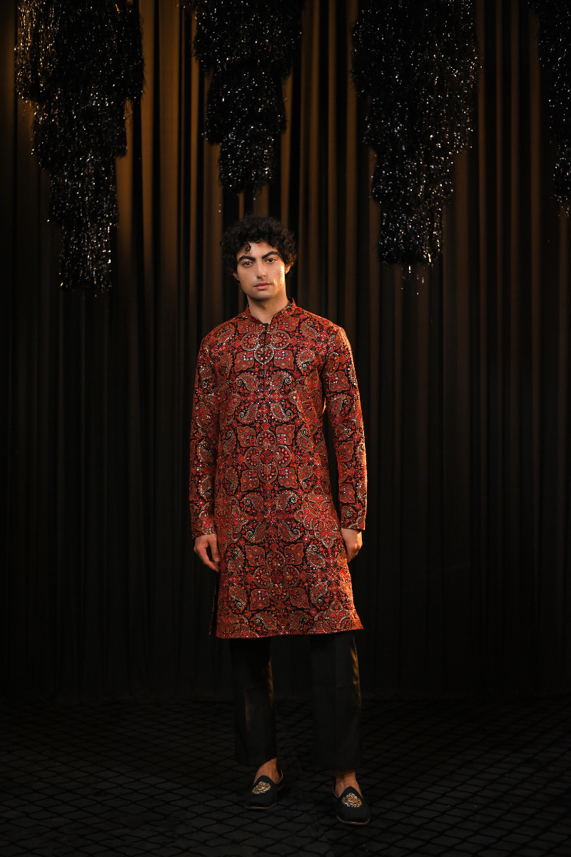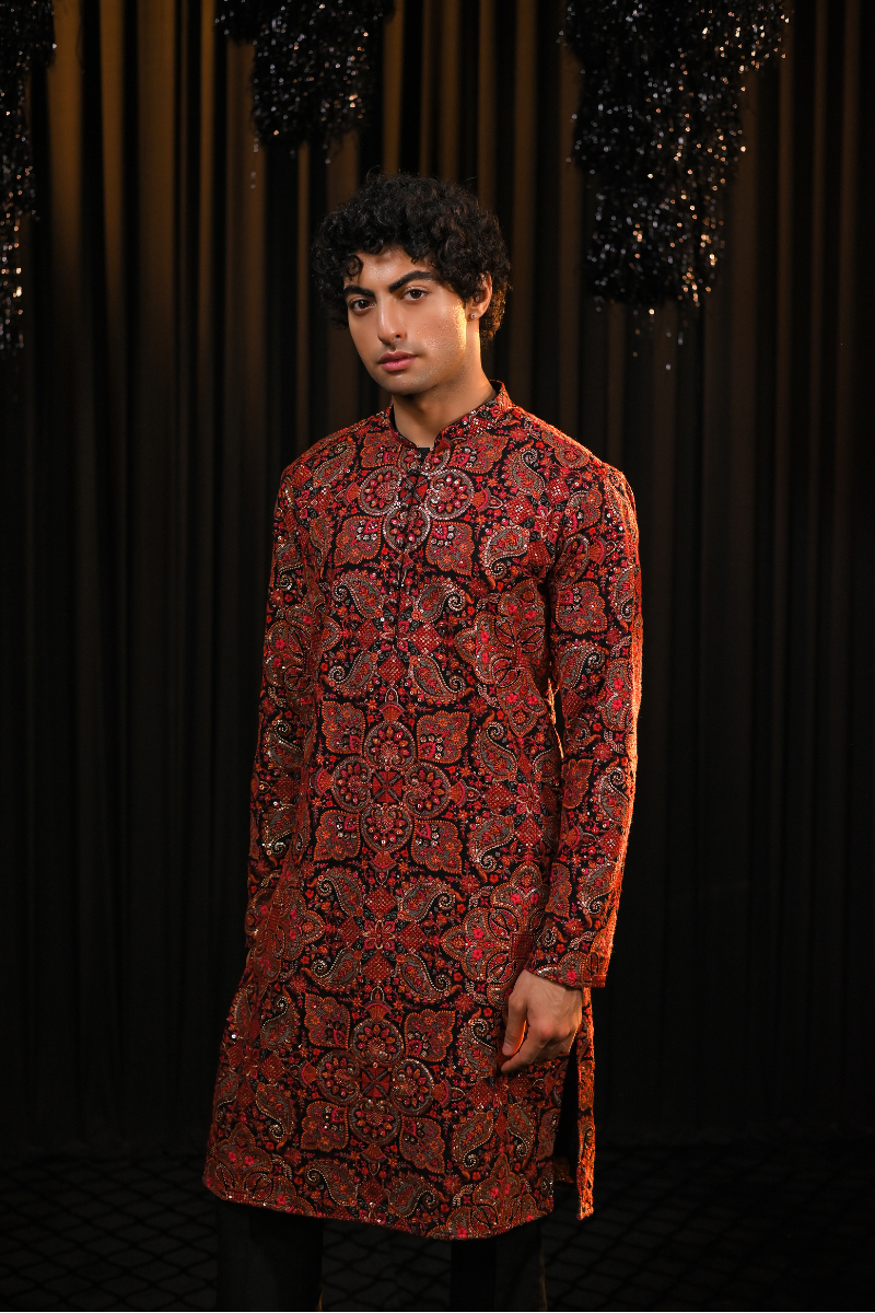 Enhance your festive wardrobe with this Men's Ethnic Wear Kurta featuring vibrant multicolour threadwork embroidery. Crafted from premium georgette fabric, this black kurta offers a blend of traditional charm and modern style, making it an ideal choice for any festive occasion.