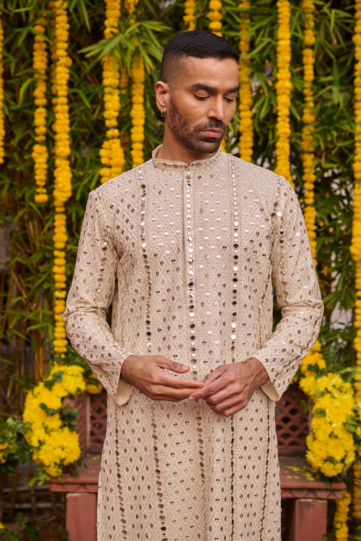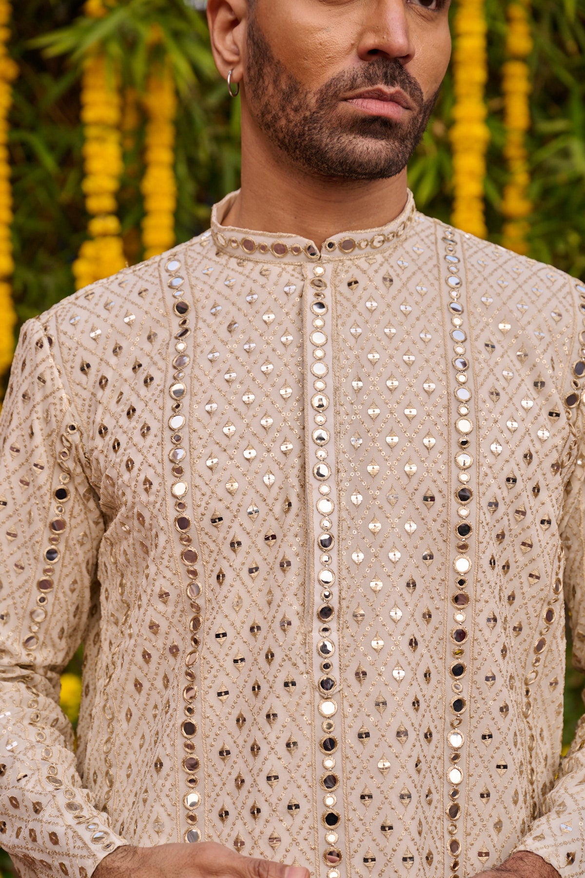 Upgrade your festive wardrobe with this Off White Georgette Kurta Set, exquisitely adorned with sequins mirror work embroidery. Designed with a mandarin collar and full sleeves, this knee-length kurta with side slits offers a perfect blend of elegance and comfort. Paired with a straight pant, this set is an ideal choice for special occasions.