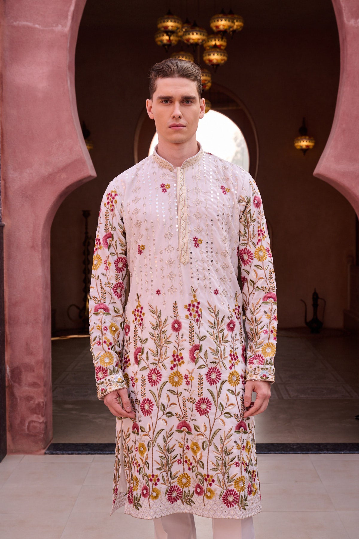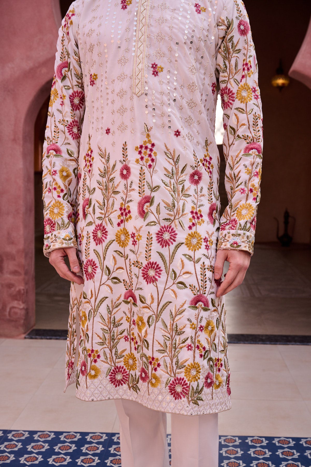 Elevate your festive collection with this Off White Georgette Kurta Set, featuring intricate sequins and multicolour floral thread work embroidery. The mandarin collar and full sleeves add a refined touch to the knee-length kurta, while the side slits offer ease and comfort. Paired with a straight pant, this ensemble is perfect for special occasions and celebrations.