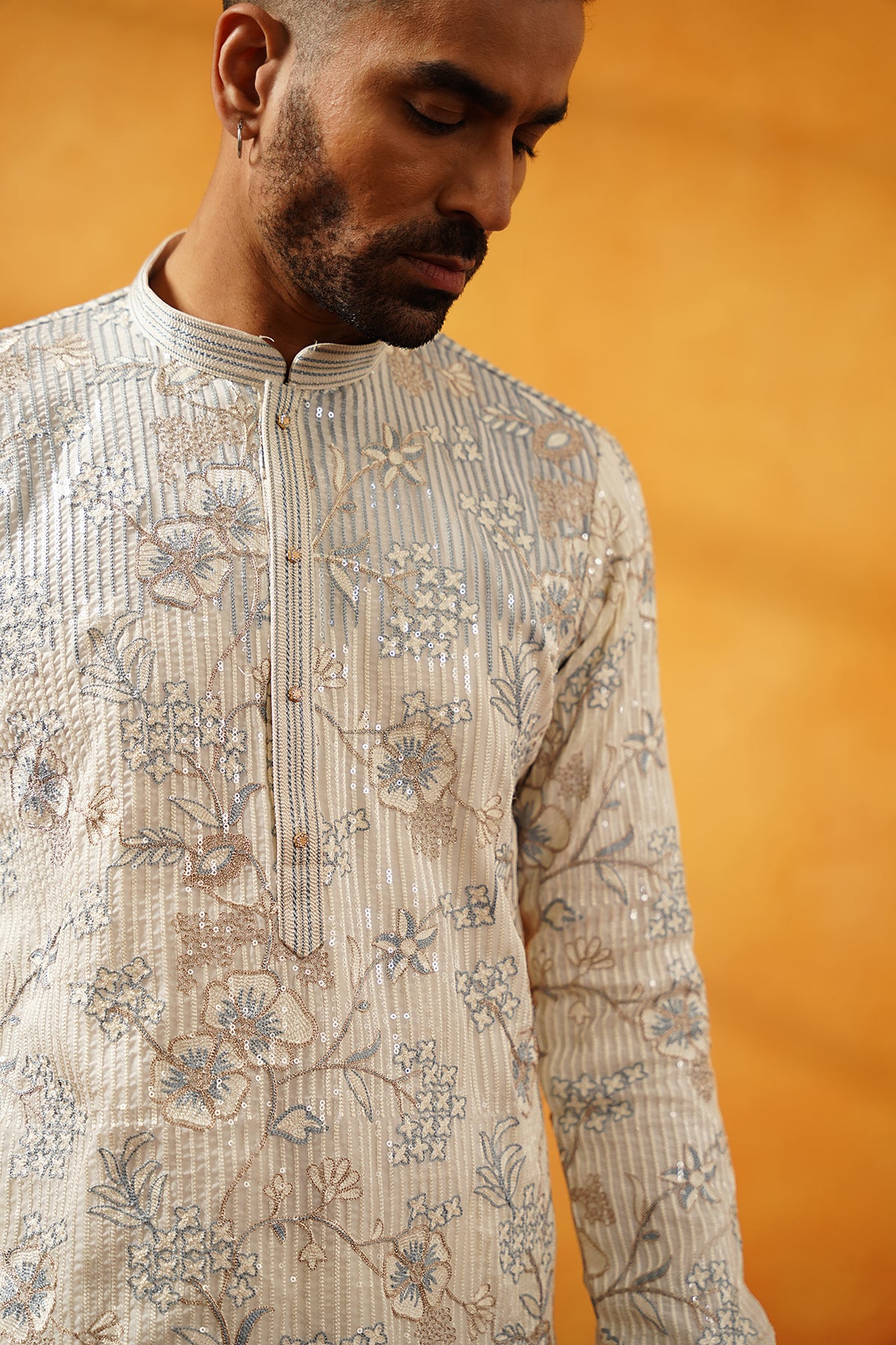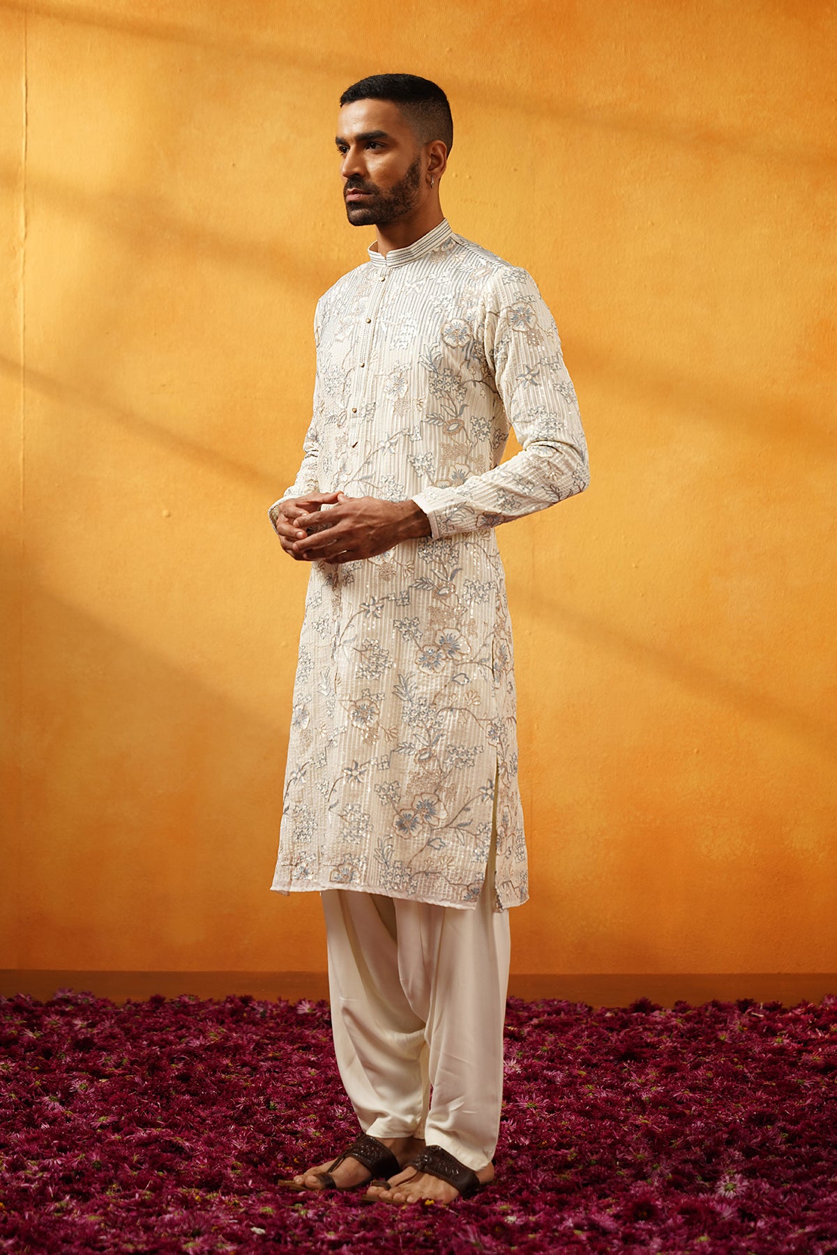 Step into elegance with this men's Off White Georgette Kurta Set. The intricate gold zari and thread work embroidery elevate the festive charm of this kurta, offering a blend of sophistication and tradition. Designed with full sleeves, a mandarin collar, and knee-length straight cut, this set ensures comfort while maintaining a stylish, refined look.
