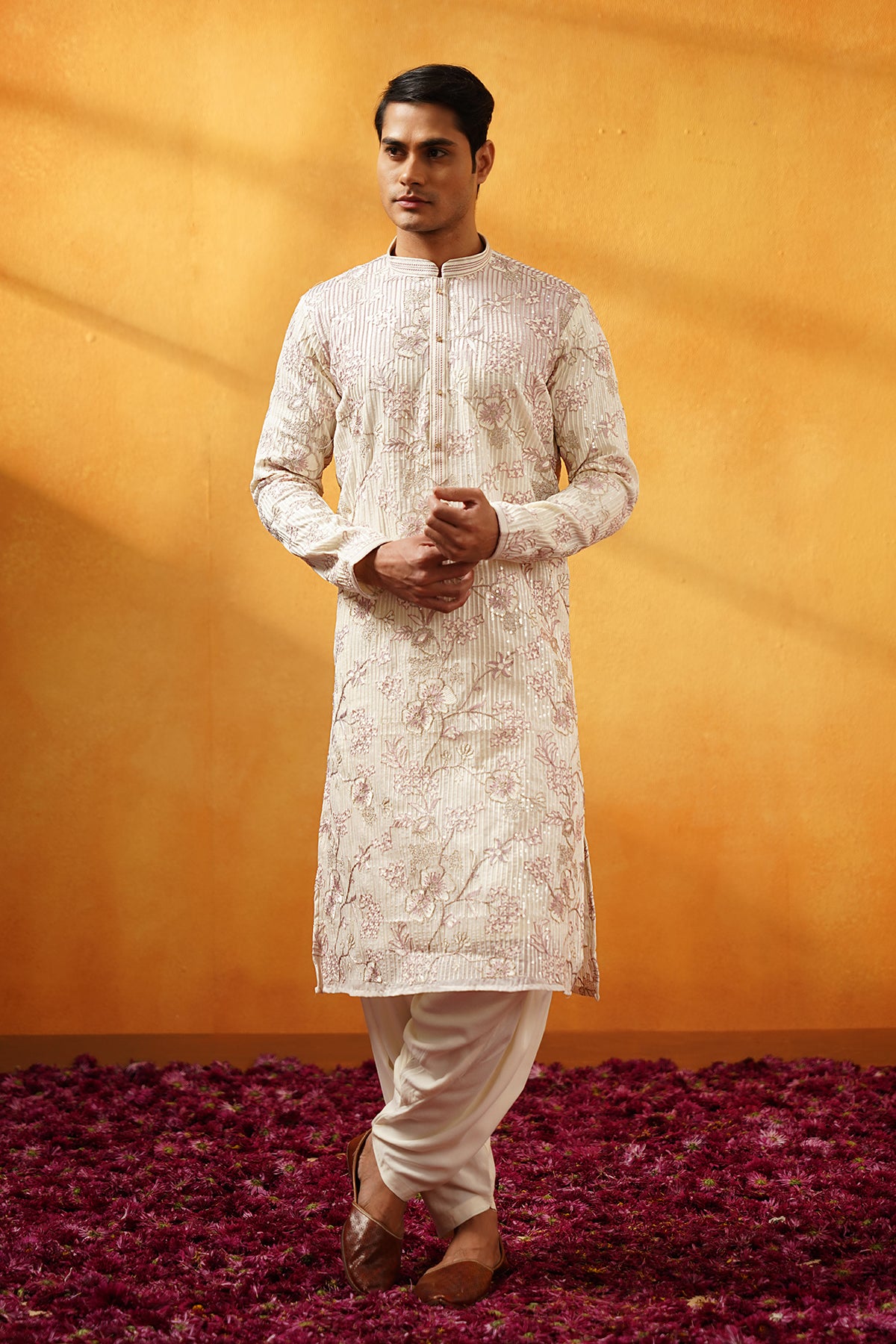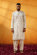 Step into elegance with this men's Off White Georgette Kurta Set. The intricate gold zari and thread work embroidery elevate the festive charm of this kurta, offering a blend of sophistication and tradition. Designed with full sleeves, a mandarin collar, and knee-length straight cut, this set ensures comfort while maintaining a stylish, refined look.