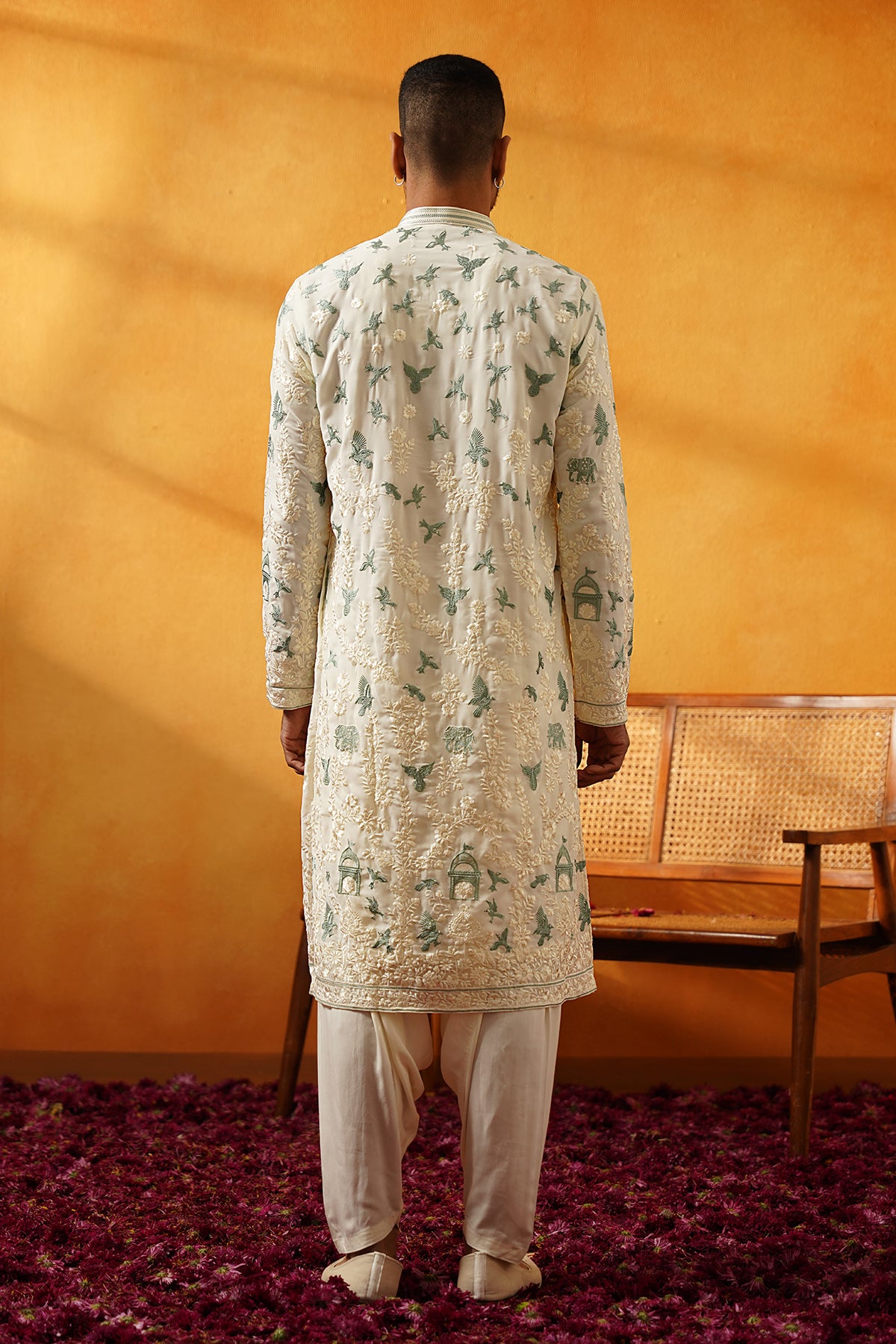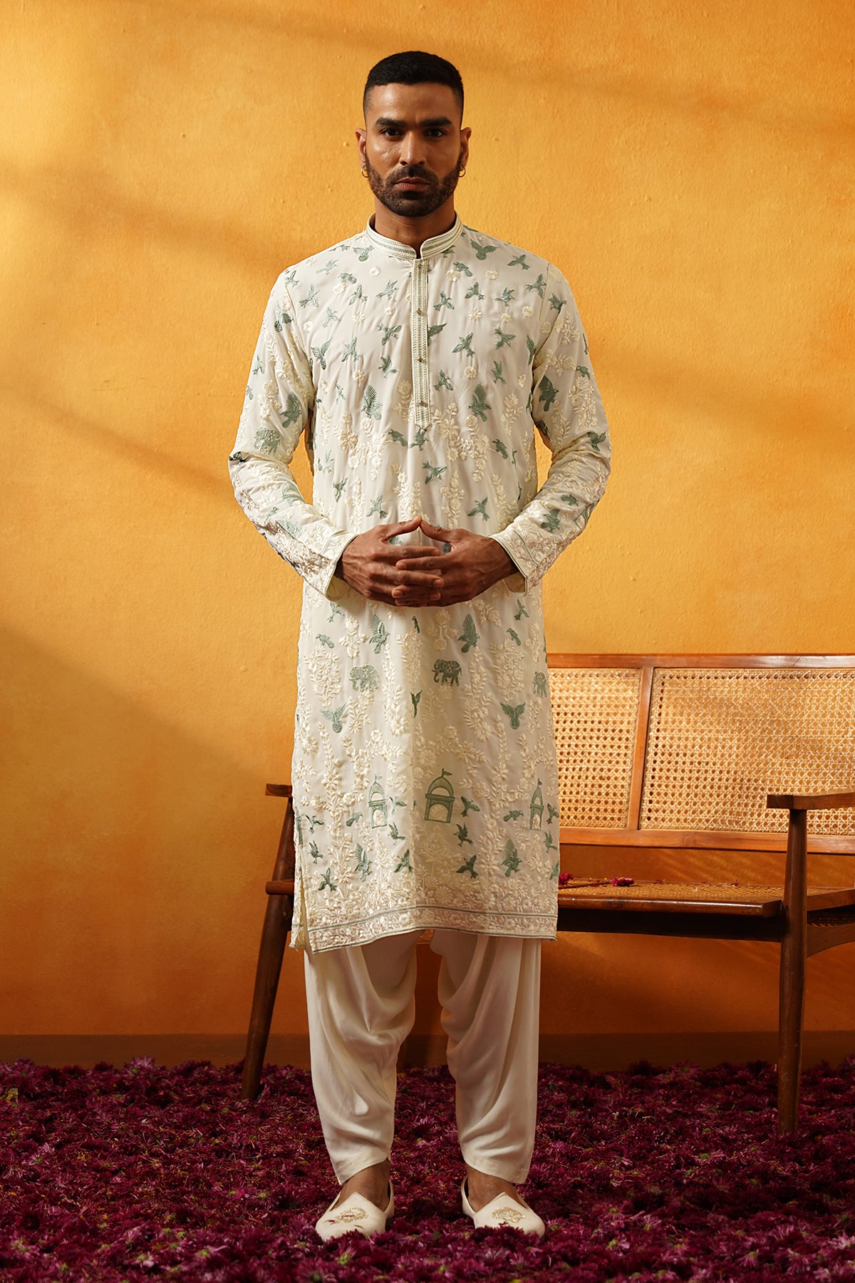 Make a statement with this Off White Georgette Kurta Set, designed with delicate thread work embroidery. This stunning kurta features a mandarin collar and full sleeves, complemented by knee-length styling and side slits for an elegant, comfortable fit. The straight silhouette and refined embroidery make it an ideal choice for any festive occasion.