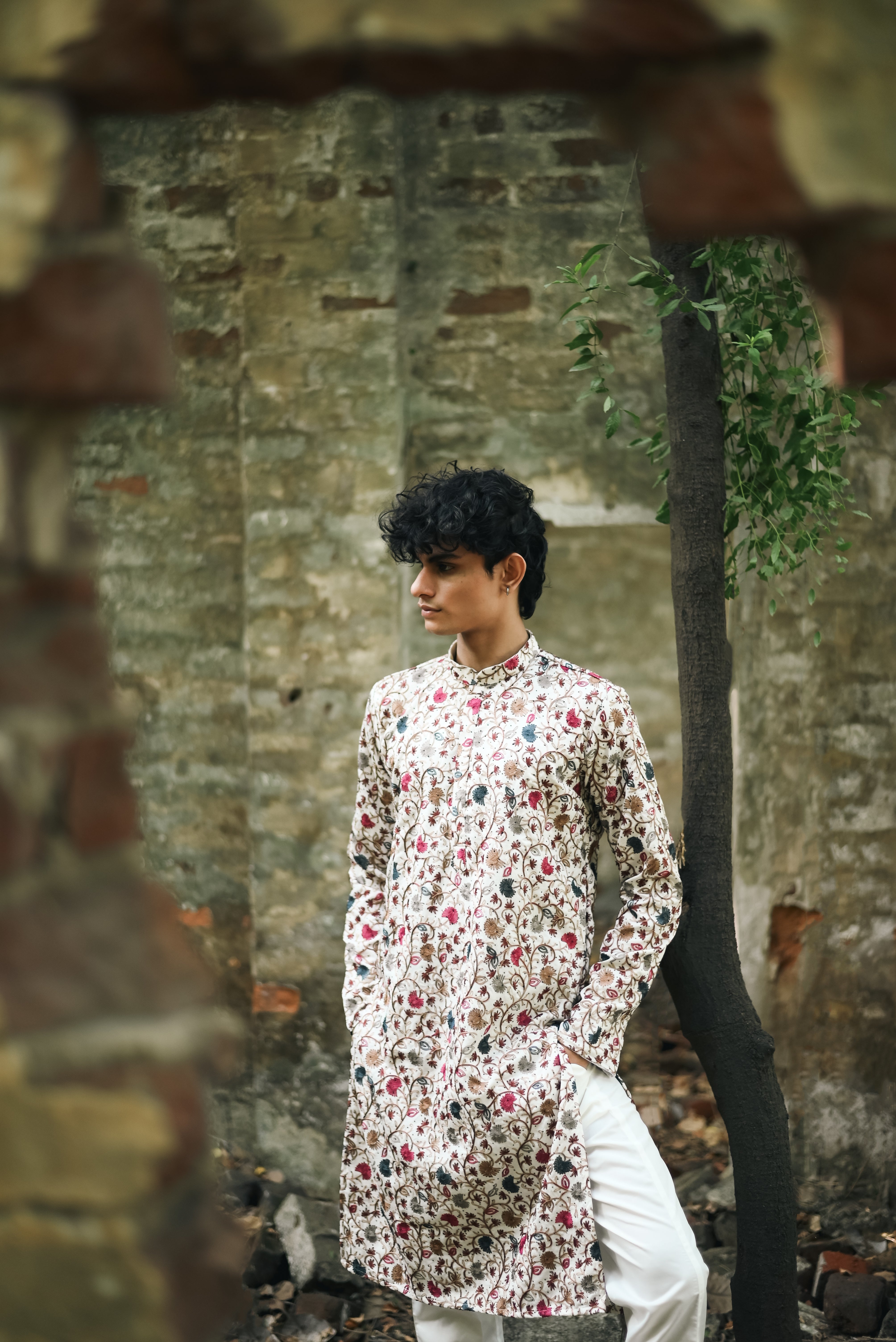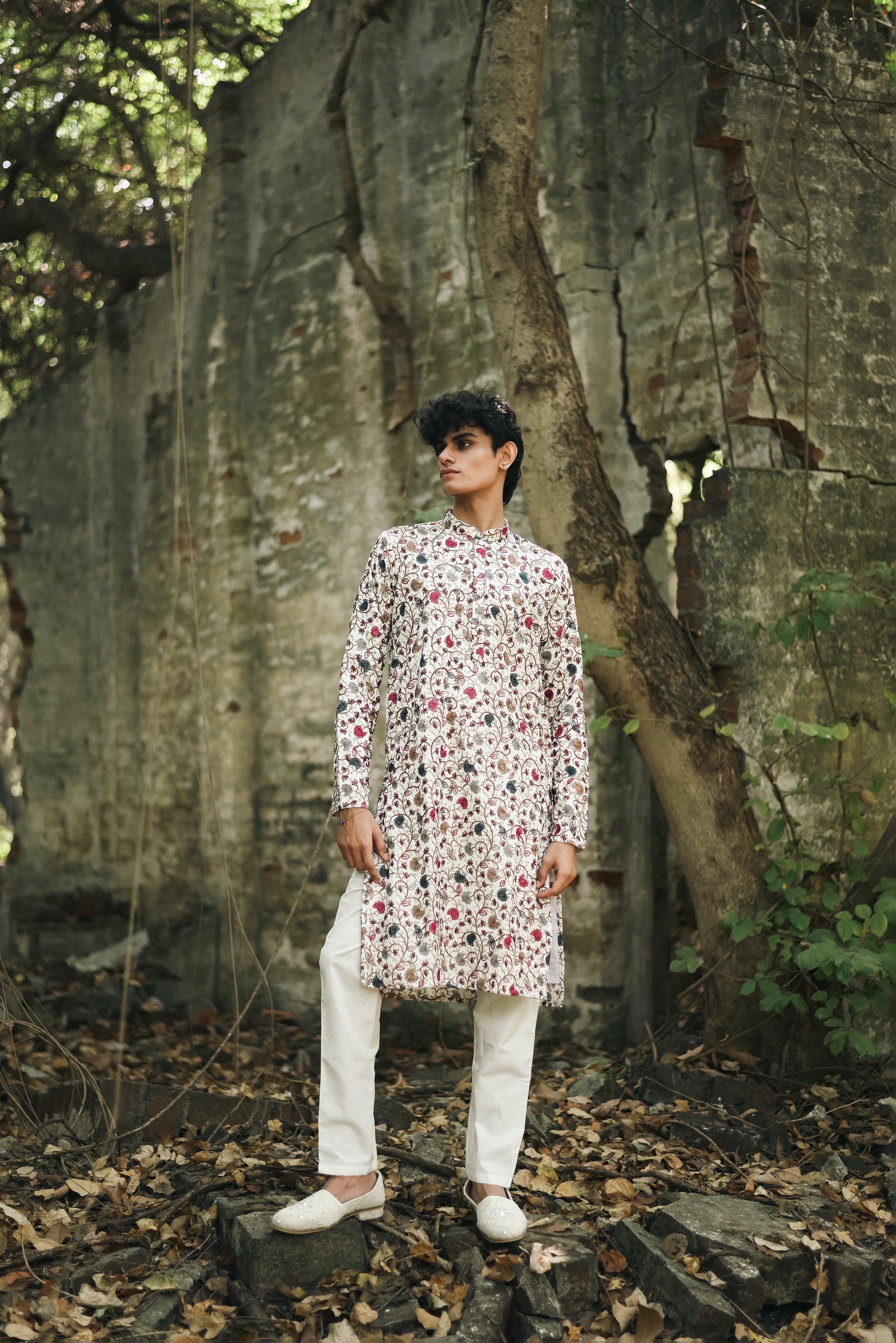 Elevate your festive ensemble with this Men's Off-White Krazy Silk Kurta Set. Designed with multicolour thread work embroidery and adorned with Swarovski stones throughout, this kurta exudes opulence. The mandarin collar, full sleeves, and knee-length design with side slits add a classic touch, while the premium krazy silk fabric ensures comfort and elegance. The set includes a matching straight pant for a complete festive look.