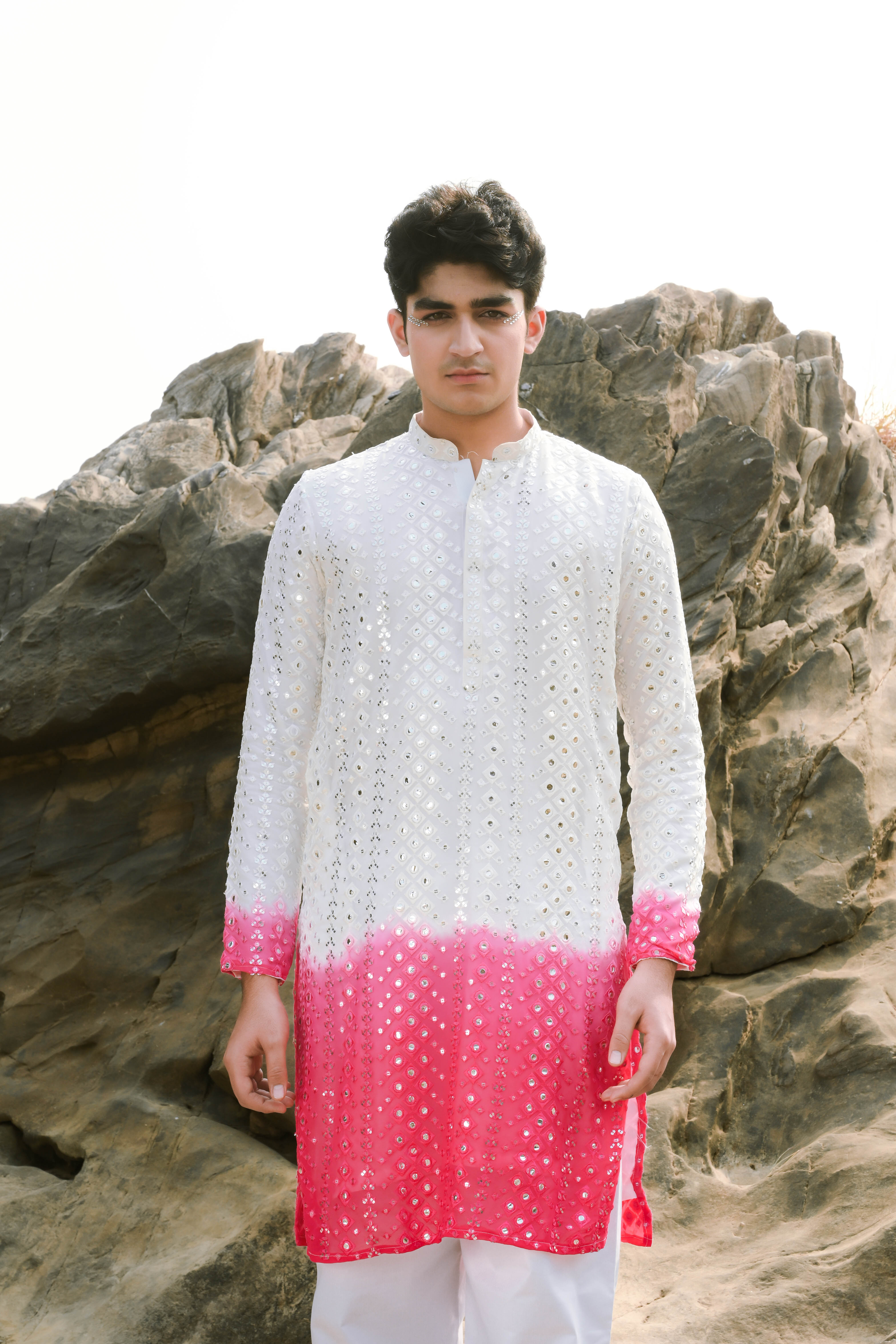 Add a touch of elegance to your festive attire with this Men's Ombre Pink Georgette Kurta Set. Made from luxurious georgette fabric, this kurta features a stunning ombre effect with intricate sequins and mirror work embroidery. Designed with a mandarin collar and full sleeves, the knee-length kurta with side slits combines traditional aesthetics with modern style. Paired with straight pants, this set is an impeccable choice for festive celebrations.