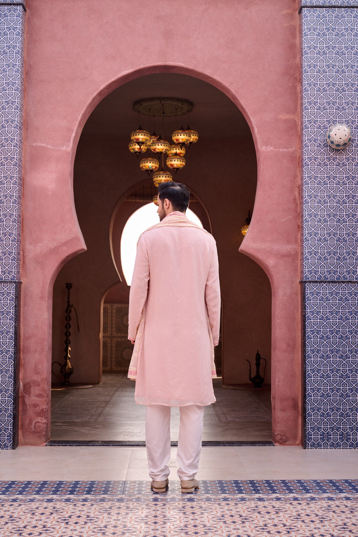 Embrace timeless elegance with this Men's Pastel Pink Georgette Kurta Set. The soft georgette fabric is beautifully embroidered with delicate thread work, creating a perfect balance of traditional charm and modern style. The V-neck mandarin collar and full sleeves add a refined touch, while the knee-length design with side slits ensures both comfort and grace. Paired with a matching straight pant and a thread work dupatta, this ensemble is ideal for festive events.