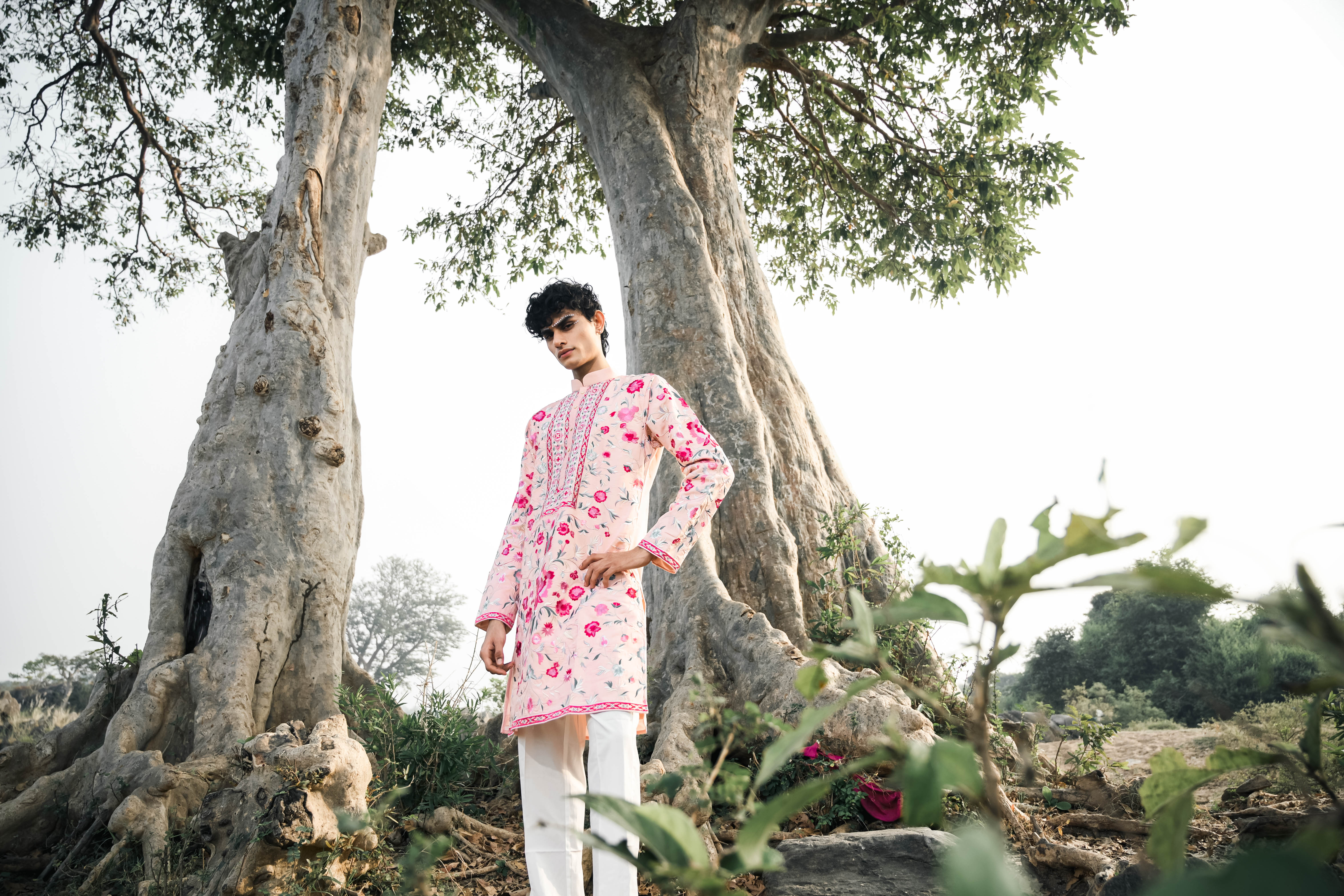 Elevate your festive wardrobe with this Men's Peach Fendi Kurta Set. Crafted from premium Fendi fabric, this kurta showcases intricate threadwork embroidery, adding a refined elegance to its design. Featuring a mandarin collar and full sleeves, the knee-length kurta with side slits offers both style and comfort. Paired with straight pants, this set is an ideal choice for festive occasions.