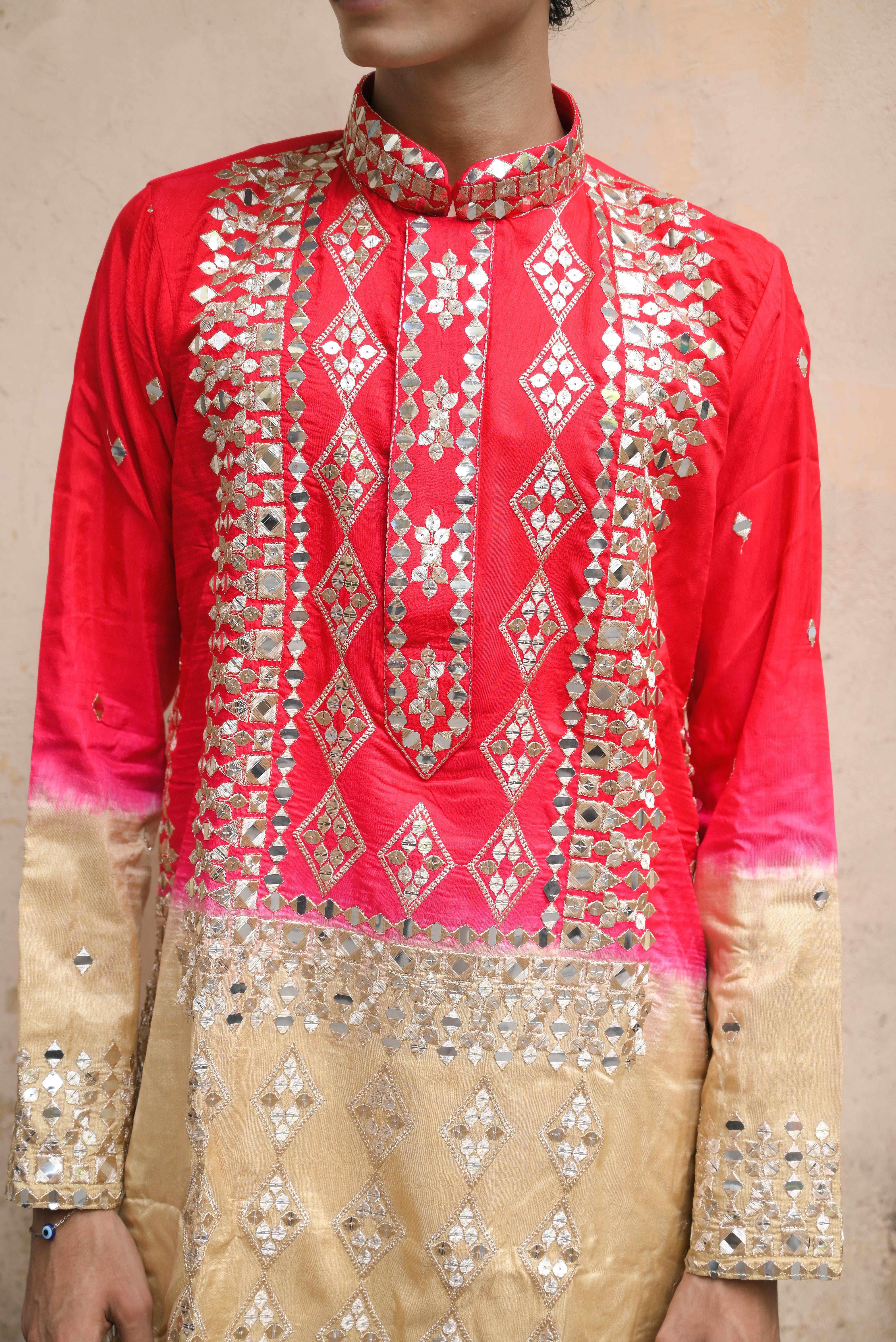 Enhance your festive wardrobe with this Men's Pink and Beige Silk Kurta Set, featuring intricate mirror and gold zari threadwork embroidery. Crafted from luxurious silk, the kurta boasts full sleeves and a classic mandarin collar, offering a traditional yet stylish look. The knee-length design with side slits provides comfort and elegance, while the shimmering mirror and zari embroidery elevates the overall appeal. Perfect for festive occasions, this set is completed with straight pants for a refined ensemble.