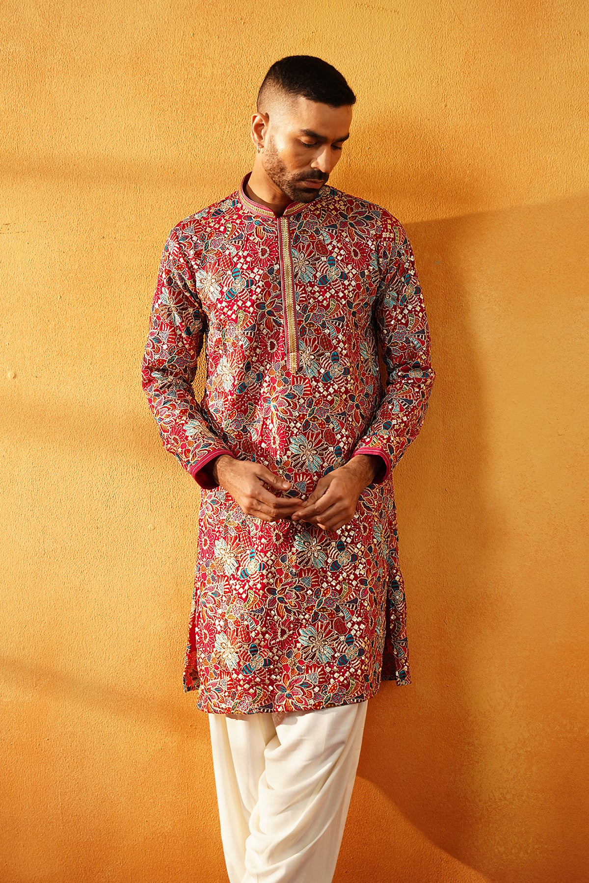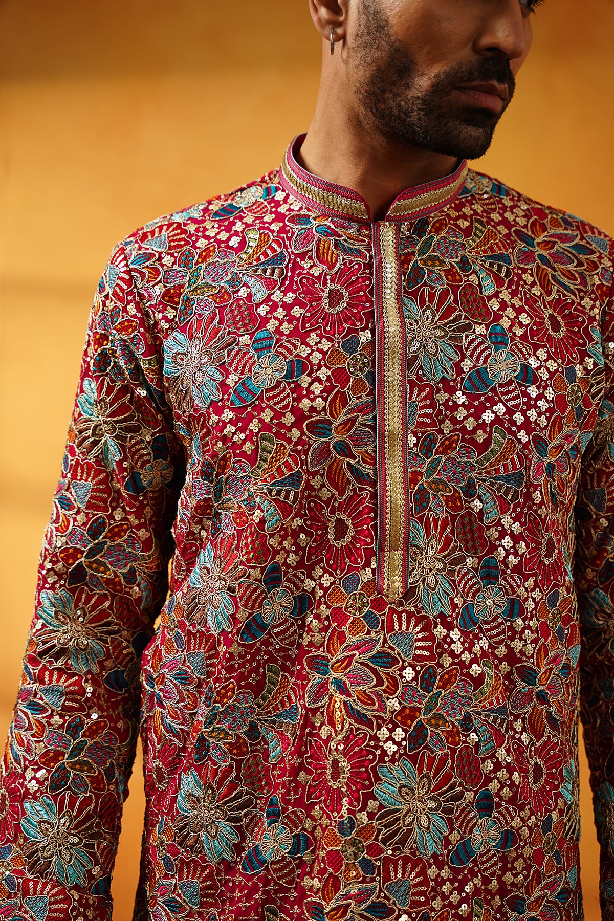 Enhance your festive wardrobe with this men's Pink Georgette Kurta Set. Meticulously crafted from premium georgette fabric, this kurta features intricate zari and multicolour thread work embroidery, adding a touch of elegance and vibrance. Designed with a mandarin collar, full sleeves, and a knee-length straight silhouette with side slits, this ensemble is perfect for festive celebrations.
