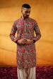 Enhance your festive wardrobe with this men's Kurta Set. Meticulously crafted from premium georgette fabric, this kurta features intricate zari and multicolour thread work embroidery, adding a touch of elegance and vibrance. Designed with a mandarin collar, full sleeves, and a knee-length straight silhouette with side slits, this ensemble is perfect for festive celebrations.