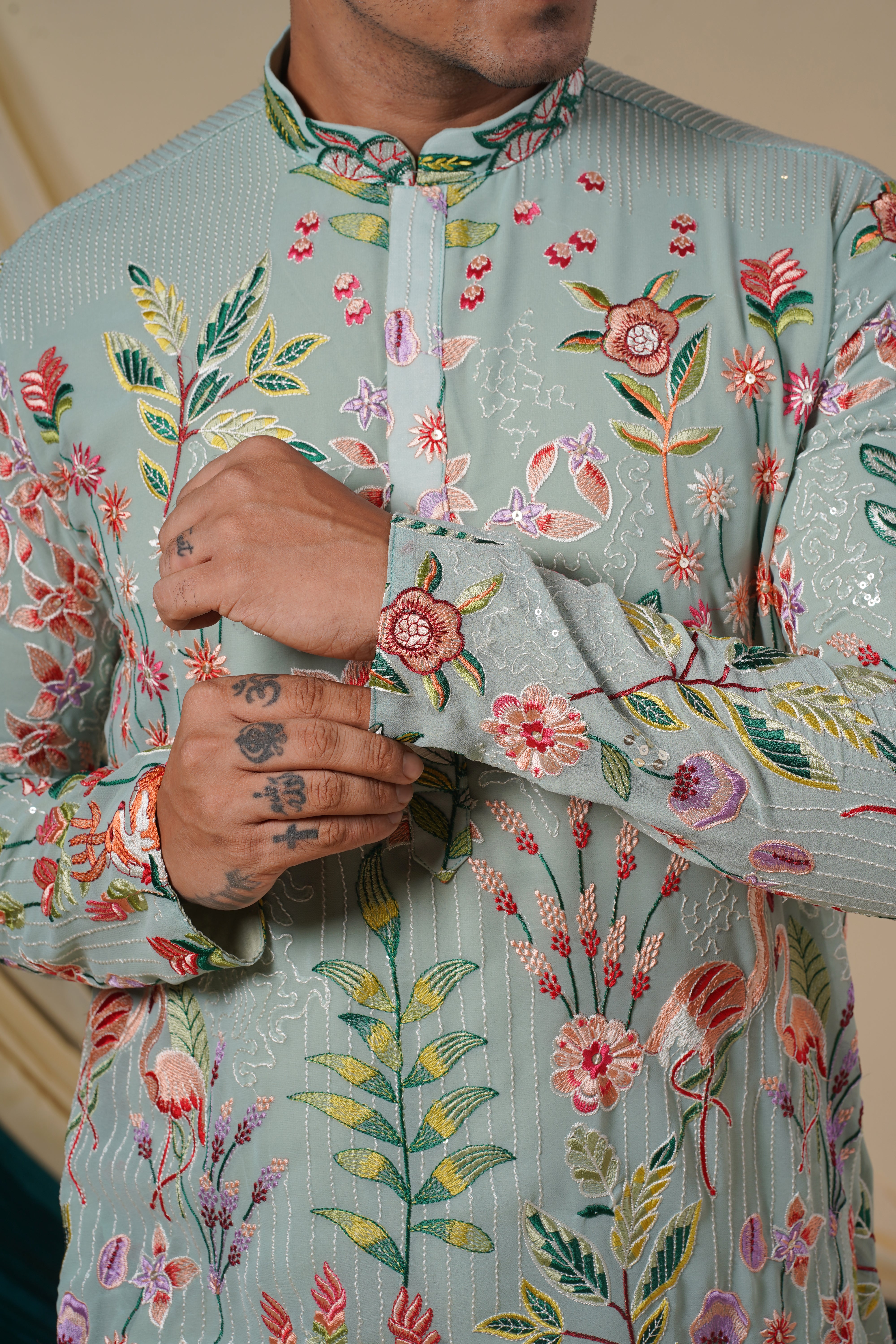 Elevate your festive wardrobe with this Men's Pista Green Georgette Kurta, featuring intricate multicolour threadwork and floral embroidery. This kurta boasts a mandarin collar and full sleeves, offering a sophisticated and elegant look. The luxurious georgette fabric and exquisite detailing make it a perfect choice for any special occasion.
