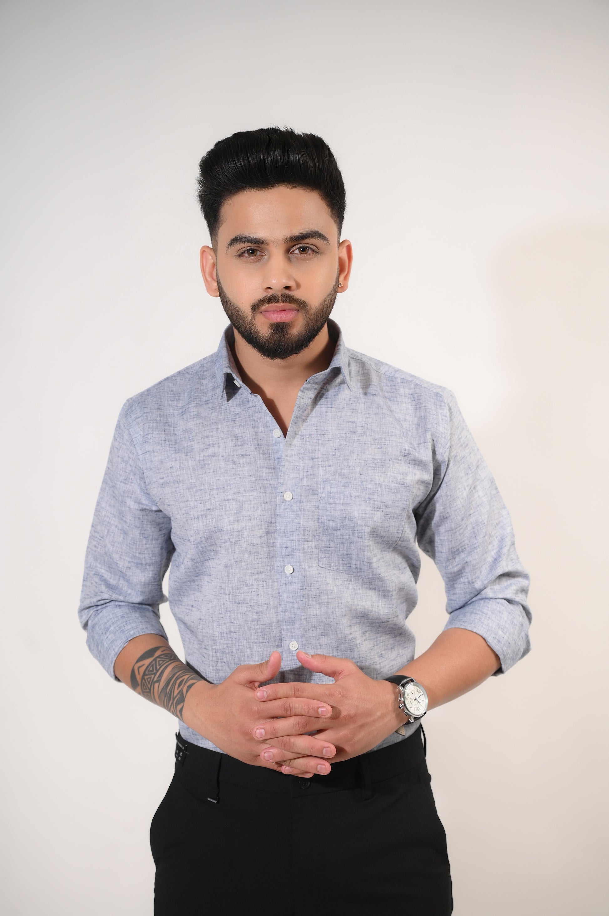 Make a bold and stylish statement with this Men’s Grey Texture Linen Plain Slim Fit Shirt from Rochaldas Sons. Crafted from premium texture linen plain fabric, this shirt features a tactile, breathable finish that adds a luxurious touch to your overall look. The rich grey shade brings depth and elegance, making it an ideal choice for parties, festive occasions, and special evening events. Designed with long sleeves with buttoned cuffs, a classic spread collar, and a modern slim-fit silhouette, it delivers a sharp and confident appearance. Pair it with black or charcoal trousers for a striking and polished ensemble.