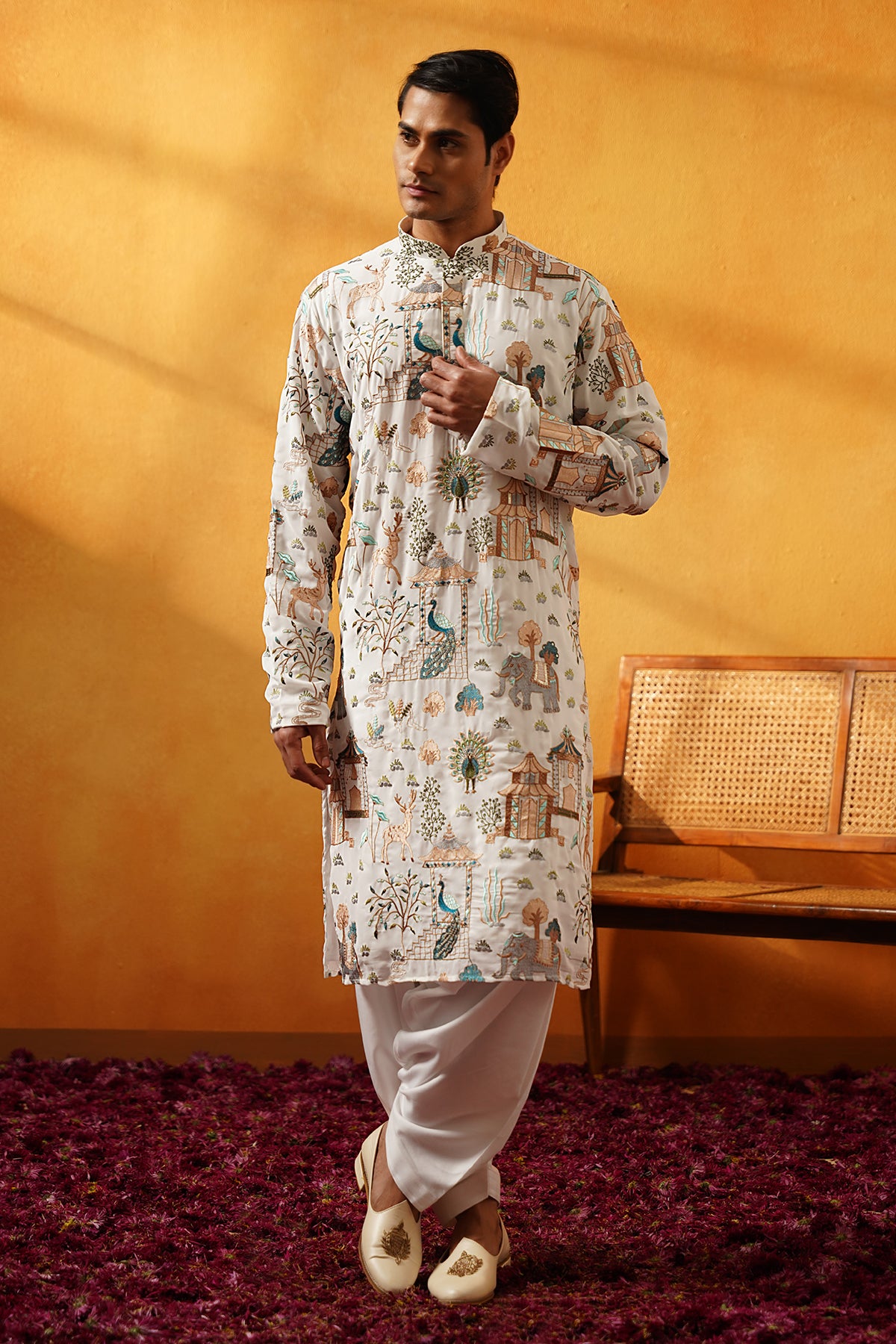 Elevate your festive wardrobe with this White Georgette Kurta Set, beautifully crafted with intricate multicolour threadwork embroidery. Designed with a mandarin collar and full sleeves, this knee-length kurta features side slits for ease and style. Its straight fit ensures comfort while exuding sophistication, making it a perfect choice for festive celebrations.