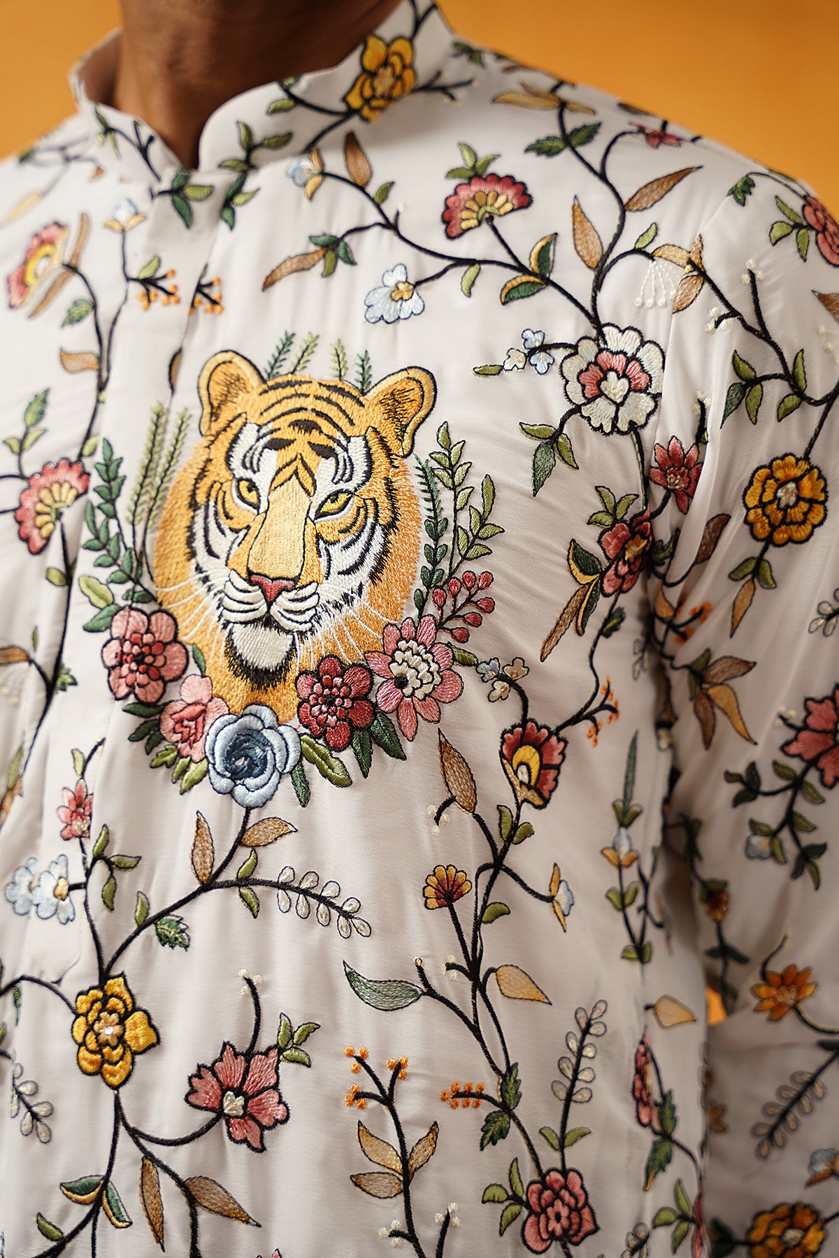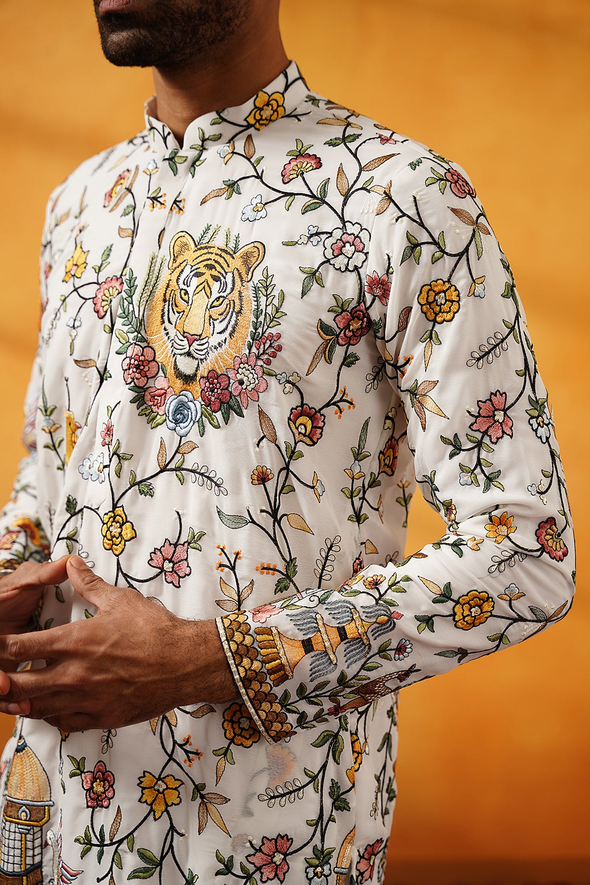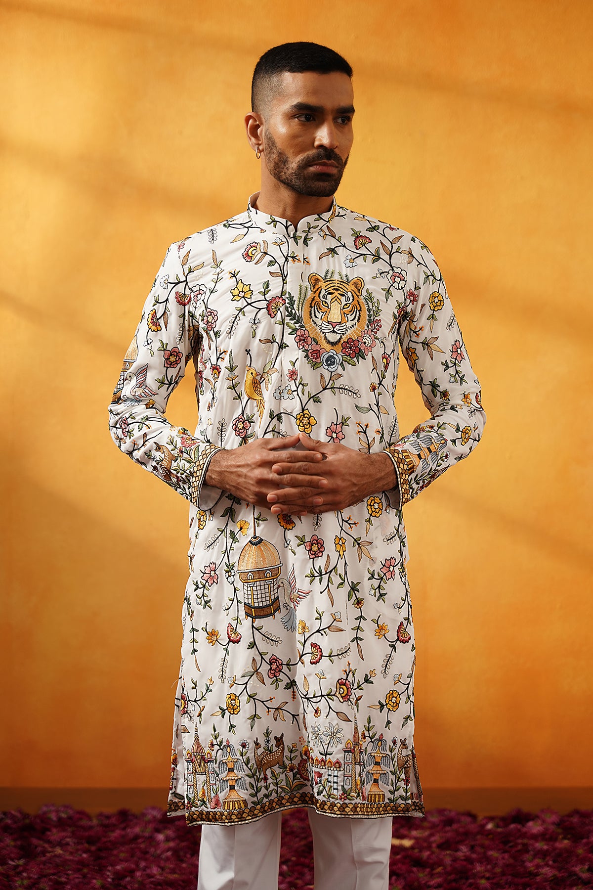 Elevate your festive style with this White Georgette Kurta Set. Adorned with multicolour threadwork embroidery, this kurta offers a vibrant and elegant appeal. Designed with a mandarin collar and full sleeves, the knee-length cut with side slits provides a perfect blend of comfort and sophistication. Its straight silhouette makes it an ideal choice for festive occasions.