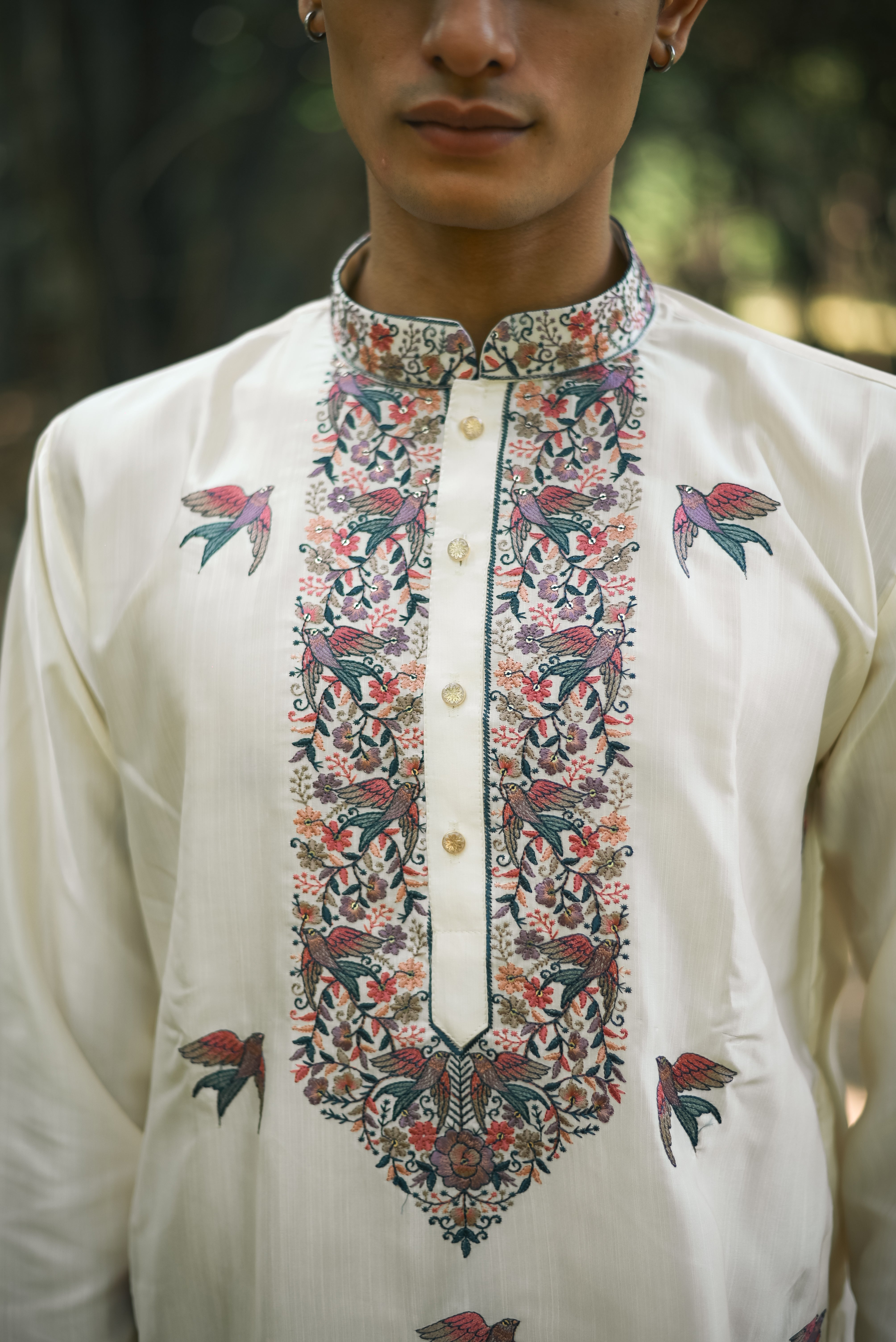 Refine your festive wardrobe with this Men's White Kenzo Kurta Set, showcasing intricate thread work embroidery. The mandarin collar, full sleeves, and knee-length design with side slits offer a timeless yet contemporary appeal. Crafted from premium Kenzo fabric, it provides a perfect balance of comfort and sophistication, paired with a matching straight pant for a cohesive look.