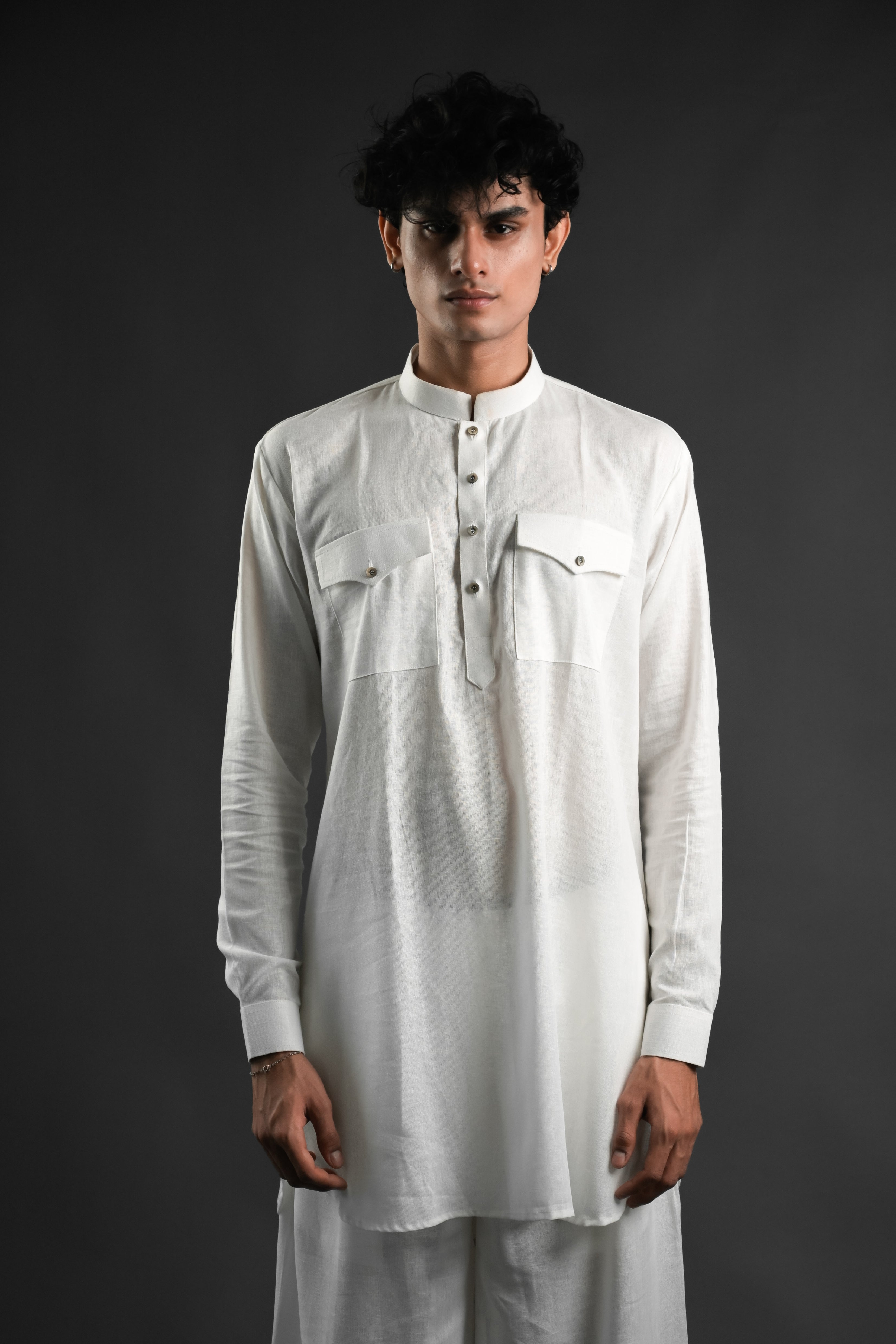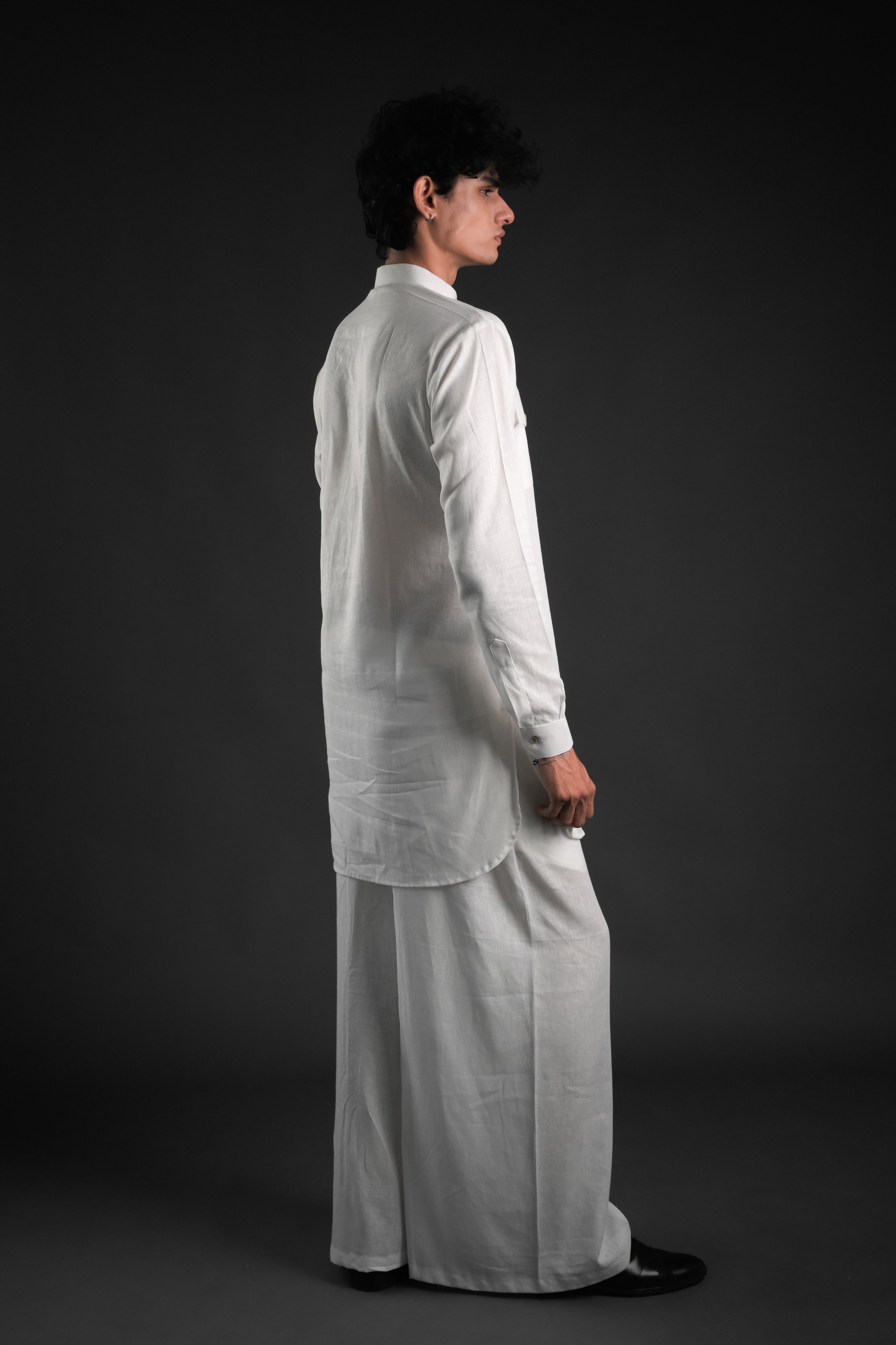 Elevate your ethnic style with the White Linen Blend Pathani Kurta Set, a perfect blend of tradition and modernity. Crafted from premium linen, this ensemble features a classic Pathani kurta paired with flared pants, making it an ideal choice for family gatherings, wedding functions, or casual evening lounging. The mandarin collar and above-knee length add a contemporary touch, while the side slits and curved hem ensure comfort and elegance.