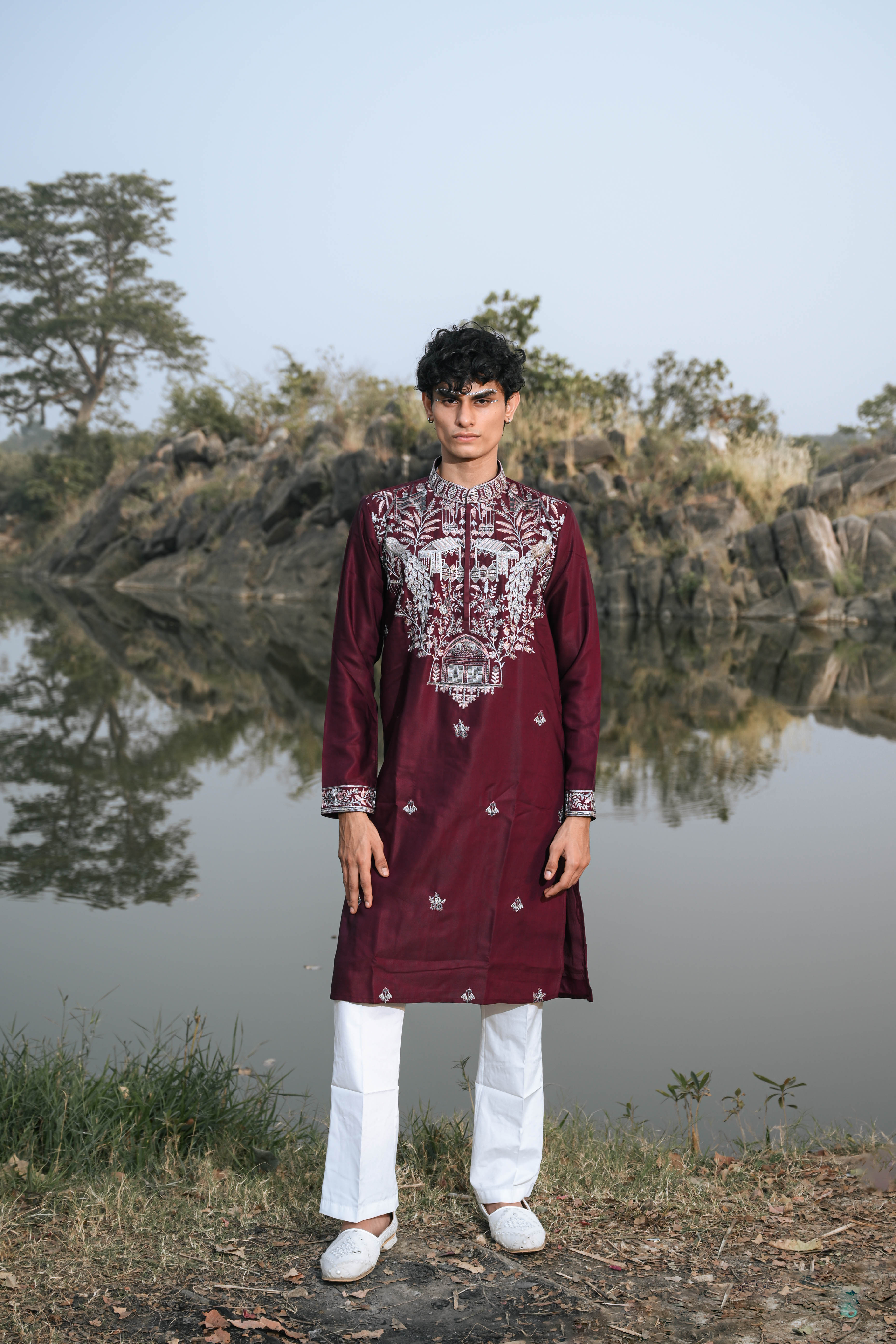 Elevate your festive look with this Men's Wine Kenzo Kurta Set. Made from luxurious Kenzo fabric, this kurta showcases exquisite threadwork embroidery that adds a touch of sophistication. The mandarin collar, full sleeves, and knee-length design with side slits ensure both comfort and style. Paired with a matching straight pant, this outfit is a perfect choice for festive celebrations.